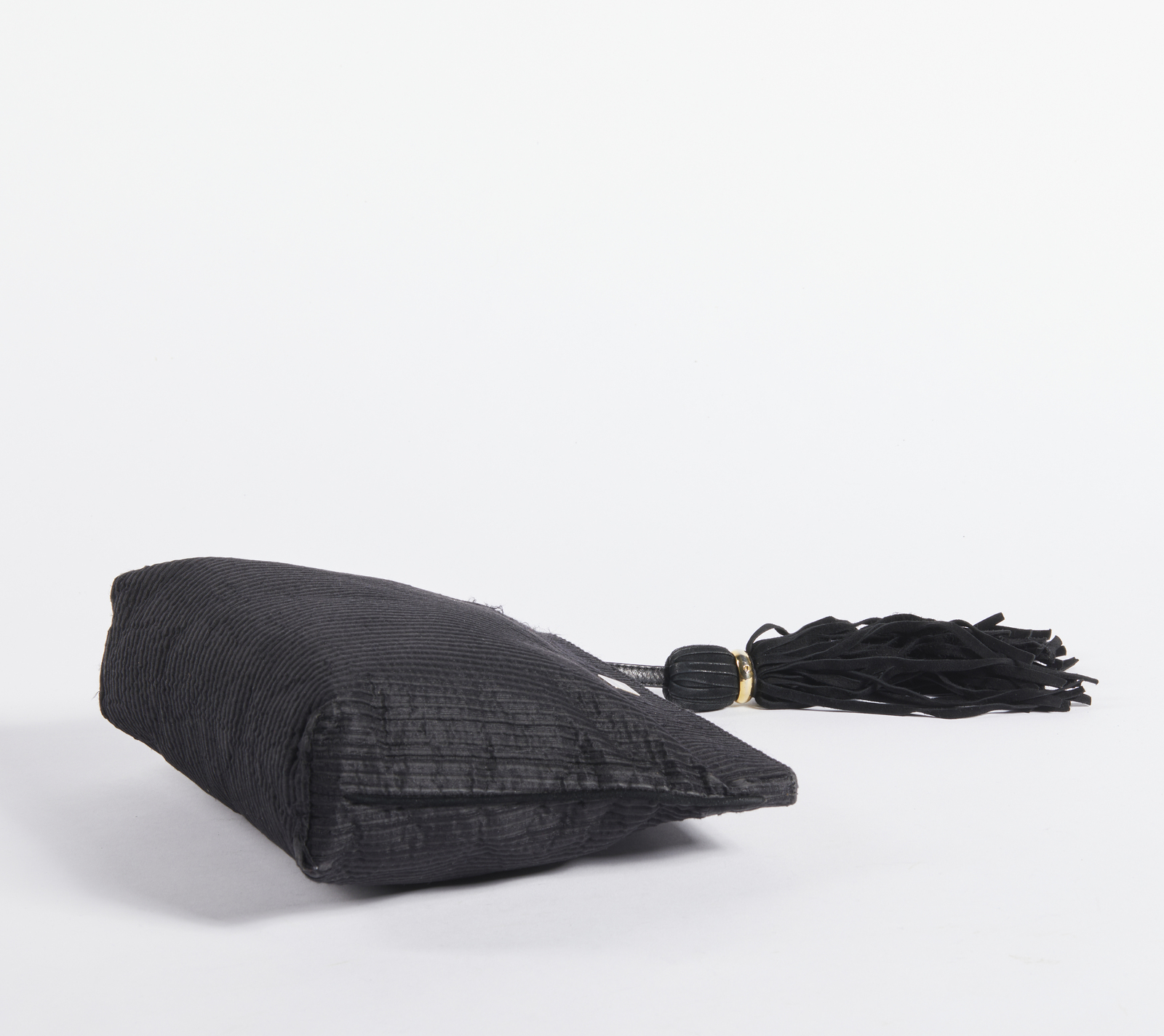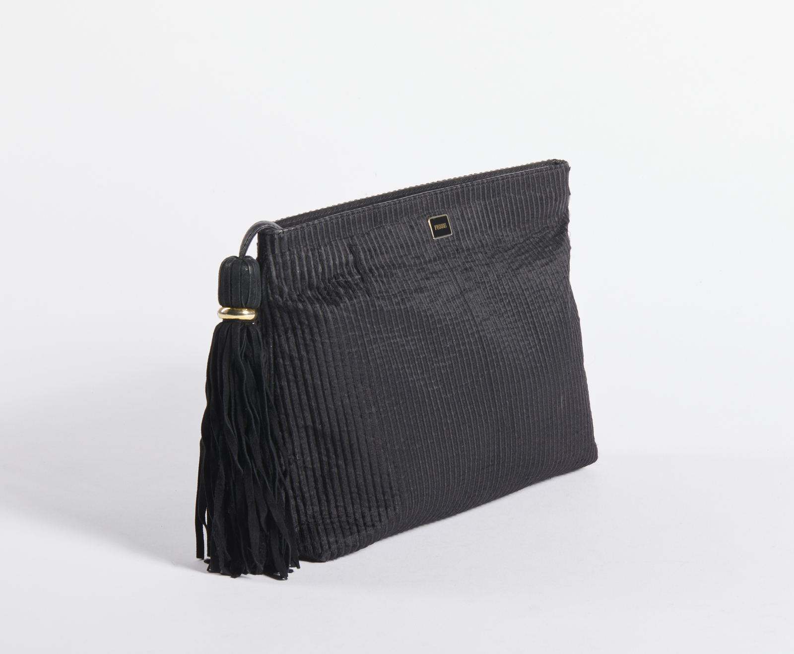 FERRE' GIANFRANCO (1944 - 2007) Pochette in tessuto nero morbido. Tessuto e pelle. Cm 31,00 x 23,00 x 6,00. Pochette in tessuto nero morbido con logo, chiusura a zip e nappa a frange in tessuto. Interno in tessuto monogram con targhetta logata numerata color oro e chiusura con zip.