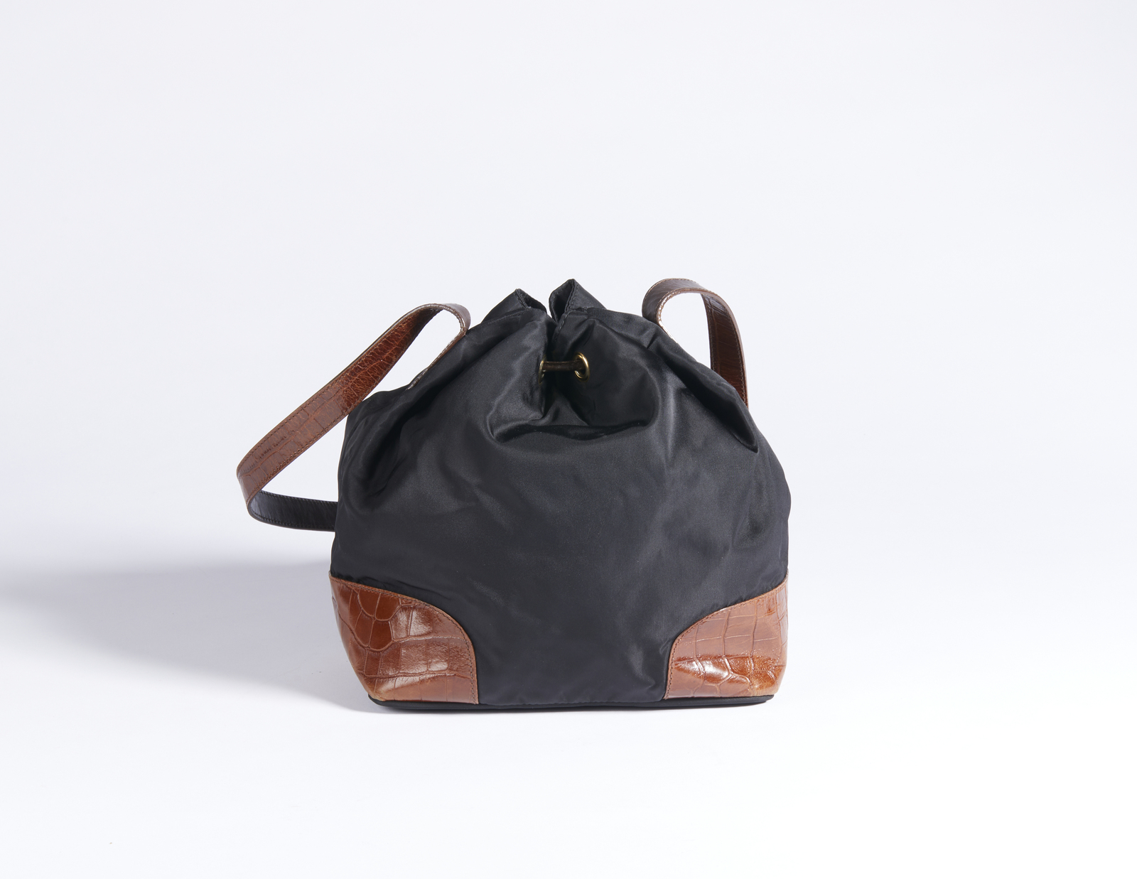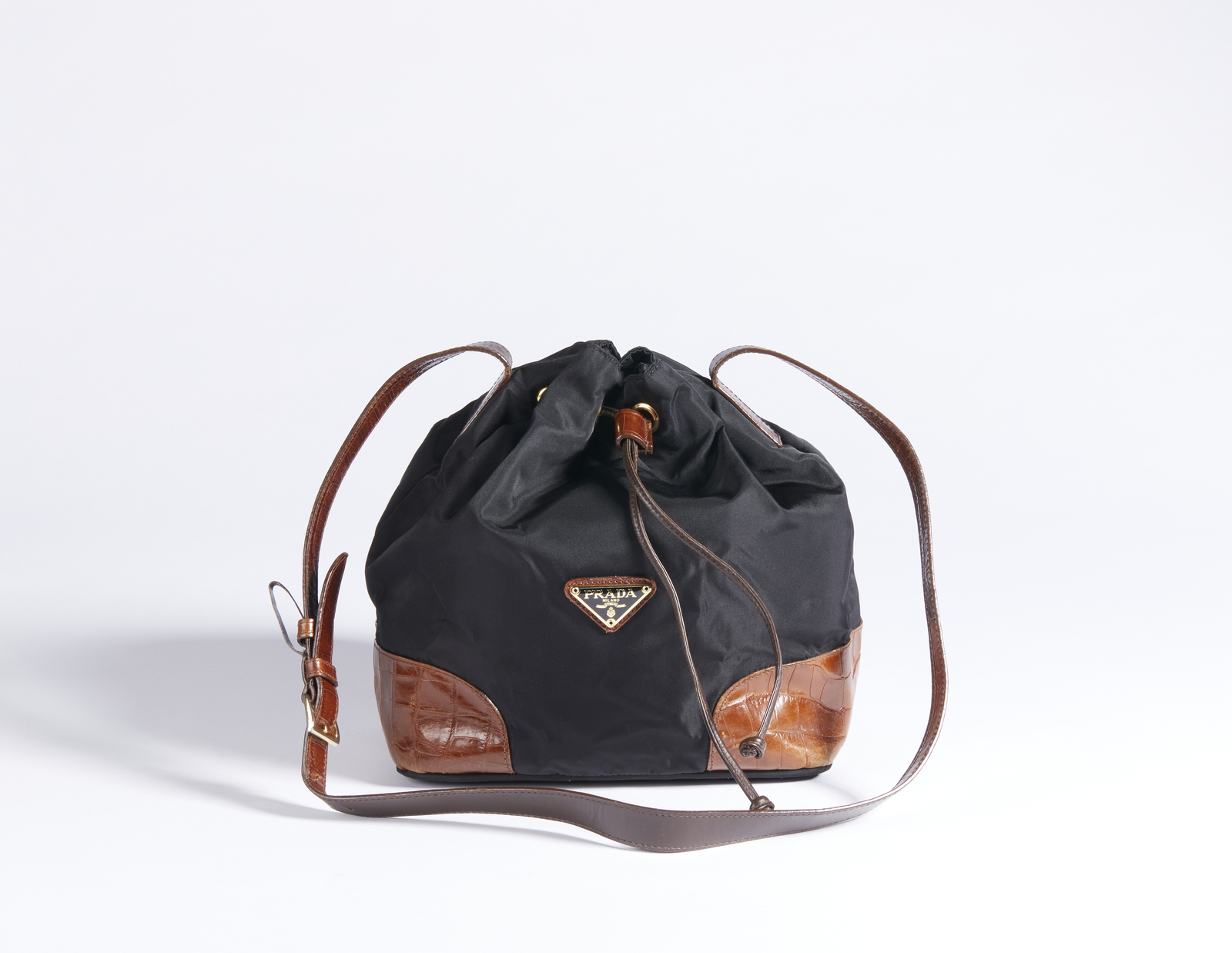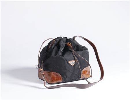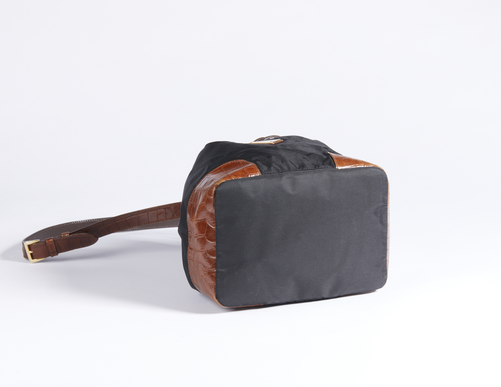 PRADA MILANO Borsa a tracolla Prada . Tessuto tecno. Cm 15,00 x 25,00. Borsa a secchiello di Prada in tessuto city con inserti in pelle a stampa coccodrillo marrone, logo al fronte, logo interno, fodera in tessuto monogram.