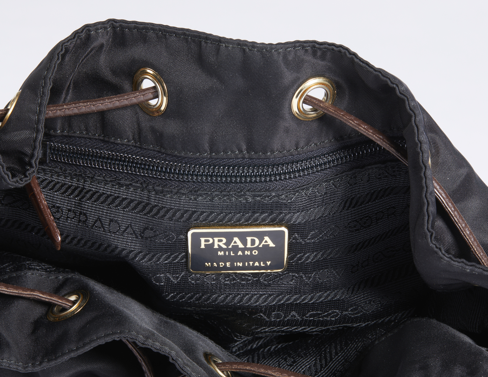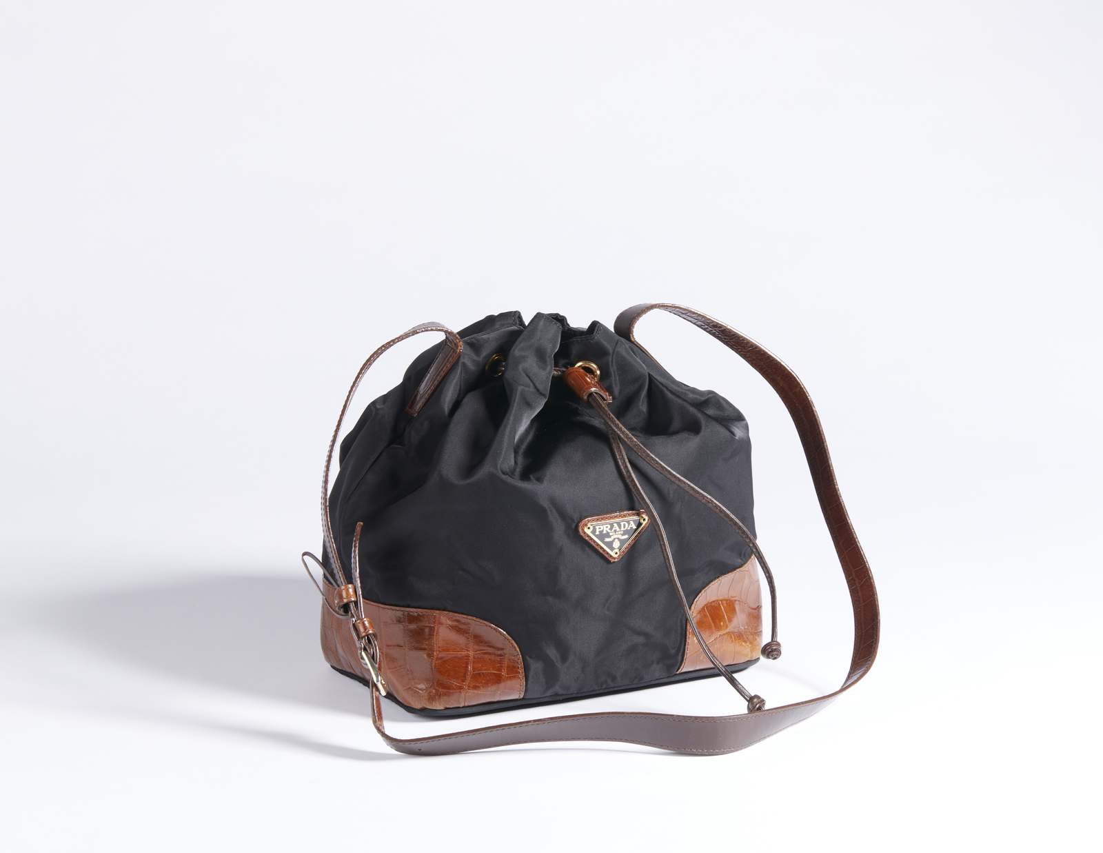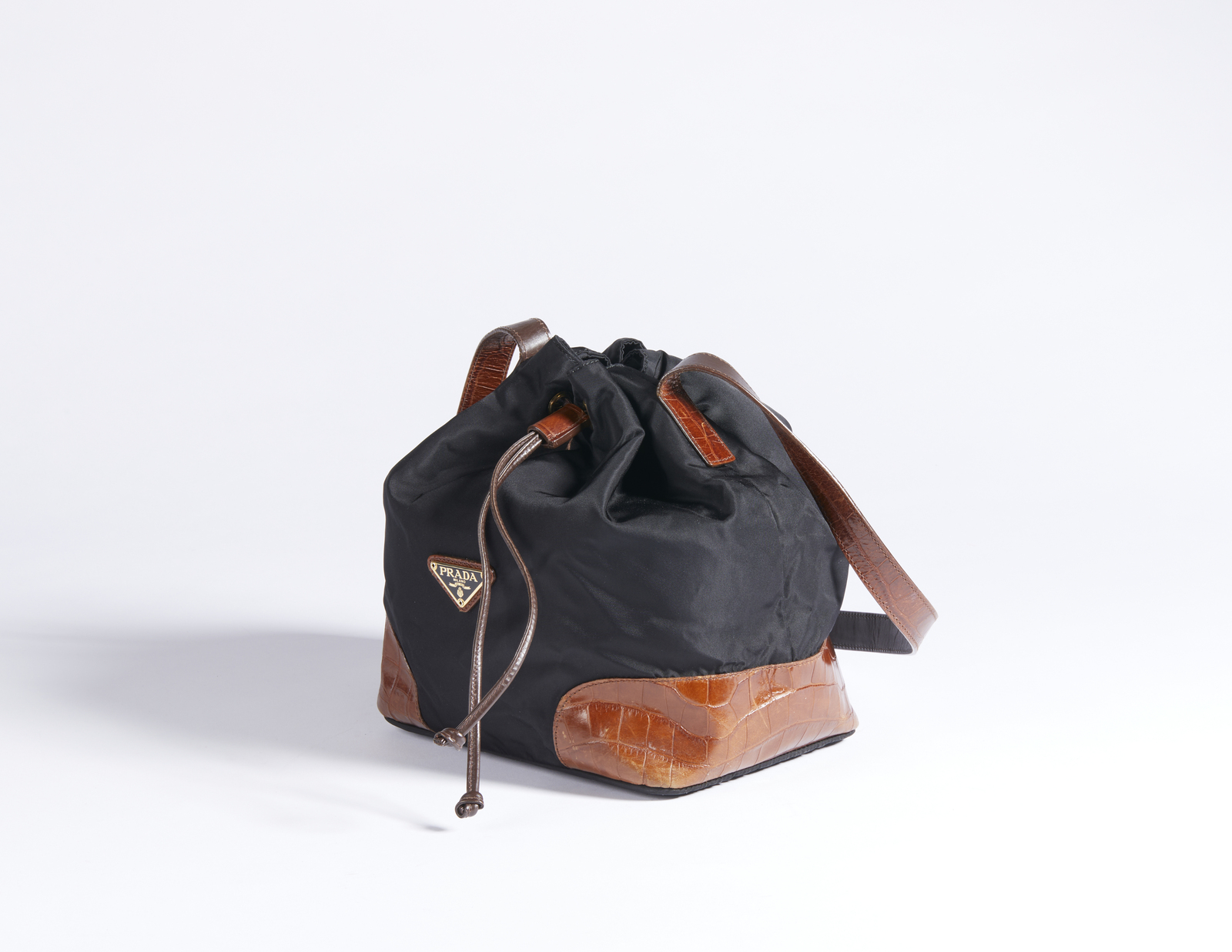 PRADA MILANO Borsa a tracolla Prada . Tessuto tecno. Cm 15,00 x 25,00. Borsa a secchiello di Prada in tessuto city con inserti in pelle a stampa coccodrillo marrone, logo al fronte, logo interno, fodera in tessuto monogram.