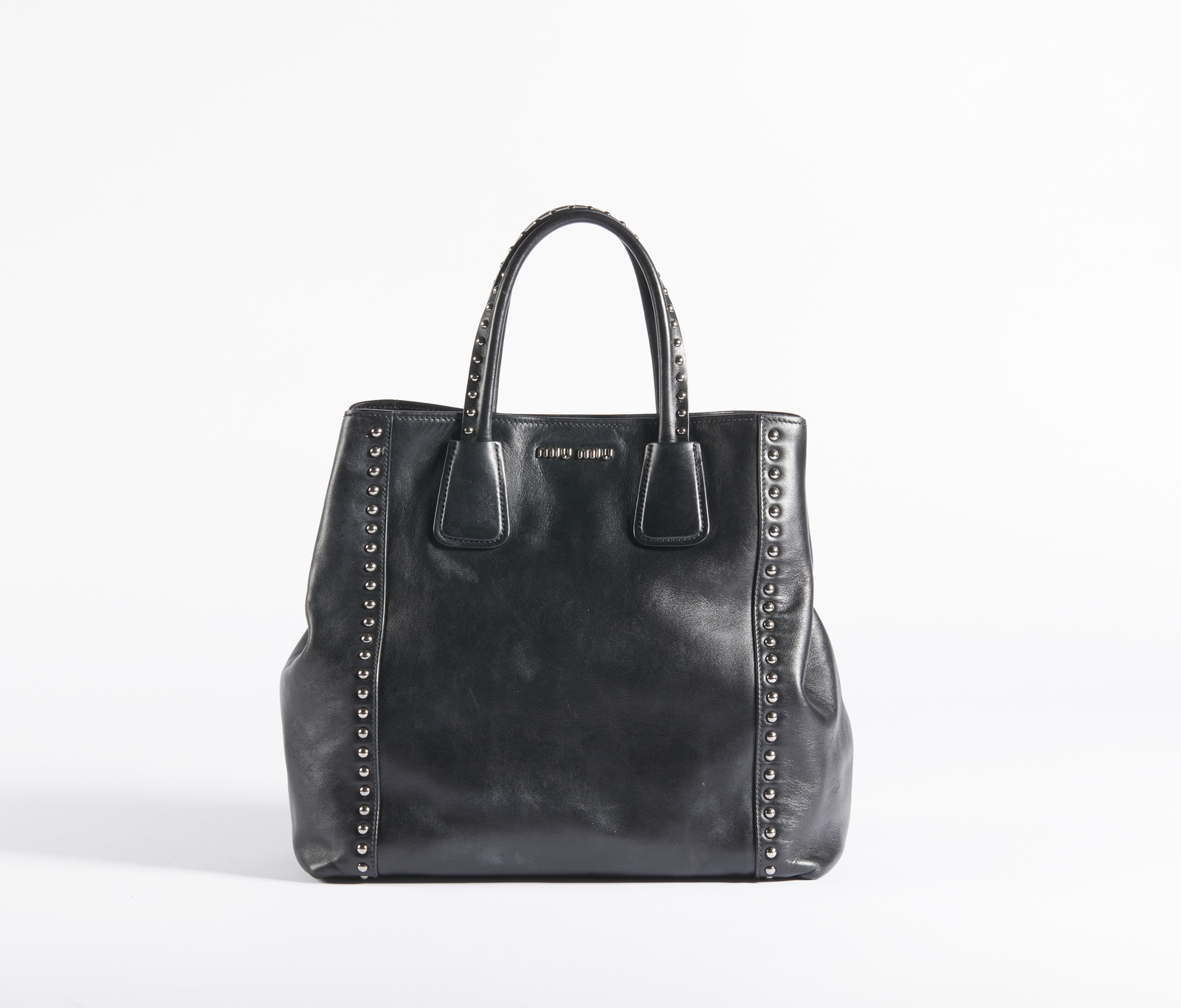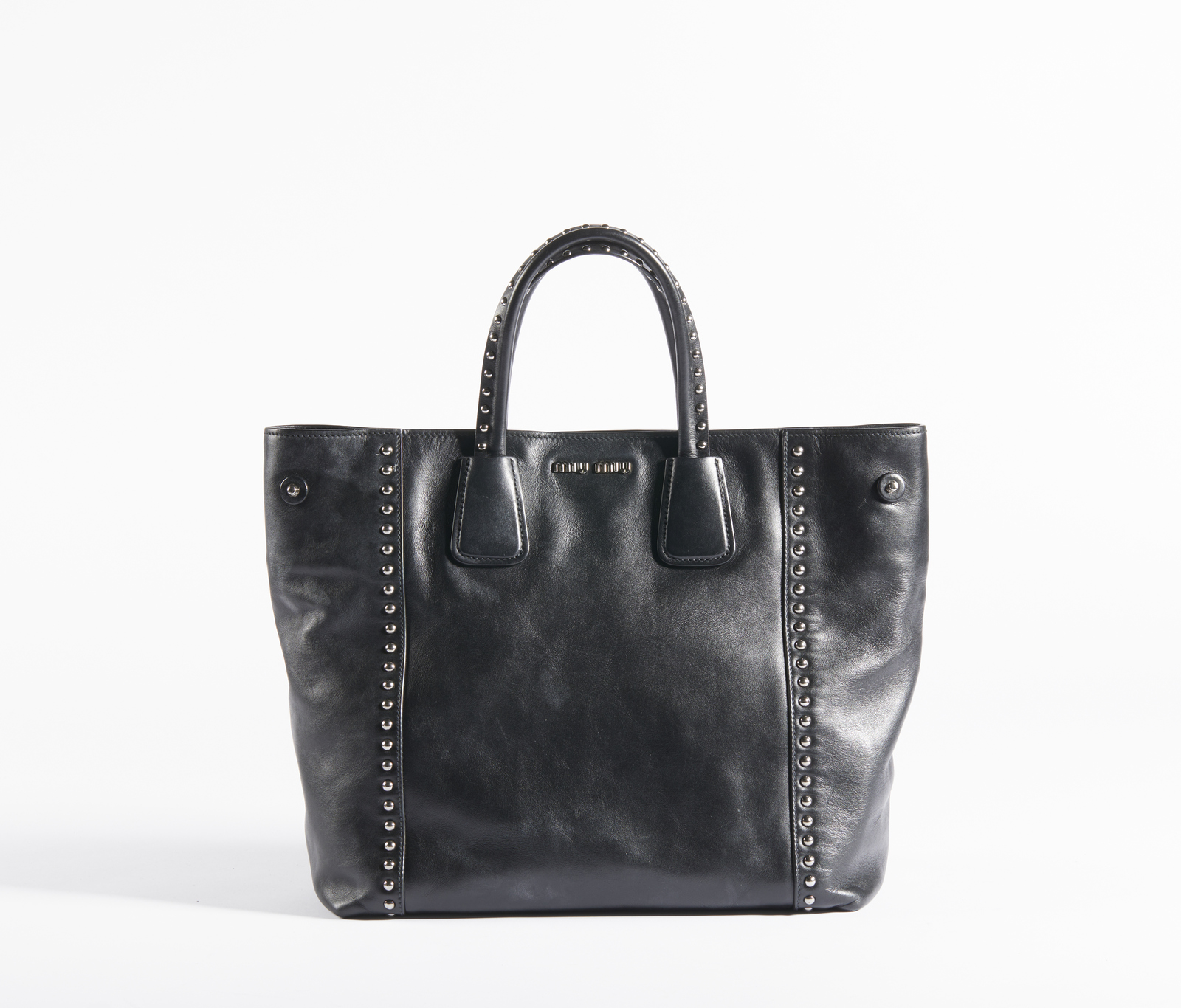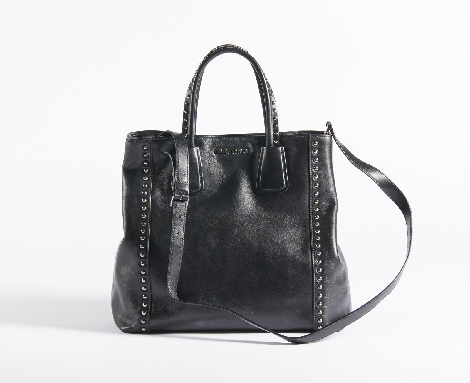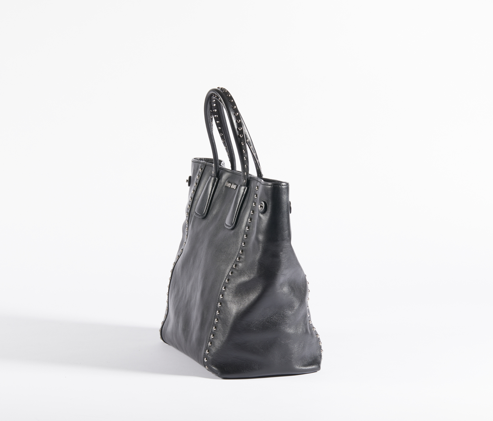 MIU MIU Borsa in pelle nera. Pelle. Cm 33,00 x 30,00 x 13,00. Borsa in pelle nera. Hardware color argento. Chiusura con calamita. Due grandi tasche interne con zip, più una piccola a scomparsa. Interno in tessuto. Manici in pelle e tracola. Borchie argentate a rilievo sui manici e ai lati della borsa.