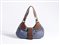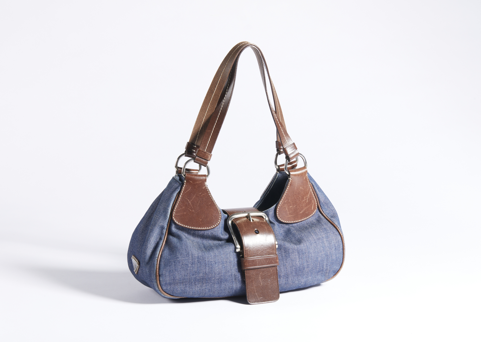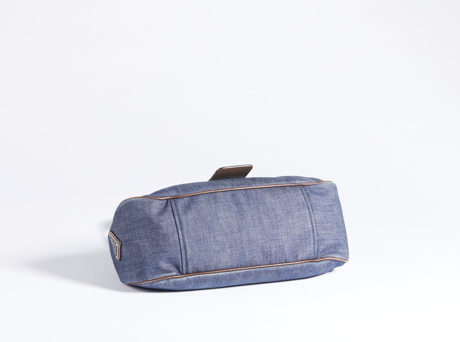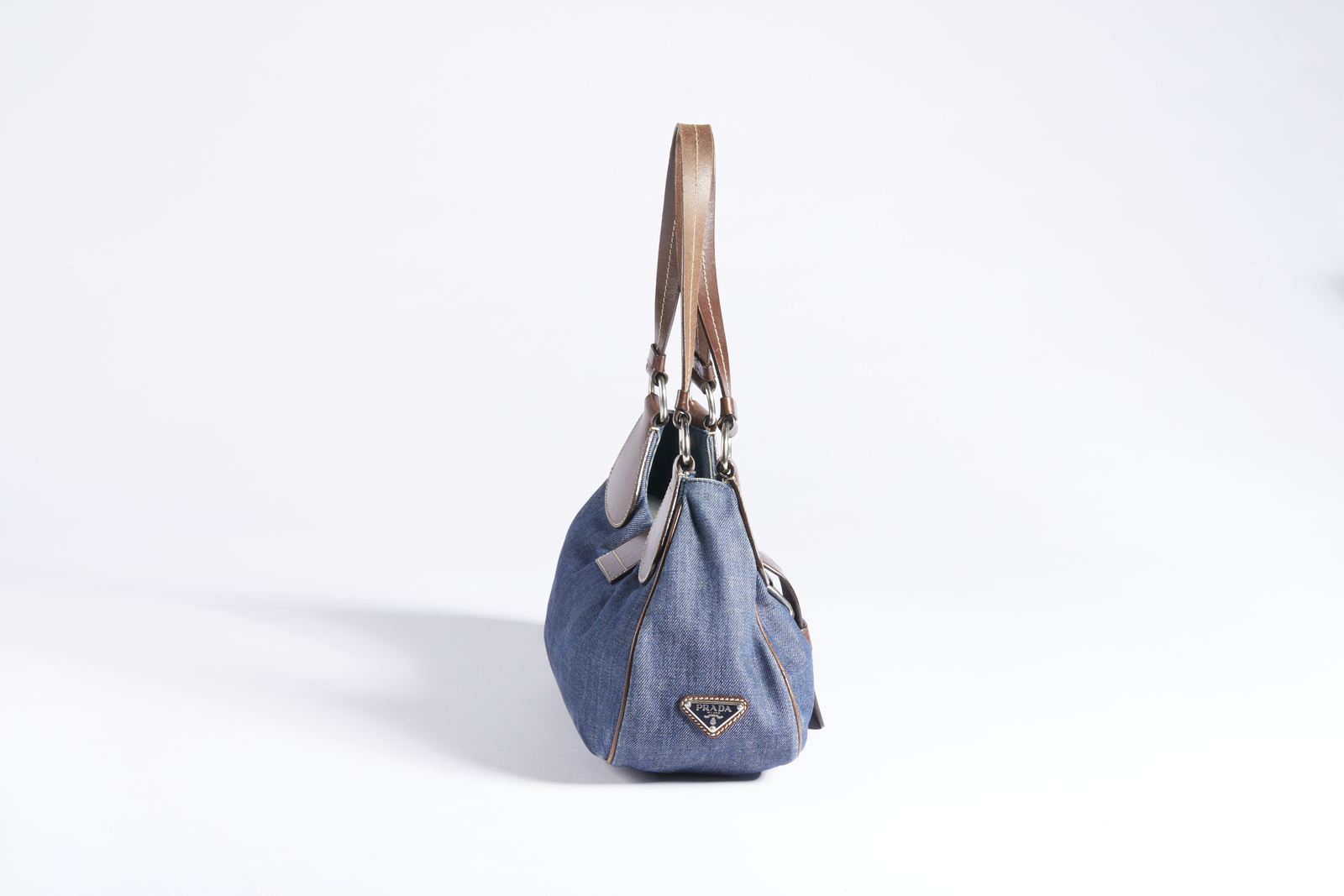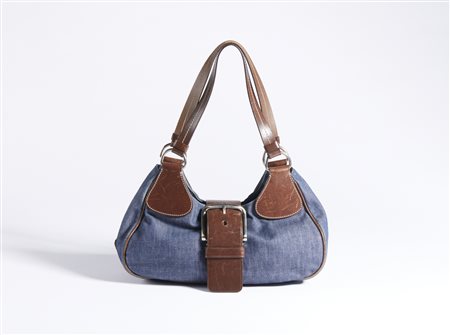 PRADA MILANO Borsa . Tessuto e pelle. Cm 35,00 x 18,00 x 11,50. Borsa a spalla in tela color jeans, inserti in pelle e chiusura a cinta, logo laterale.
