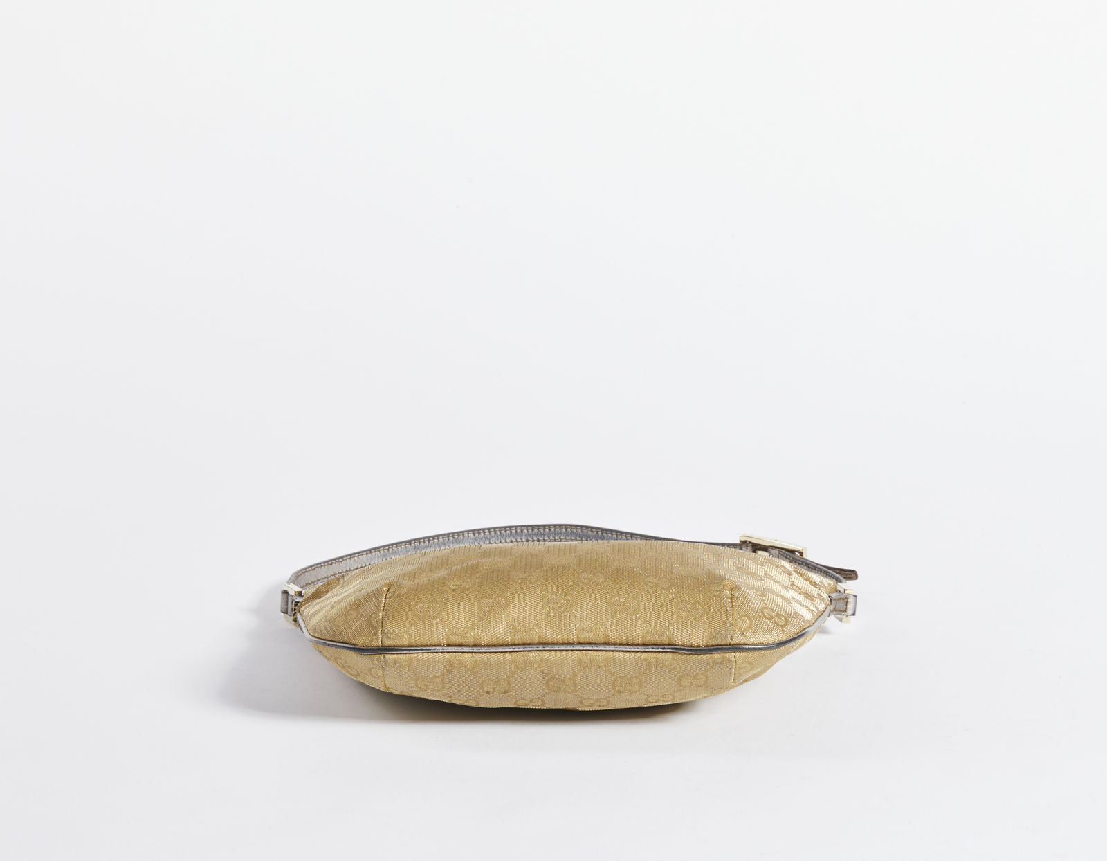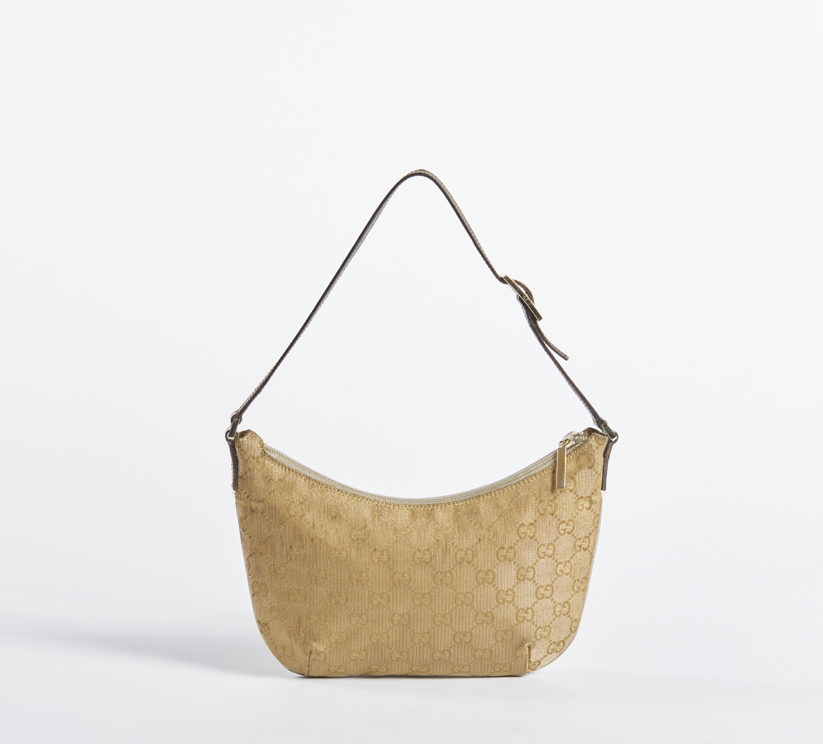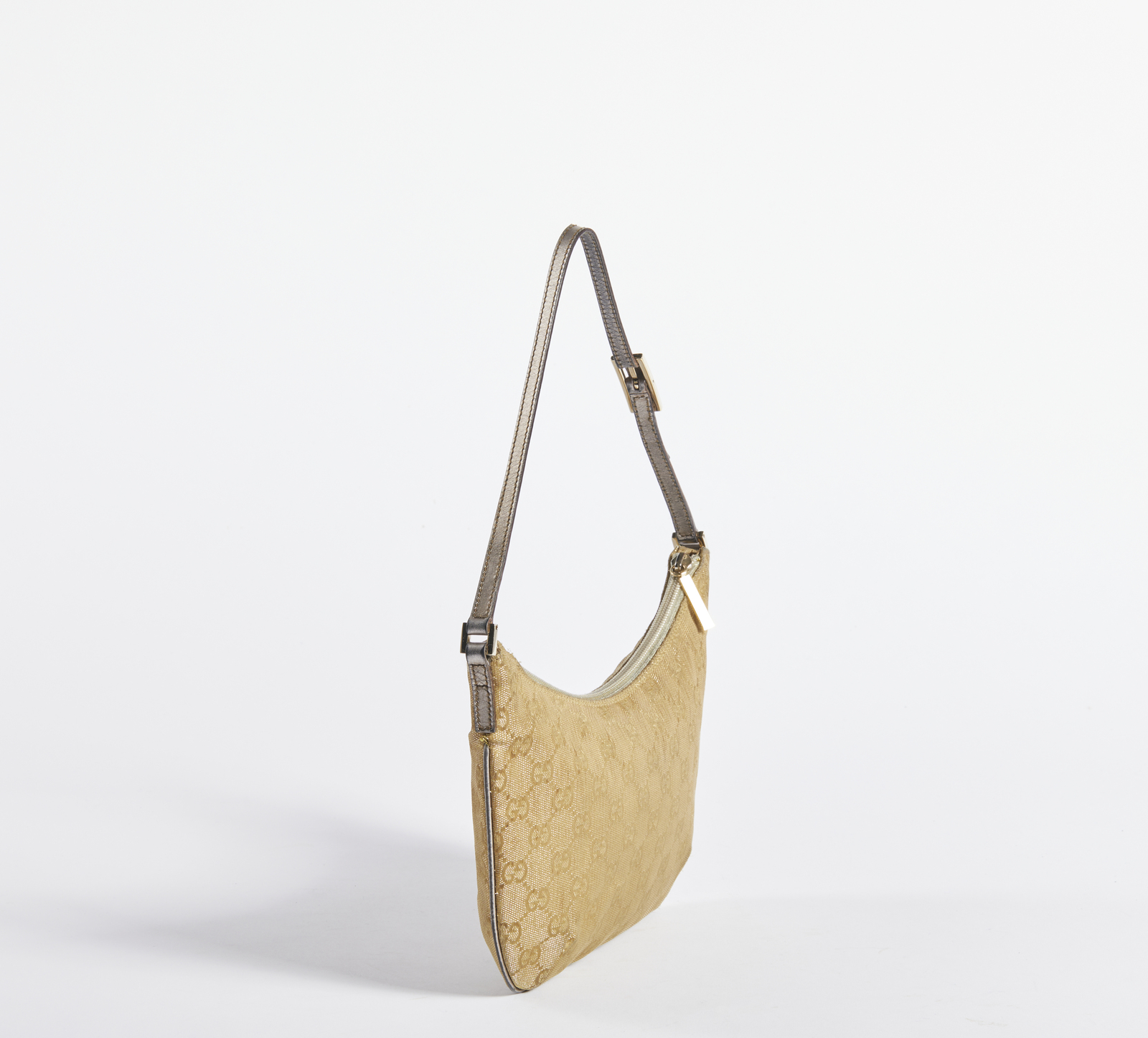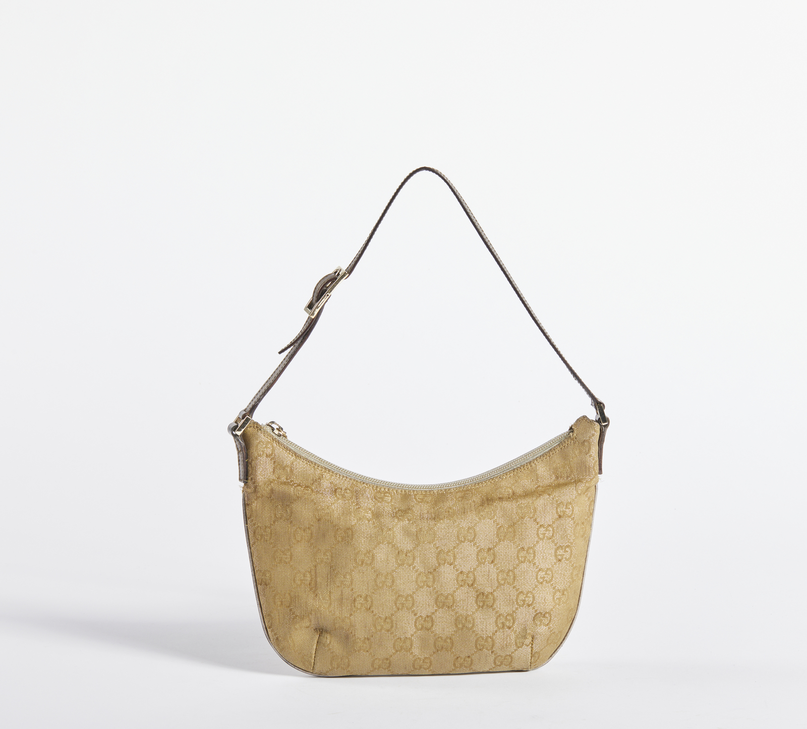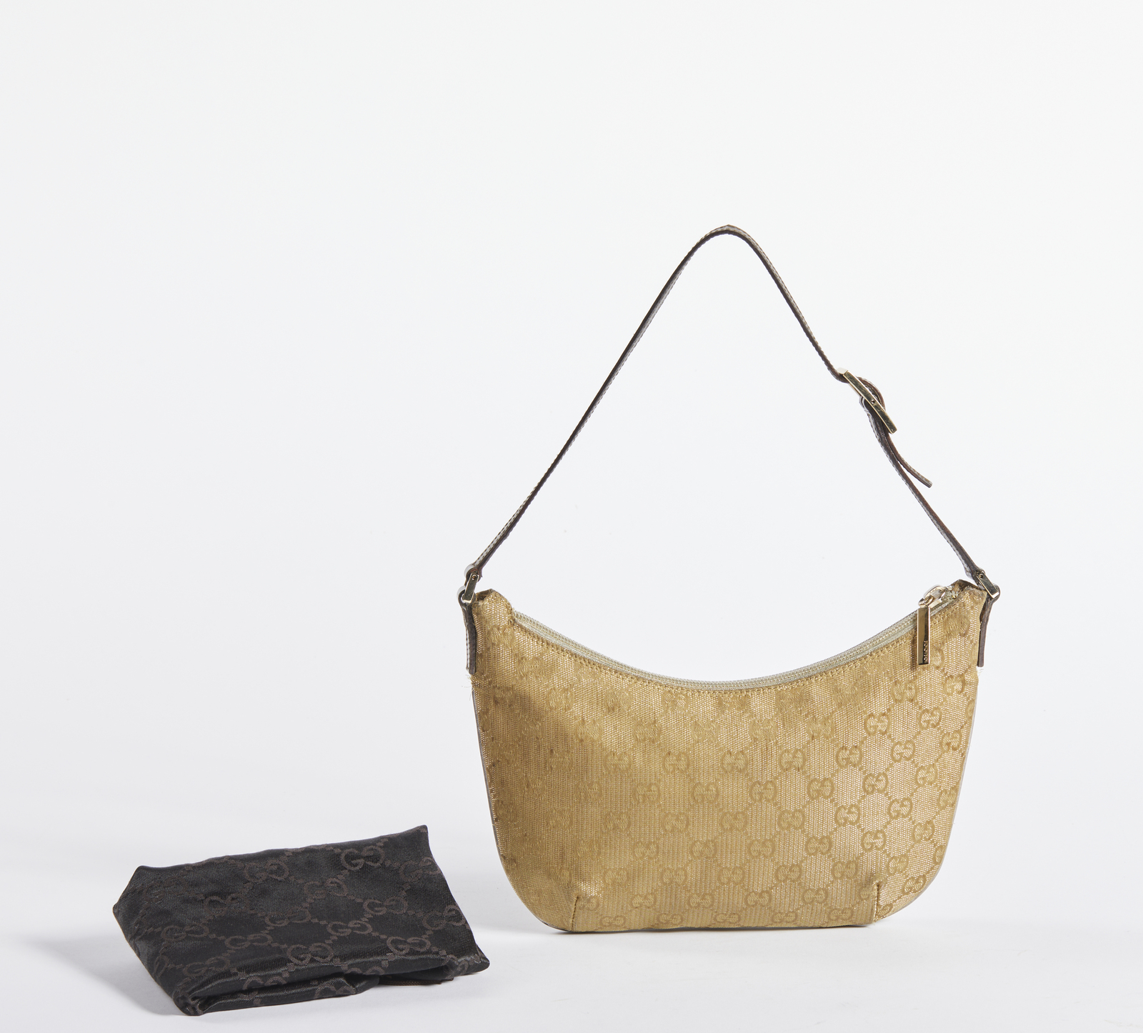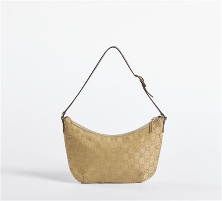 GUCCI Borsa a spalla in tessuto beige cangiante. Tela e pelle. Cm 25,00 x 17,00 x 5,00. Borsa a spalla a forma di croissant di tela beige monogram, cinturino in pelle, chiusura a zip, hardware di colore oro.