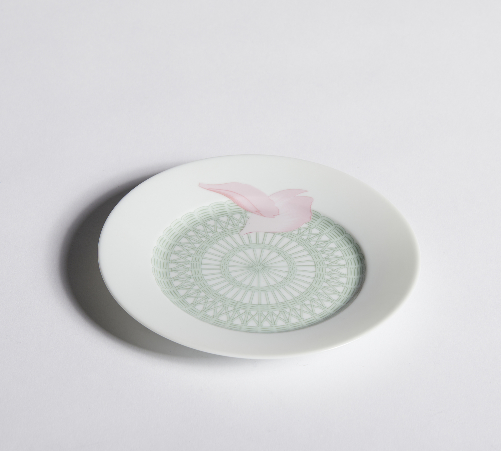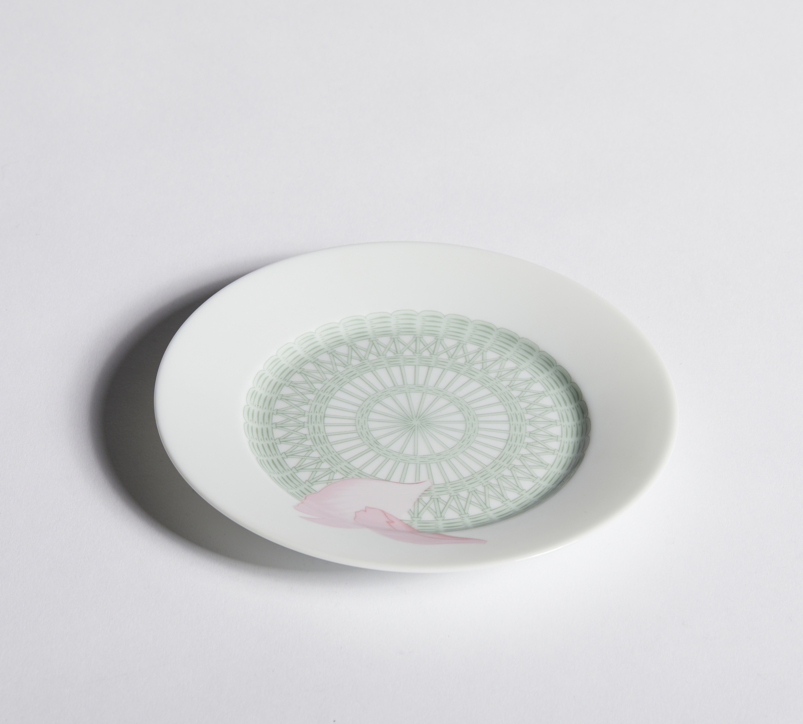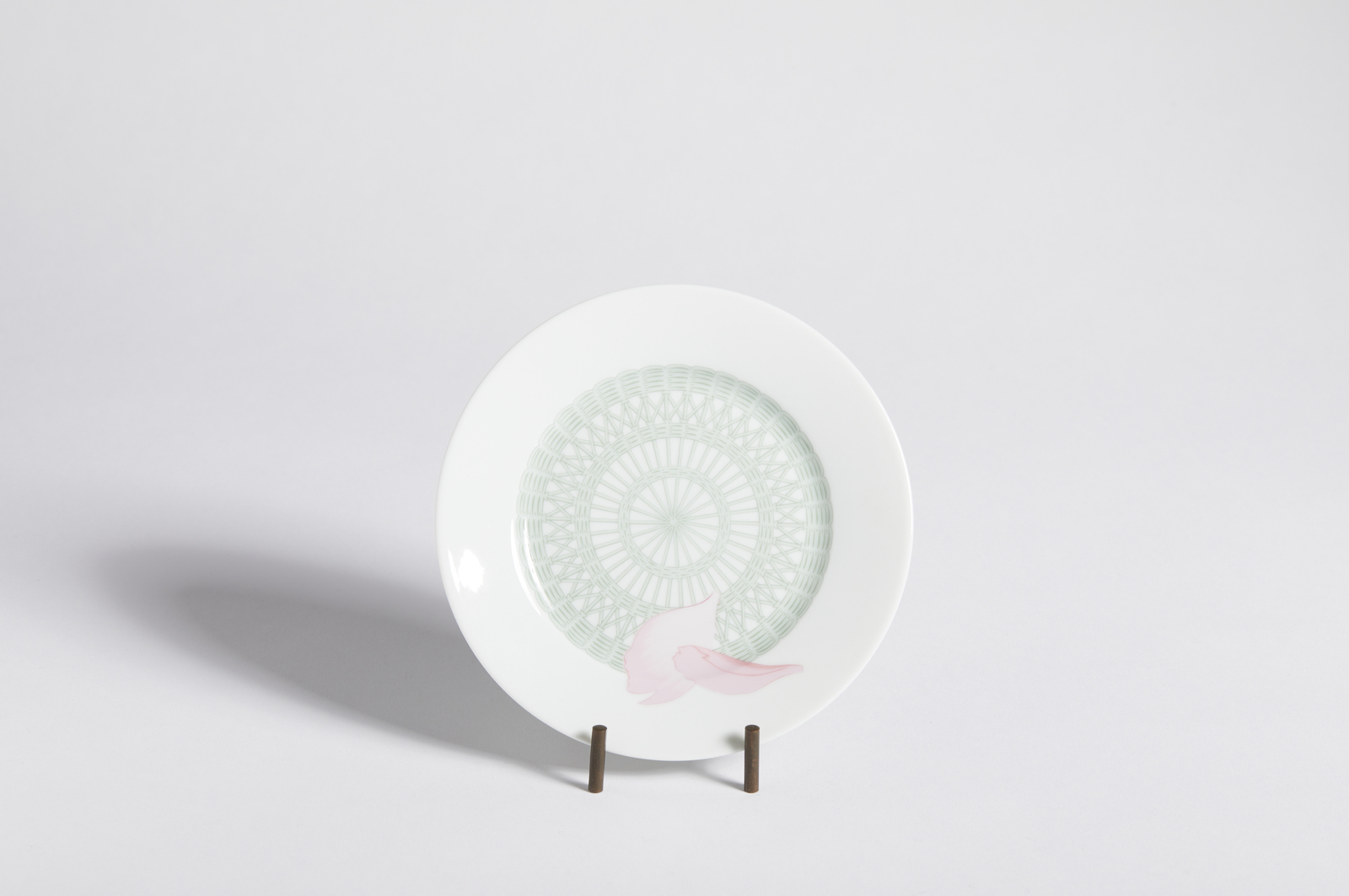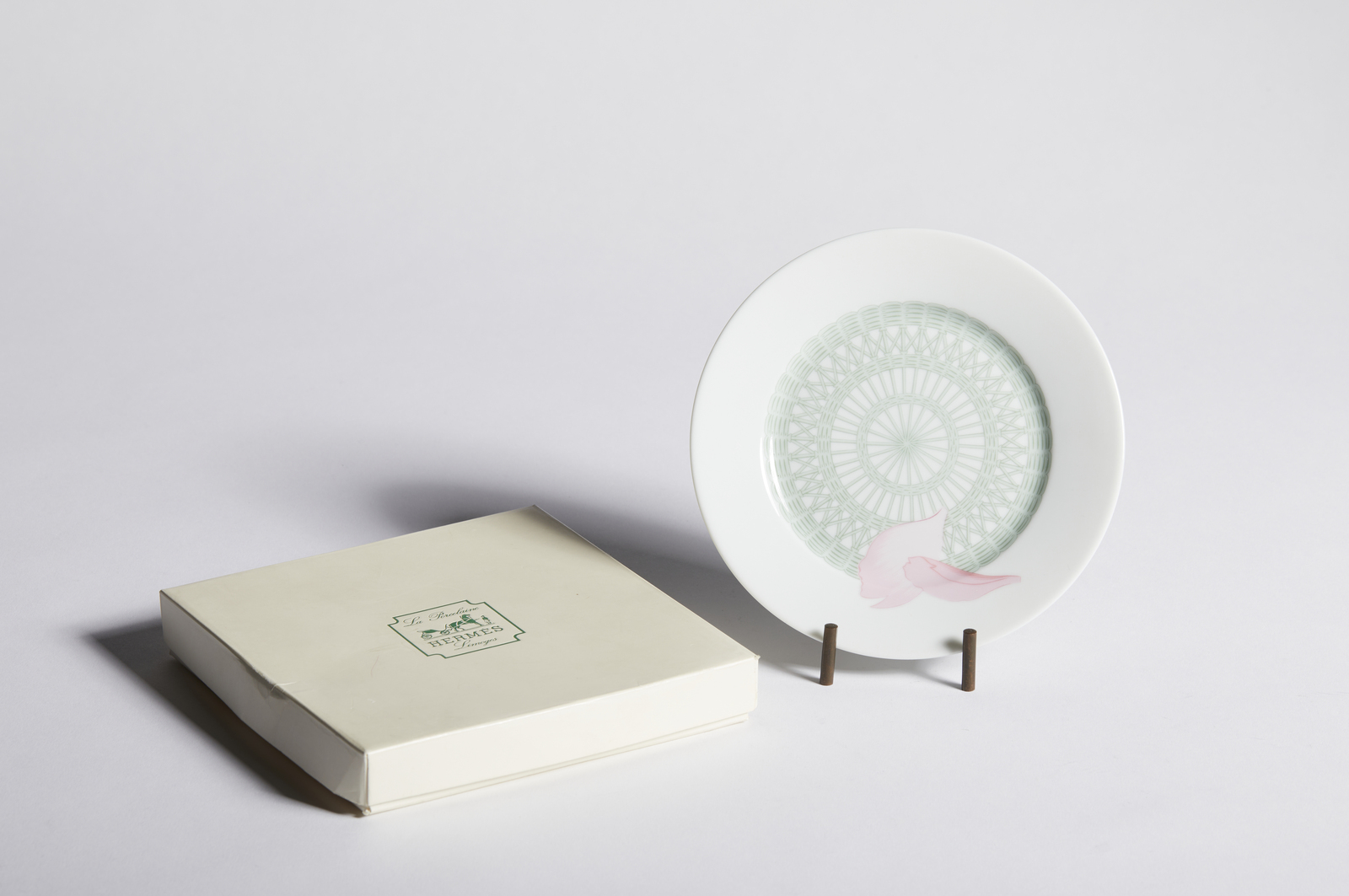 HERMES PIATTINO HERMES LES PIVOINES . Porcellana Limoges. Cm 16,00. Piatto Hermes in porcellana con decoro centrale nei toni del verde e rosa pastello, al retro marchio Hermes.