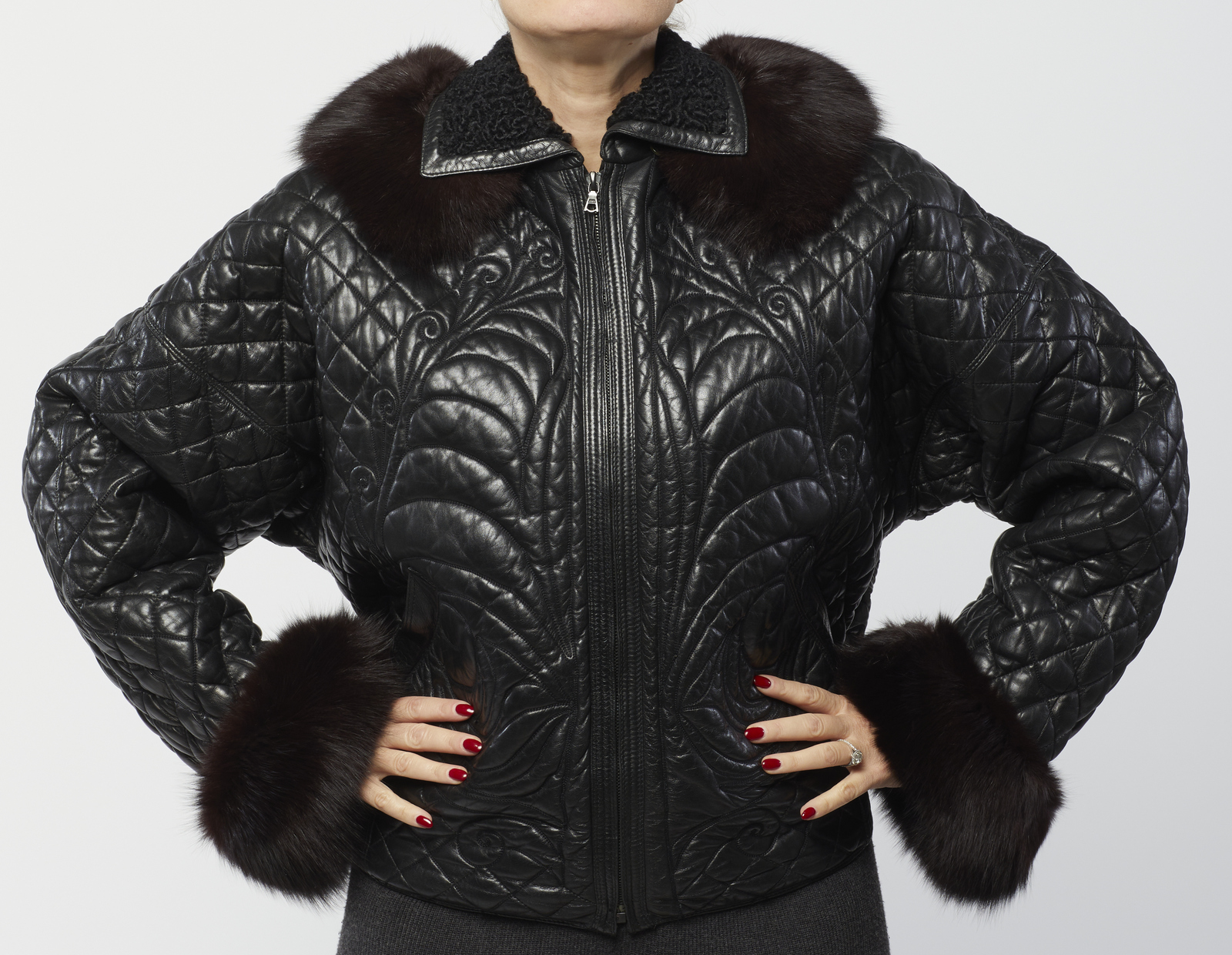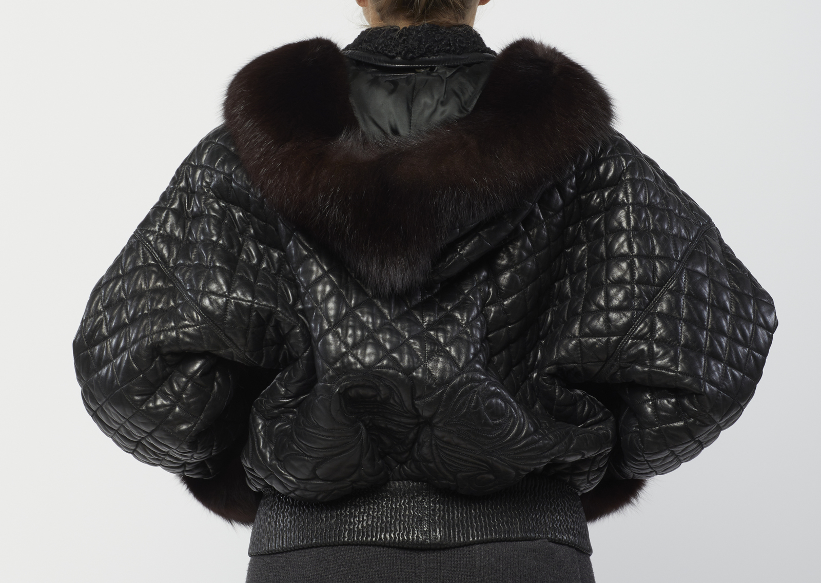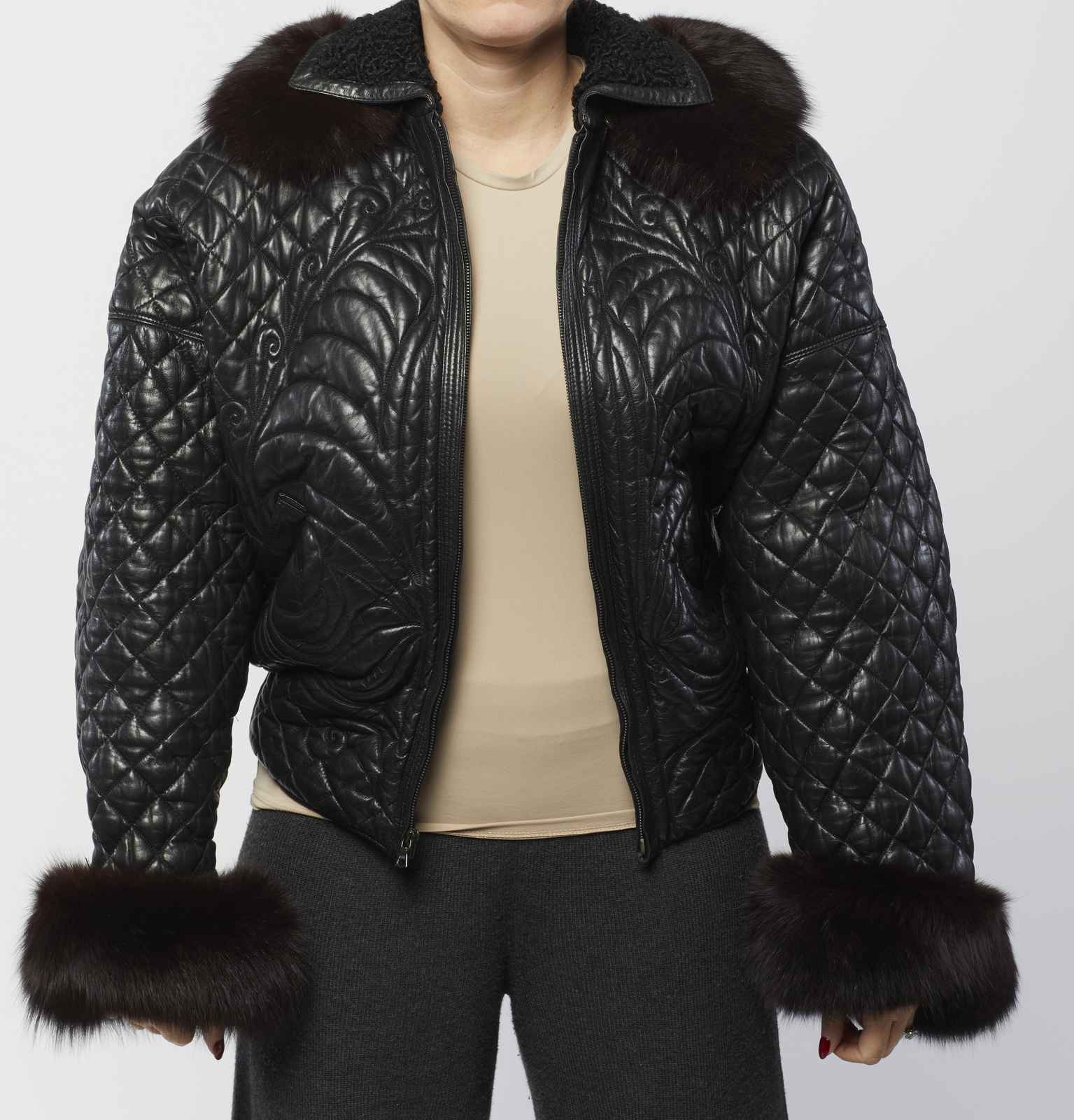 VERSACE GIANNI (1946 - 1997) Bomber trapuntato nero con cappuccio con dettagli in pelliccia. 1990. Pelle. . Bomber imbottito in pelle nera trapuntata e lana, collo di pelliccia nera removibile. Etichetta interna Gianni Versace, Prima metà anni '90.