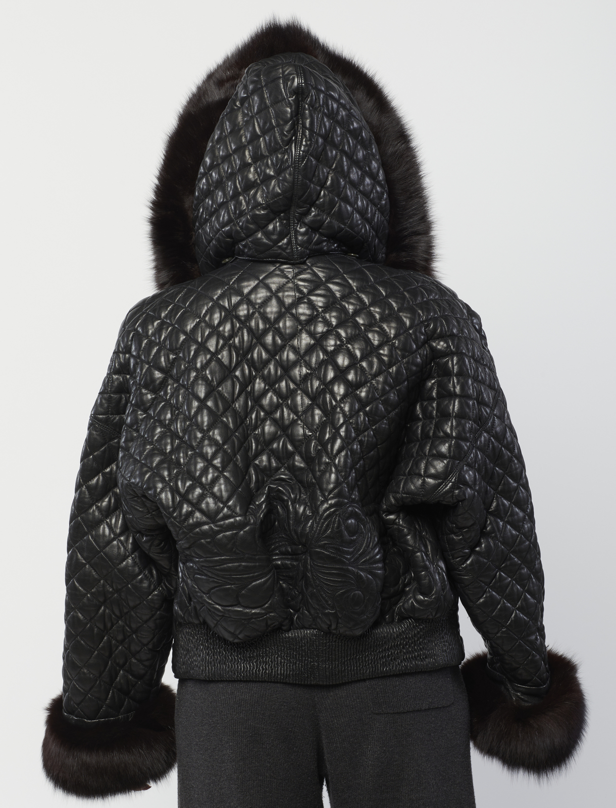 VERSACE GIANNI (1946 - 1997) - Bomber trapuntato nero con cappuccio con dettagli in pelliccia.