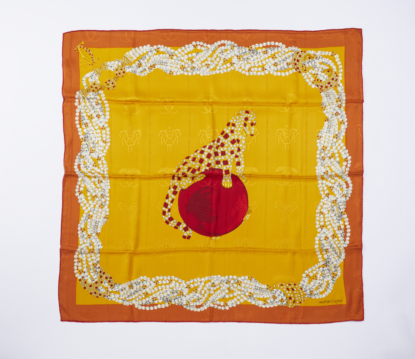 CARTIER Foulard. Seta. Cm 84,00 x 84,00. Foulard nei toni del giallo e del rosso, raffigurante una pantera che rende omaggio alla Duchessa di Windsor da parte della Maison Cartier. Completo di scatola.