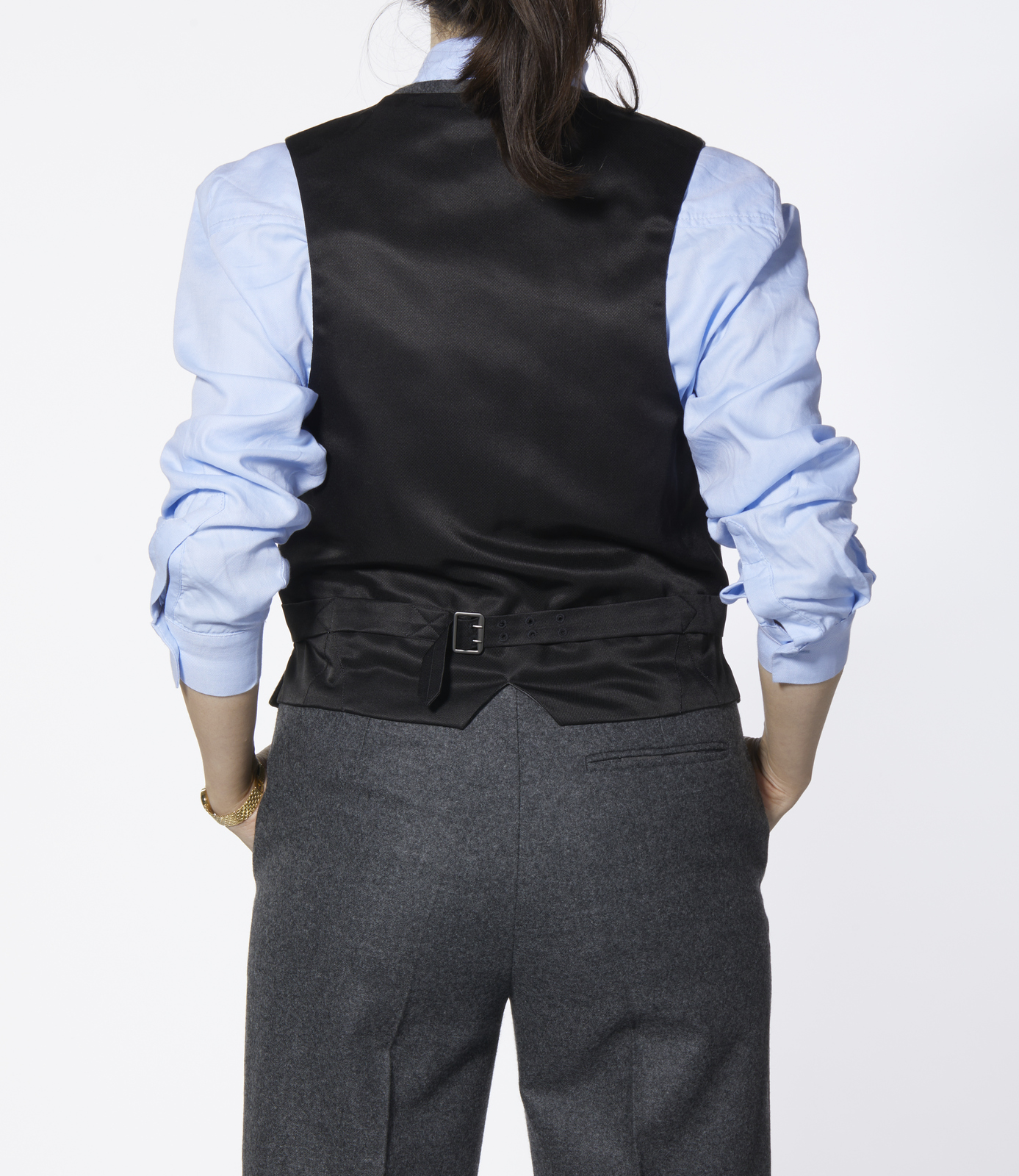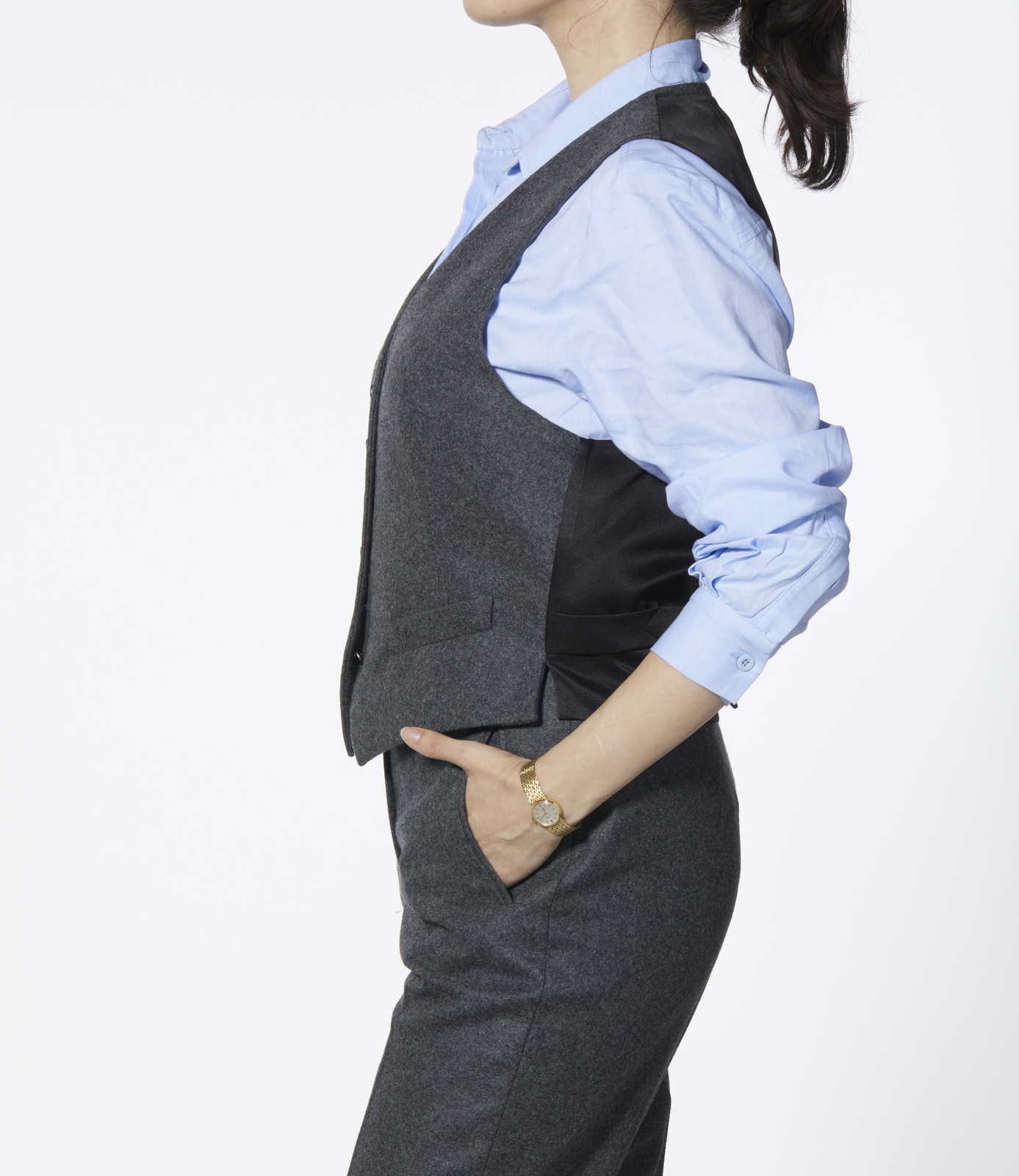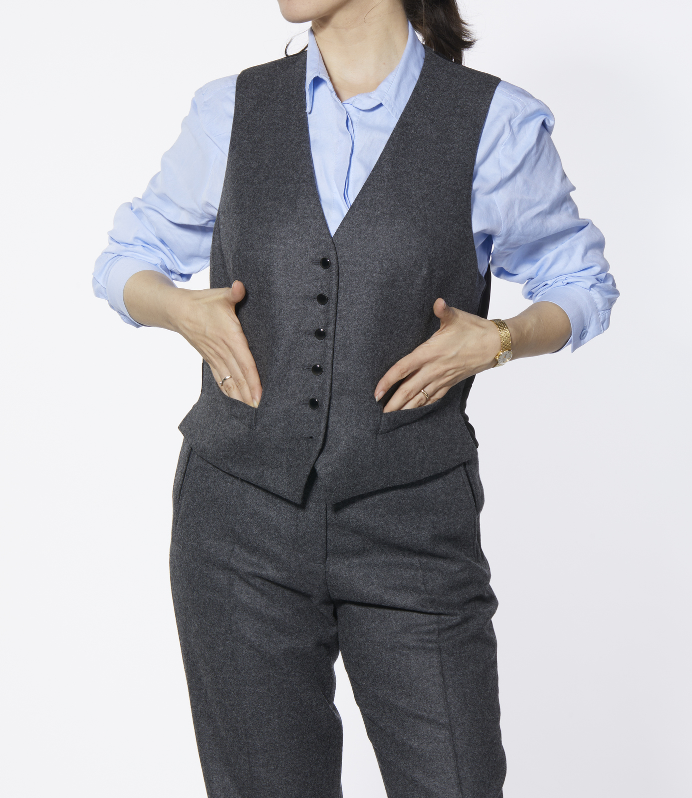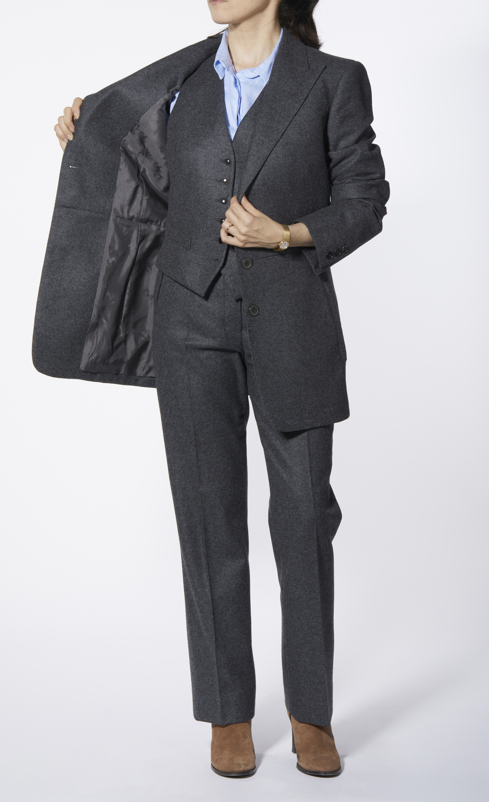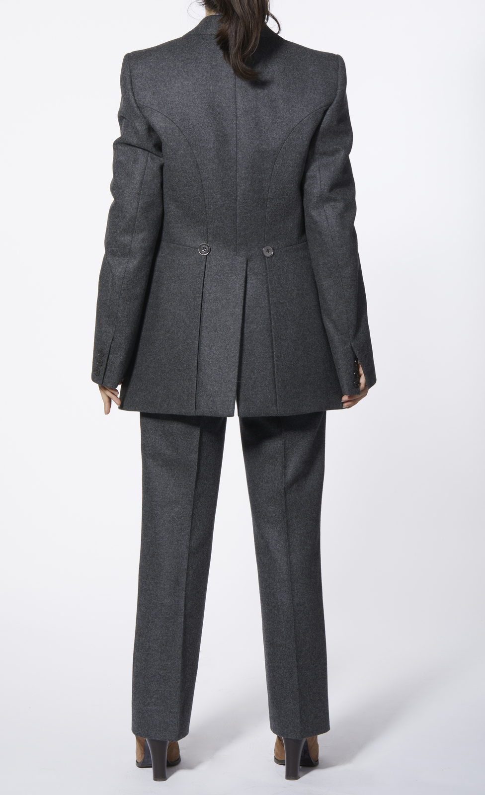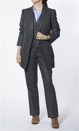 HERMES Completo da donna in toni del grigio . lana. . Completo da donna composto da giacca, pantalone e sottogiacca in lana e cashmere, fodera in seta. Taglia giacca e pantalone 38IT. Bottoni logo.