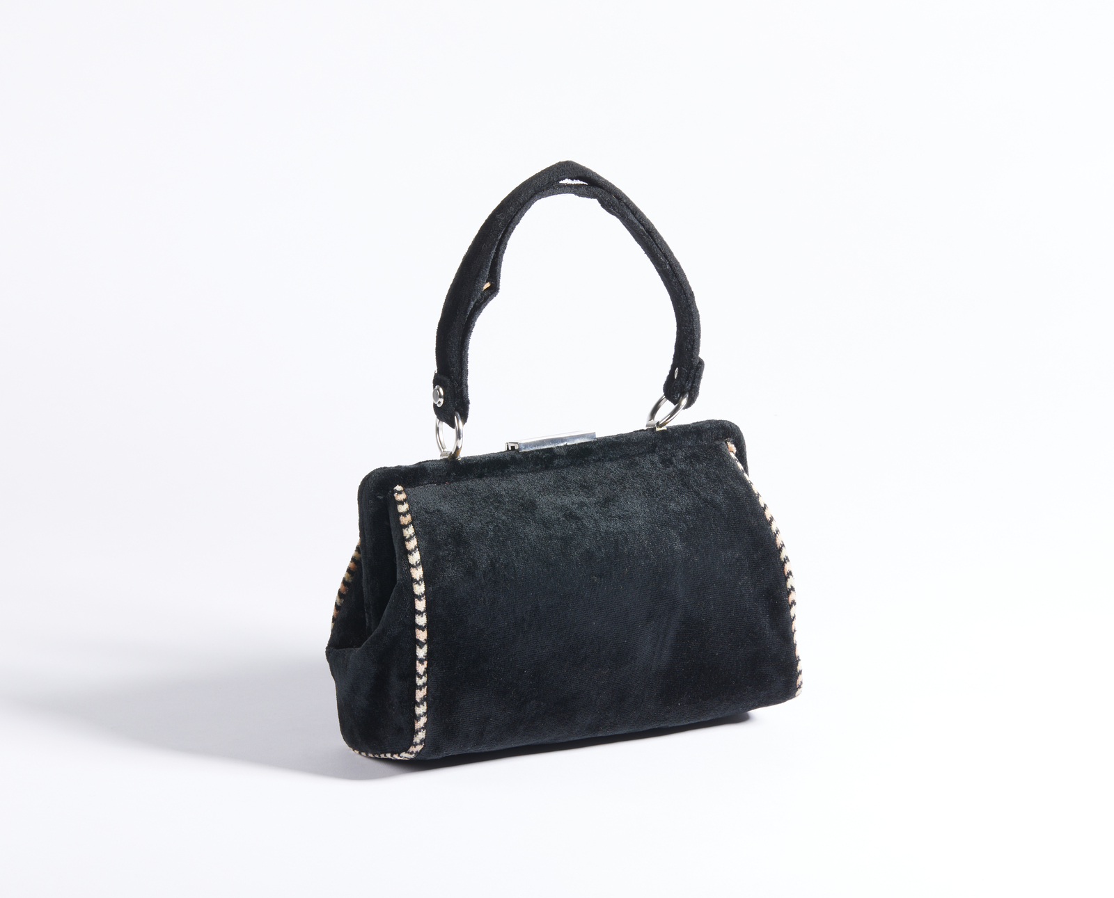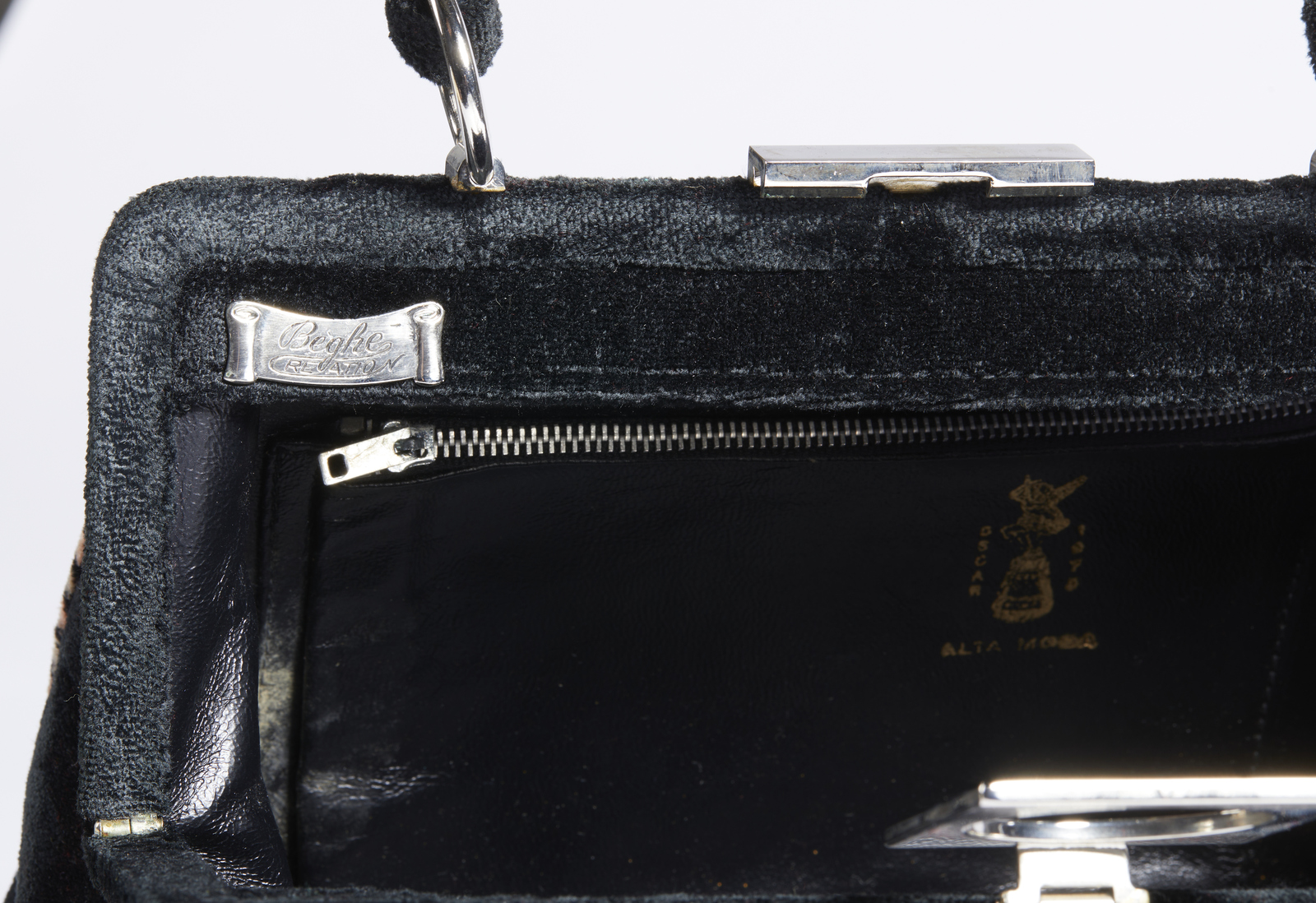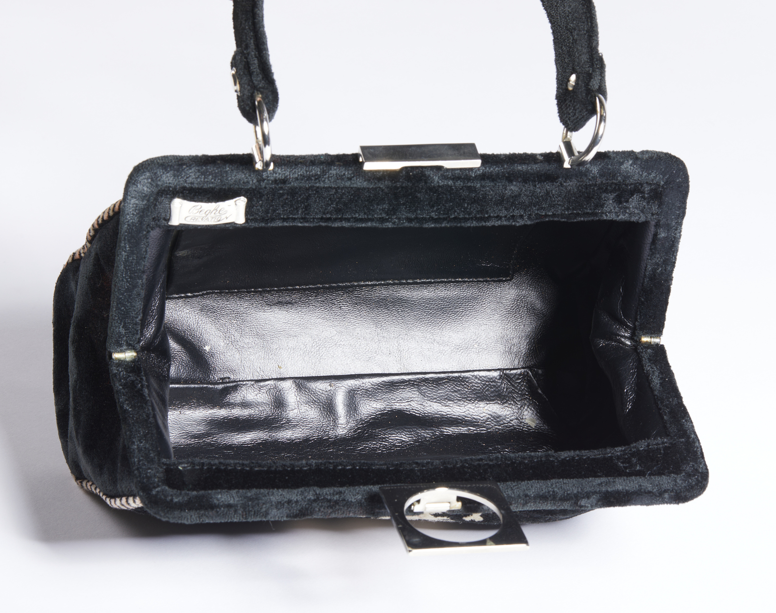 BEGHE REATION Borsa. Velluto. Cm 24,00 x 17,00 x 10,00. Borsa in velluto nero, manico in velluto, chiusura a clip. Interno in pelle con tasca piatta e chiusura a zip.