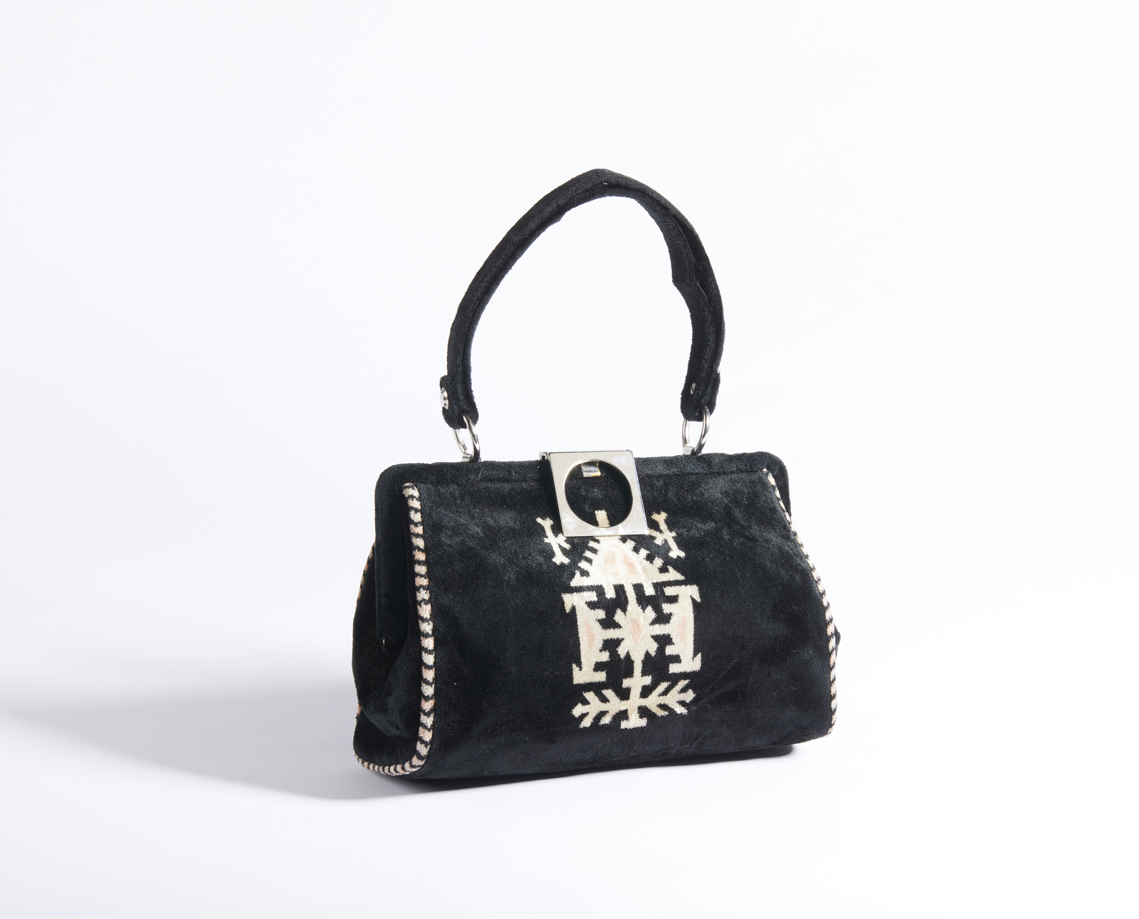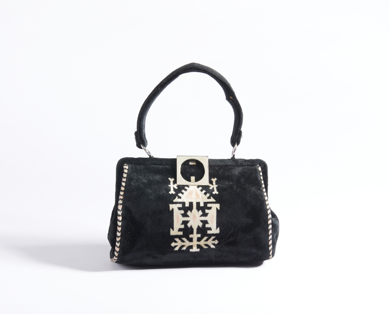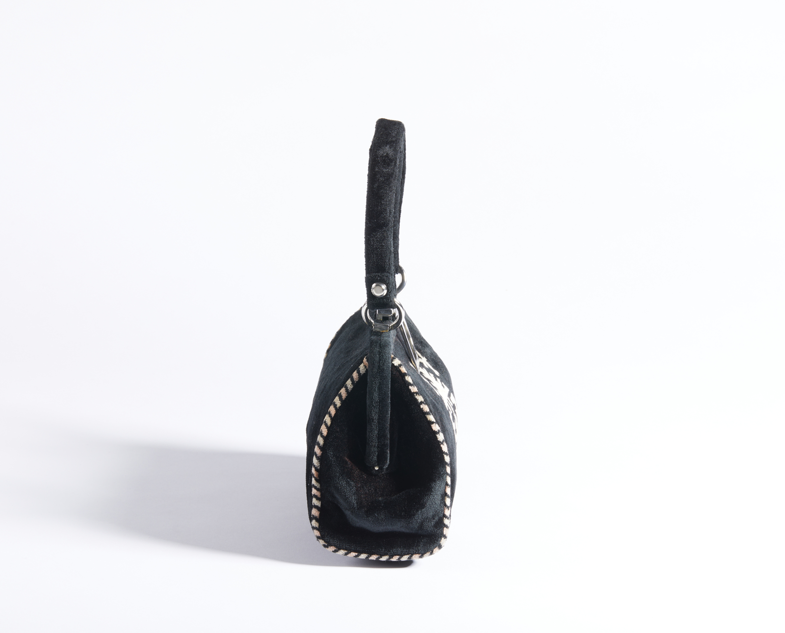 BEGHE REATION Borsa. Velluto. Cm 24,00 x 17,00 x 10,00. Borsa in velluto nero, manico in velluto, chiusura a clip. Interno in pelle con tasca piatta e chiusura a zip.