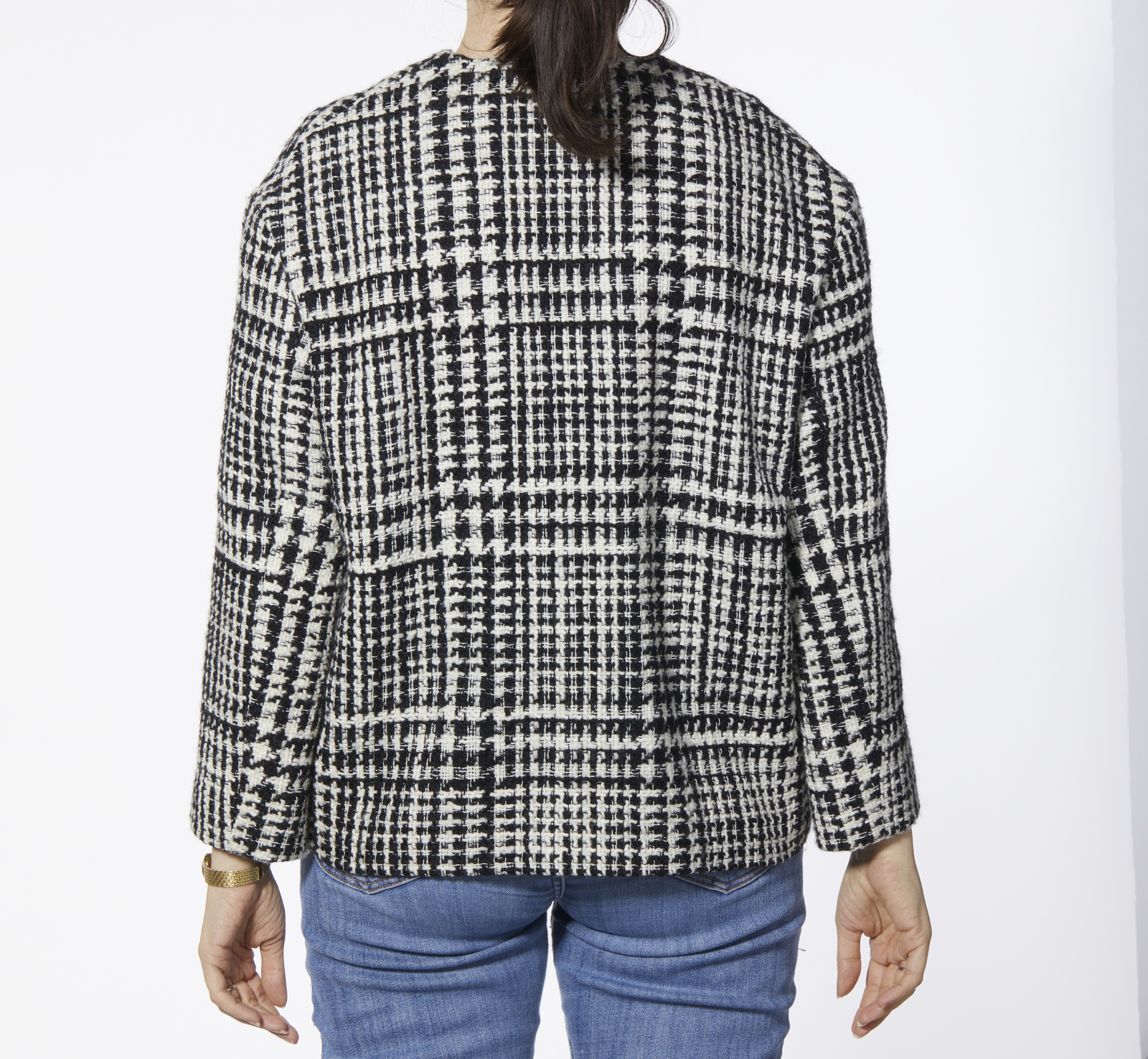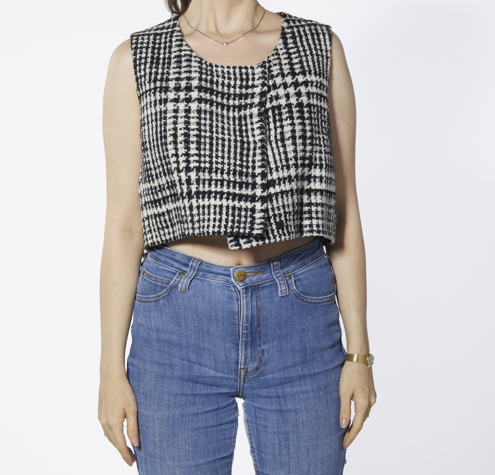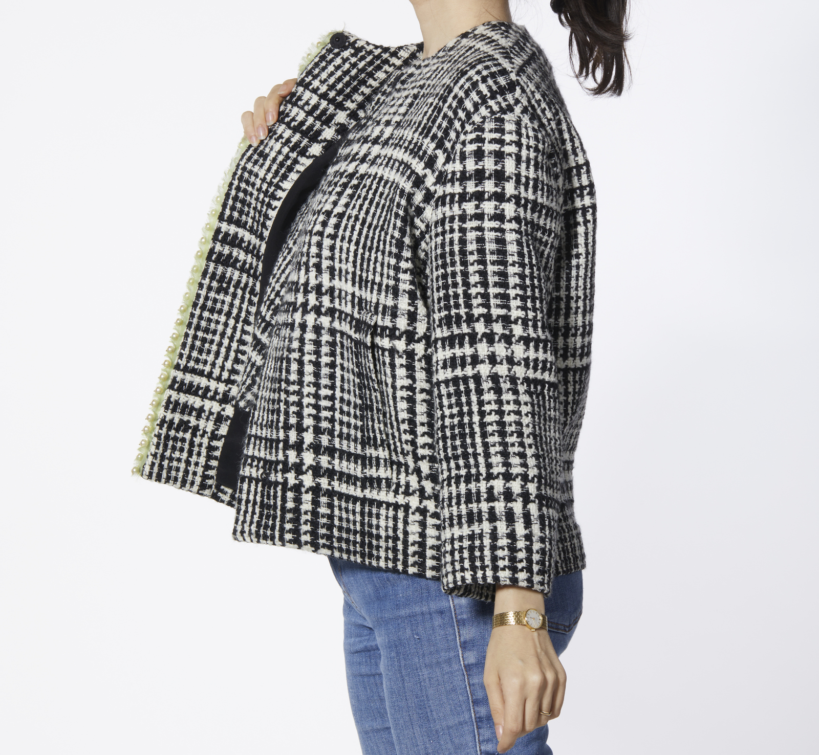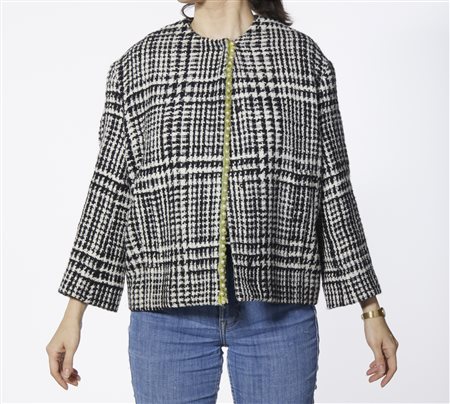 DIOR CHRISTIAN (1905 - 1957) Giacca e top Dior . Lana e polyamide. . Lotto composto da top smanicato in lana con chiusura a doppiopetto tramite bottoni, giacca in lana con applicazioni di perline sul bordo in tweed bianco e nero