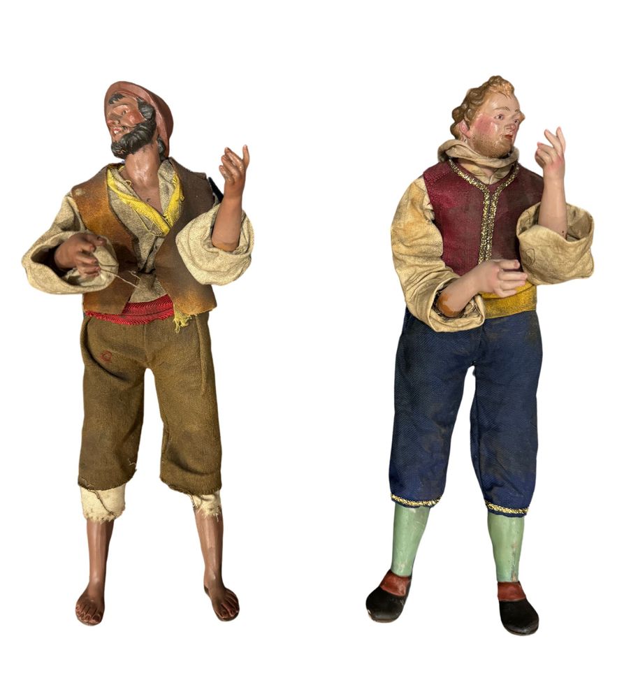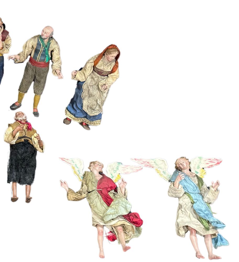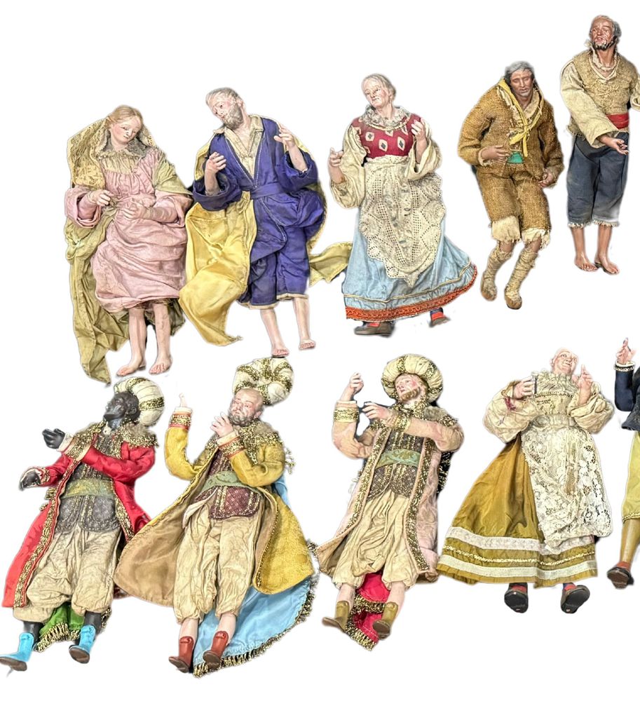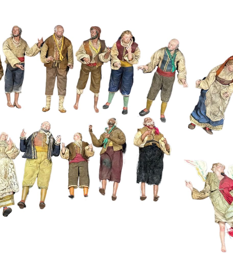Numero di 20 sculture da presepe napoletano di periodo 1930 - 1940, così composte: Mani, piedi e testa in terracotta policromo. Occhi in vetro. Corpo in canapa. Abiti in stoffa. Dimensioni: 25 cm. Tutte e 20 sculture si presento in ottime condizioni con lievi segni di vissuto come da foto allegate. Provenienza collezione privata famiglia napoletana.