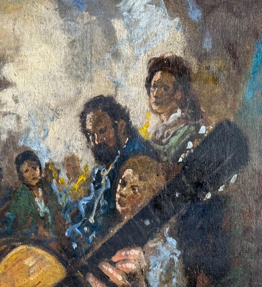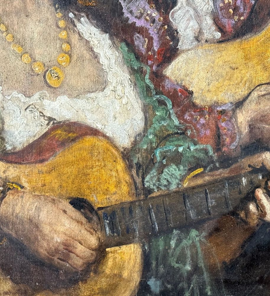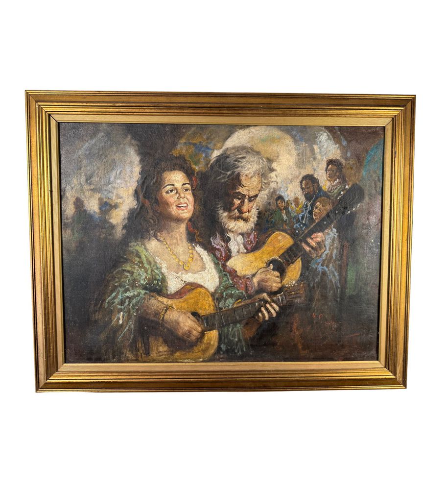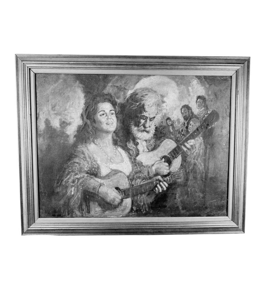 Dipinto olio su tela, periodo XX secolo scuola Italiana, raffigurante Artisti di strada. Firmato in basso a destra da Francesco Rispoli (omaggio a Clemente Tafuri) Dimensioni compreso cornice: 109x86 cm. Dimensioni interno cornice: 92x70 cm. Opera in buone condizioni con lievi segni di vissuto come da foto allegate.