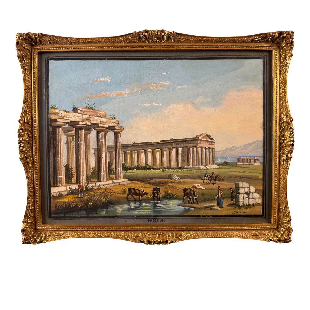Dipinto guazzo (tempera su carta), periodo inizio XX secolo scuola italiana, raffigurante I templi di Paestum. Dimensioni interno cornice: 38x29 cm. Dimensioni compreso cornice: 44x34 cm. Reca firma in basso a destra da artista non identificato. Opera in buone condizioni con lievi segni di vissuto come da foto allegate.