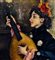 Dipinto olio su tela, periodo 1950 - 1960, scuola Italiana, raffigurante Ragazza con mandolino. Dimensioni compreso cornice: 63x83 cm. Dimensioni interno cornice: 50x70 cm. Reca firma in basso a destra da artista non identificato. Opera omaggio a Antonio Mancini. Opera in buone condizioni.