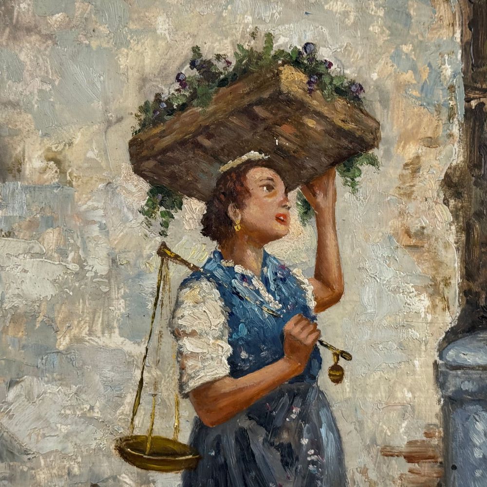 Dipinto olio su tavola, periodo XX secolo (1940 - 1950) scuola Italiana, raffigurante La venditrice. Dimensioni: 30x40 cm. Da artista anonimo. Opera in buone condizioni e di ottima qualità artistica.