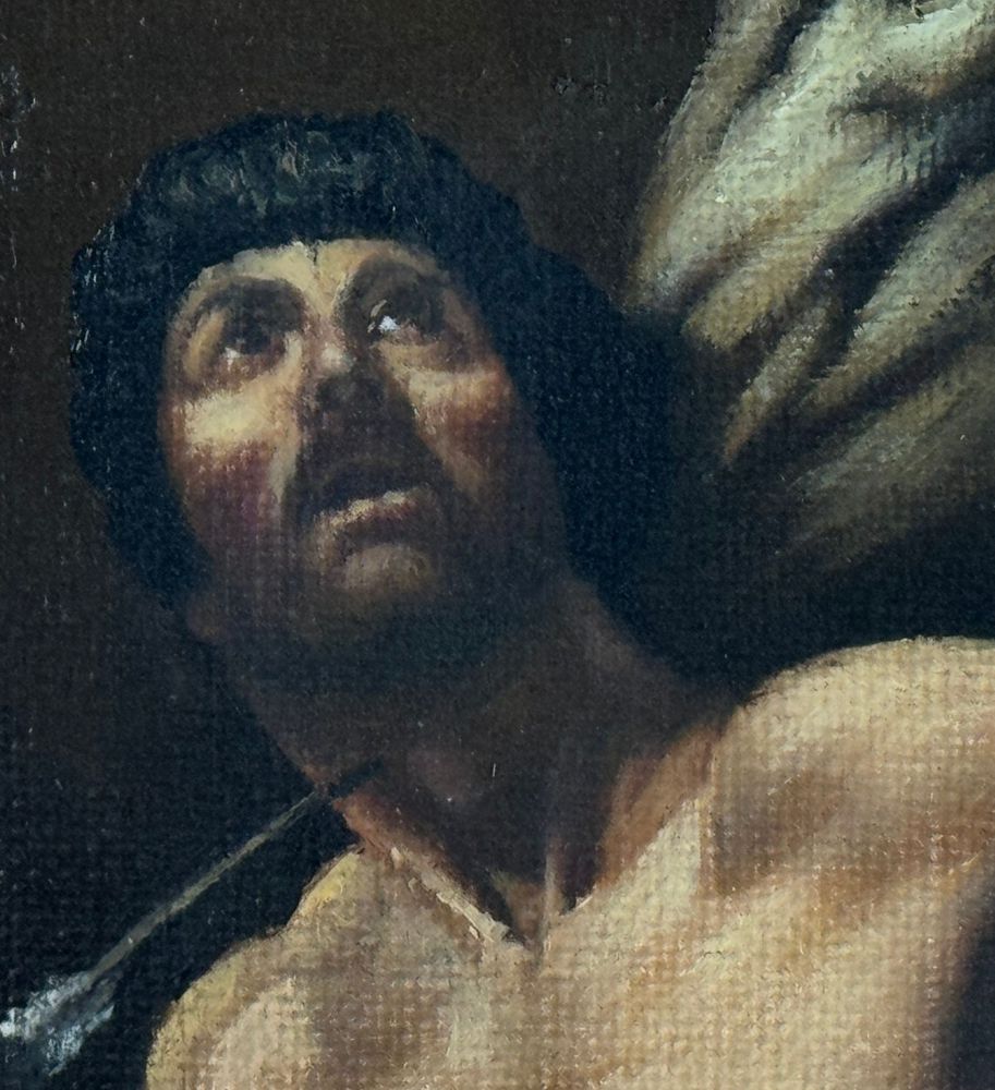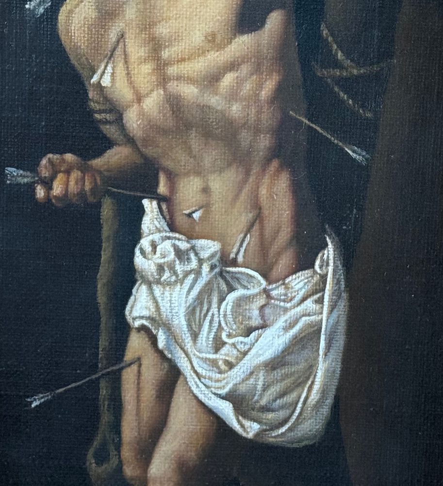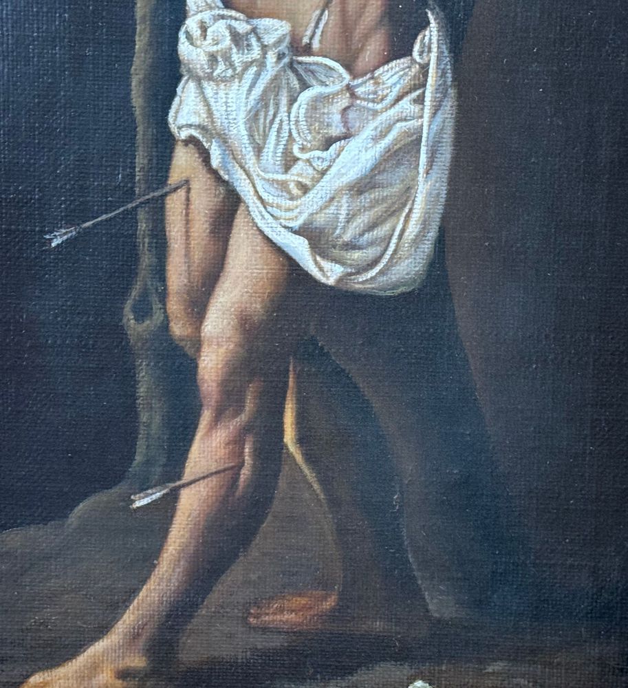 Dipinto olio su tela applicata su pannello, periodo inizio del XX secolo scuola Italiana, raffigurante San Sebastiano, opera di ispirazione classica (copia d'autore). Dimensioni compreso cornice: 50x81 cm. Dimensioni interno cornice: 30x61 cm. Da artista anonimo (pittore accademico). Opera in buone condizioni.
