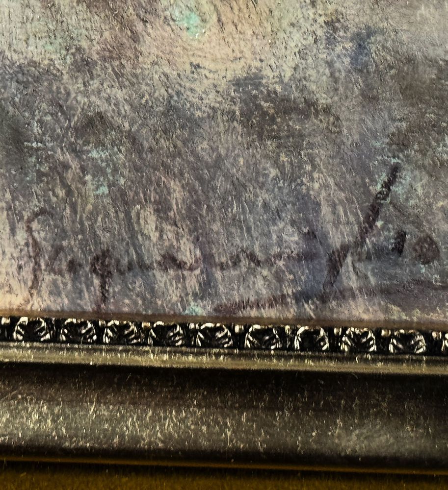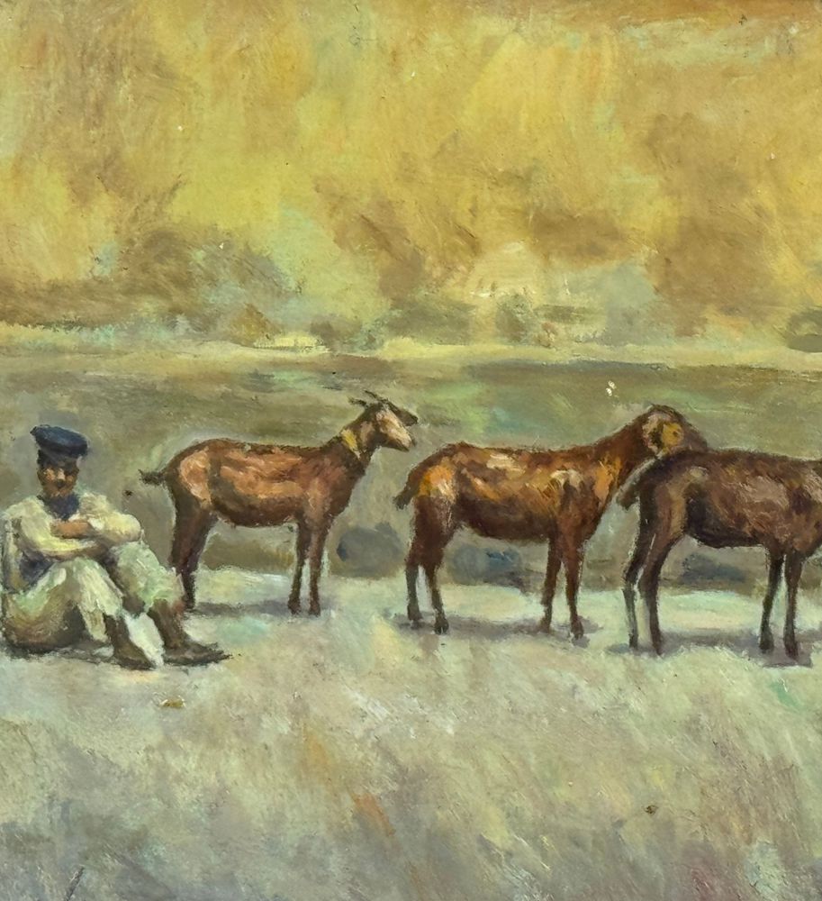 Dipinto olio su tavola, periodo XX secolo, scuola Italiana, raffigurante Personaggi con gregge. Dimensioni compreso cornice: 56x42 cm. Dimensioni interno cornice: 40x25 cm. Reca firma in basso a sinistra da Scognamiglio Giuseppe (Portici 1901-1985 ). Opera in buone condizioni.