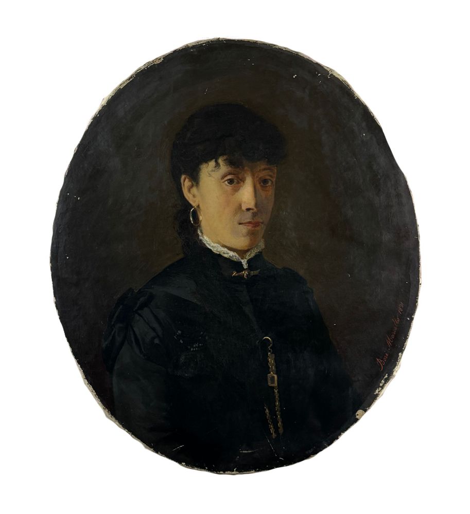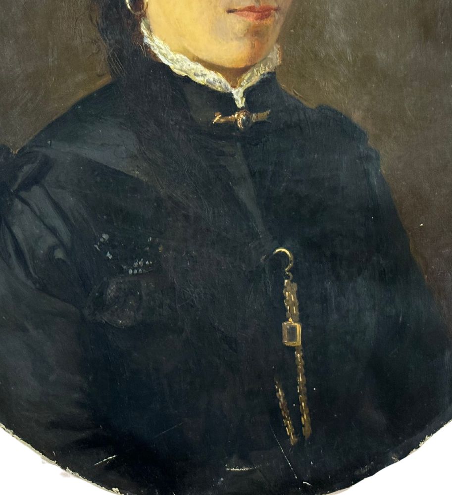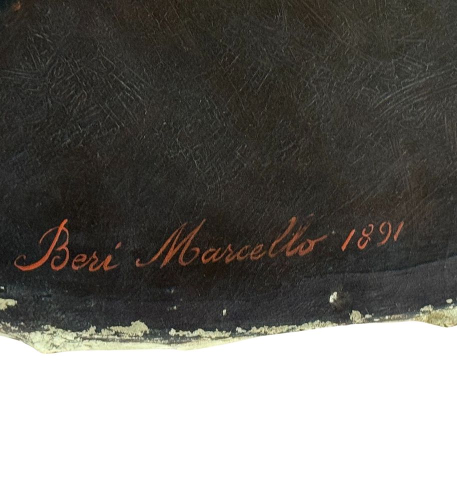 Dipinto olio su tela di forma ovale, periodo XIX secolo scuola Italiana, raffigurante Ritratto di donna (La madre di Decio Scuri). Dimensioni: 72x62 cm. Reca firma laterale a destra da Beri Marcello. Opera in buone condizioni con lievi segni di vissuto come da foto allegate.