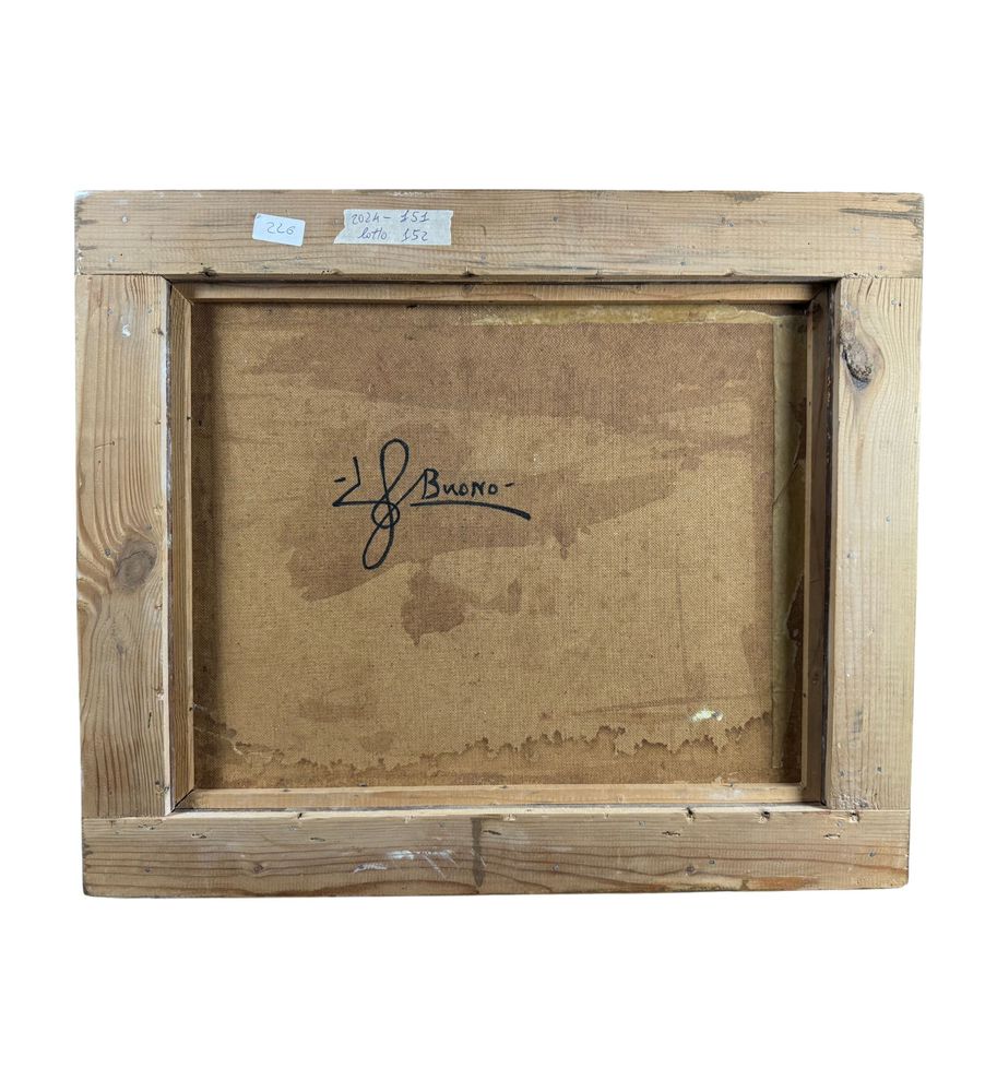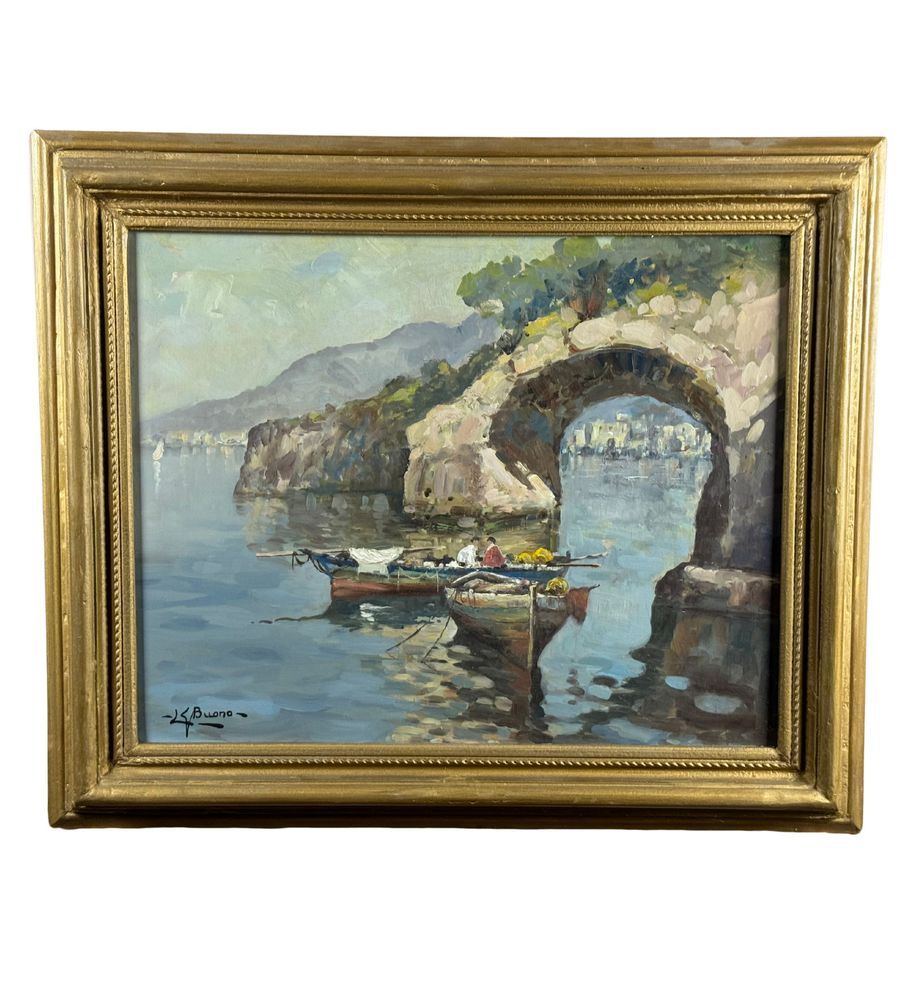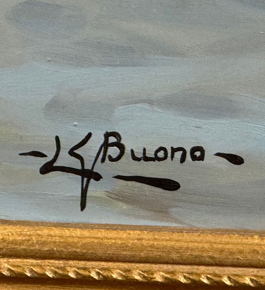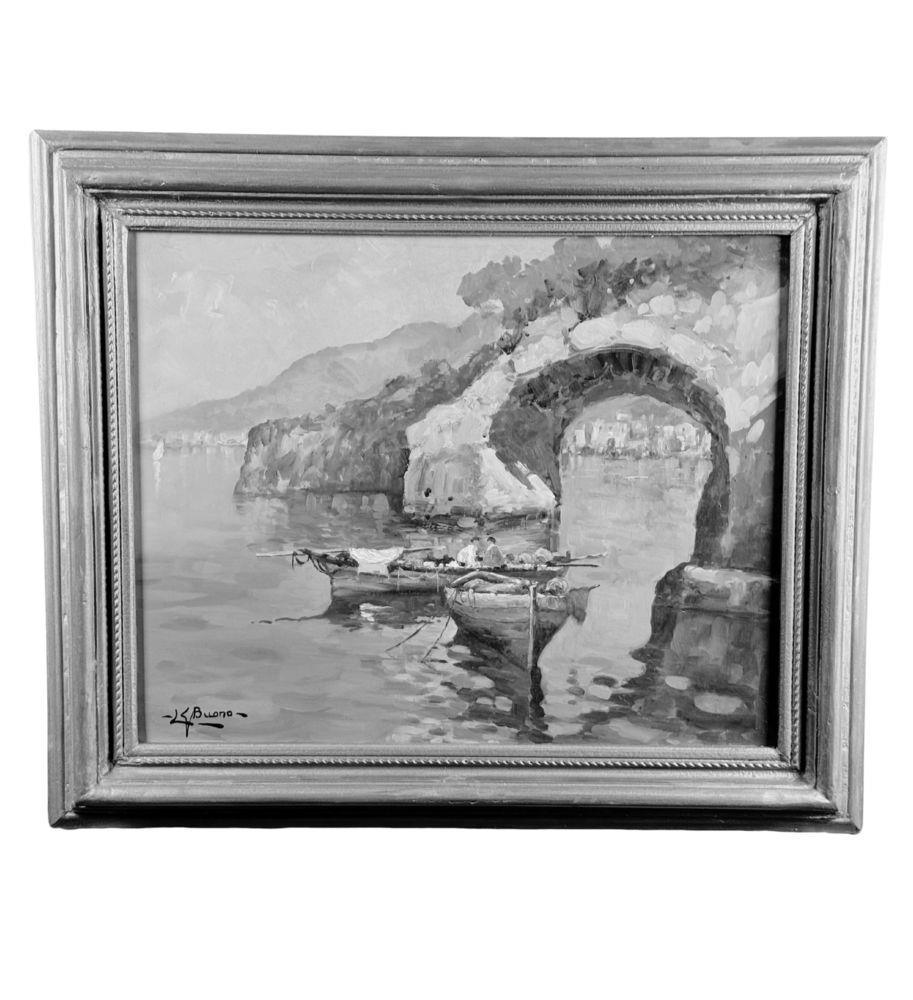 Dipinto olio su pannello, periodo XX secolo scuola Italiana, raffigurante Marina. Dimensioni compreso cornice: 63x53 cm. Dimensioni interno cornice: 50x40 cm. Reca firma in basso a sinistra e autentica sul retro da Leon Giuseppe Buono. Opera in buone condizioni.