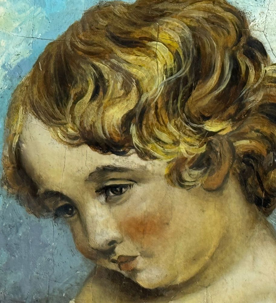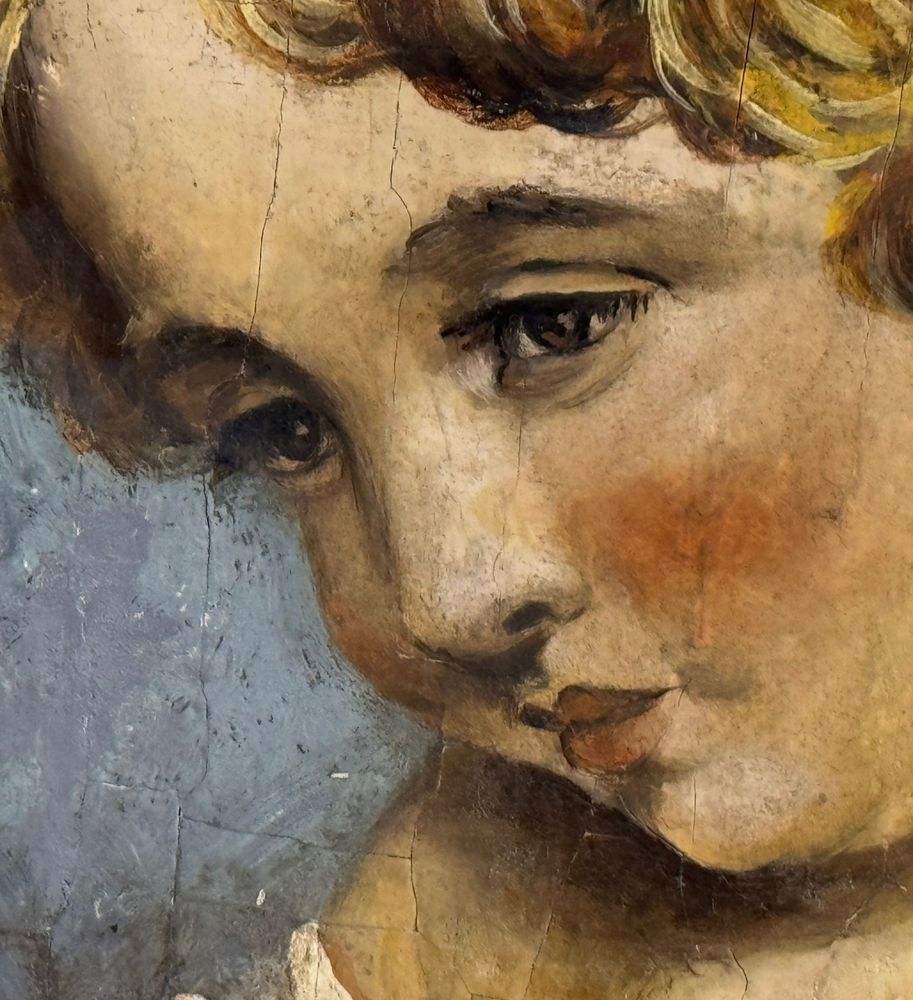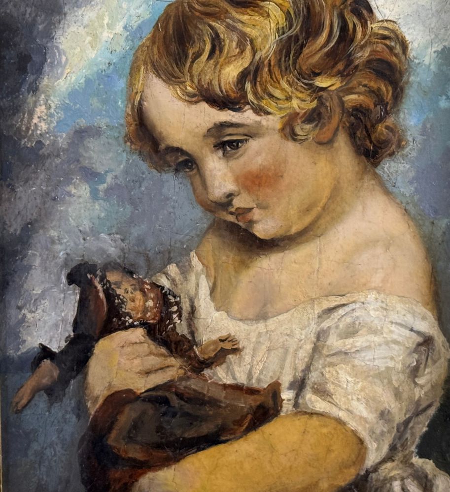 Dipinto olio su tela, periodo XIX/XX secolo scuola Italiana, raffigurante Ritratto di bambina con bambola. Dimensioni compreso cornice: 37x46 cm. Dimensioni interno cornice: 27x37 cm. Reca firma in basso a destra da artista non identificato. Opera in buone condizioni, da segnalare un vecchio rintelo.