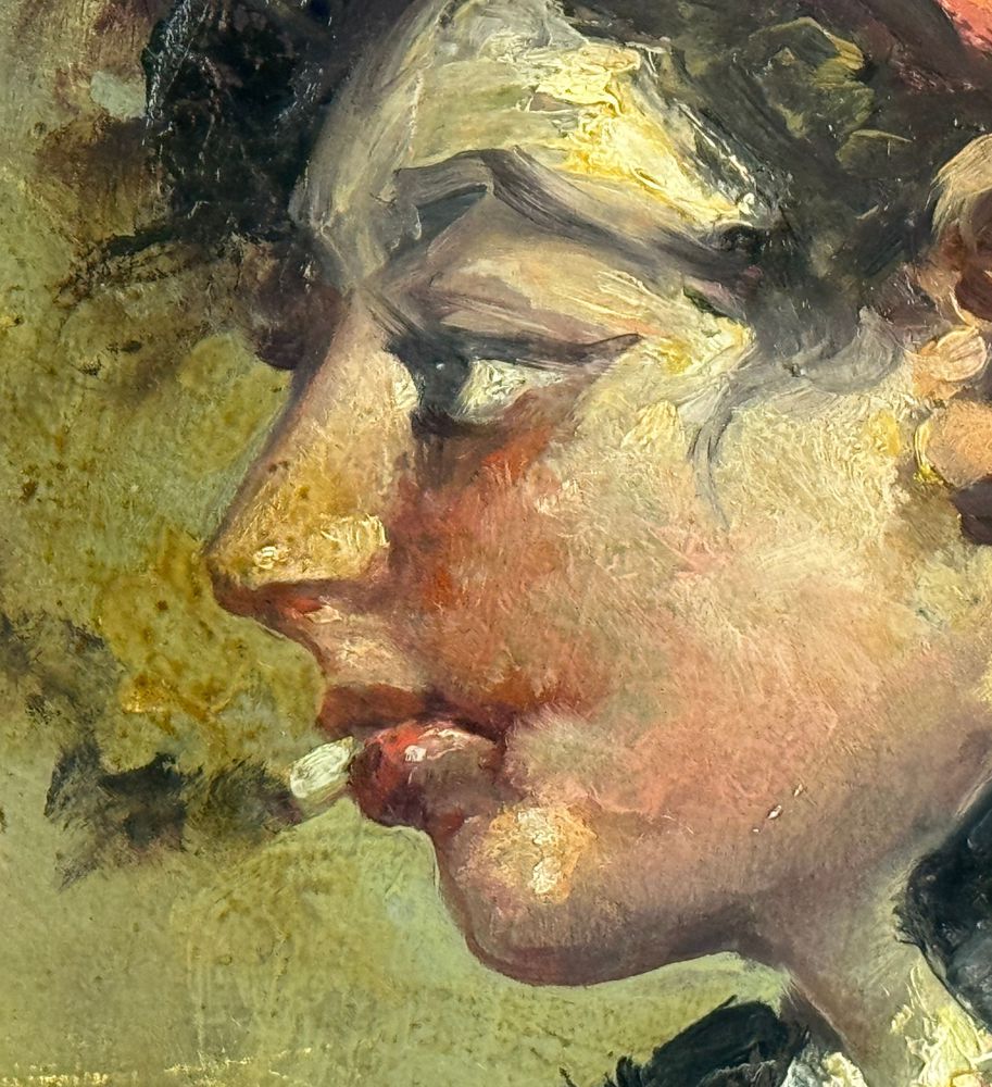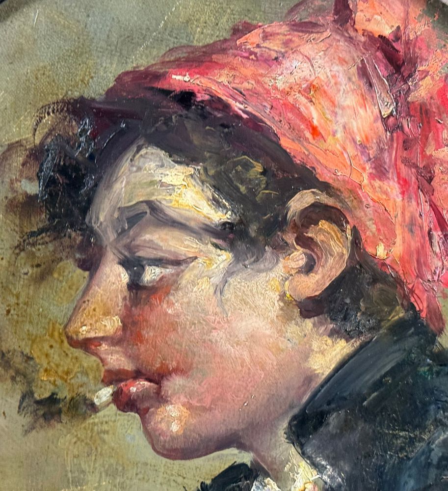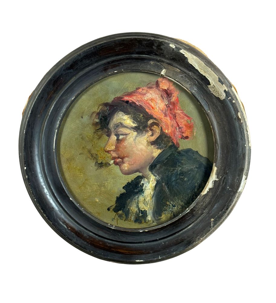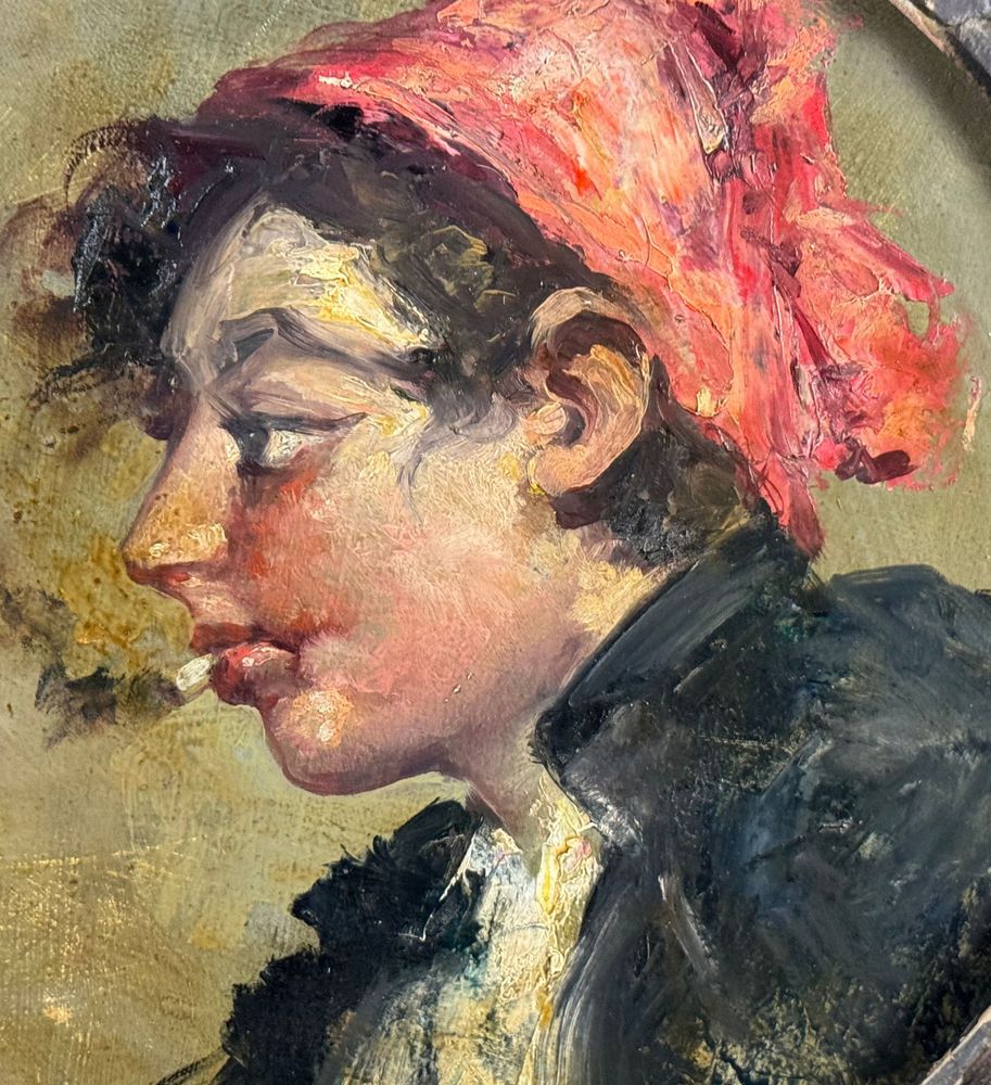 Dipinto olio su tela di forma tonda, periodo XX secolo scuola Italiana, raffigurante Scugnizzo napoletano. Dimensioni compreso cornice: 50x50 cm. Dimensioni interno cornice: 34x34 cm. Reca firma in basso a sinistra da Giardiello Giuseppe (1877 - 1920). Opera in buone condizioni. Cornice da restaurare.