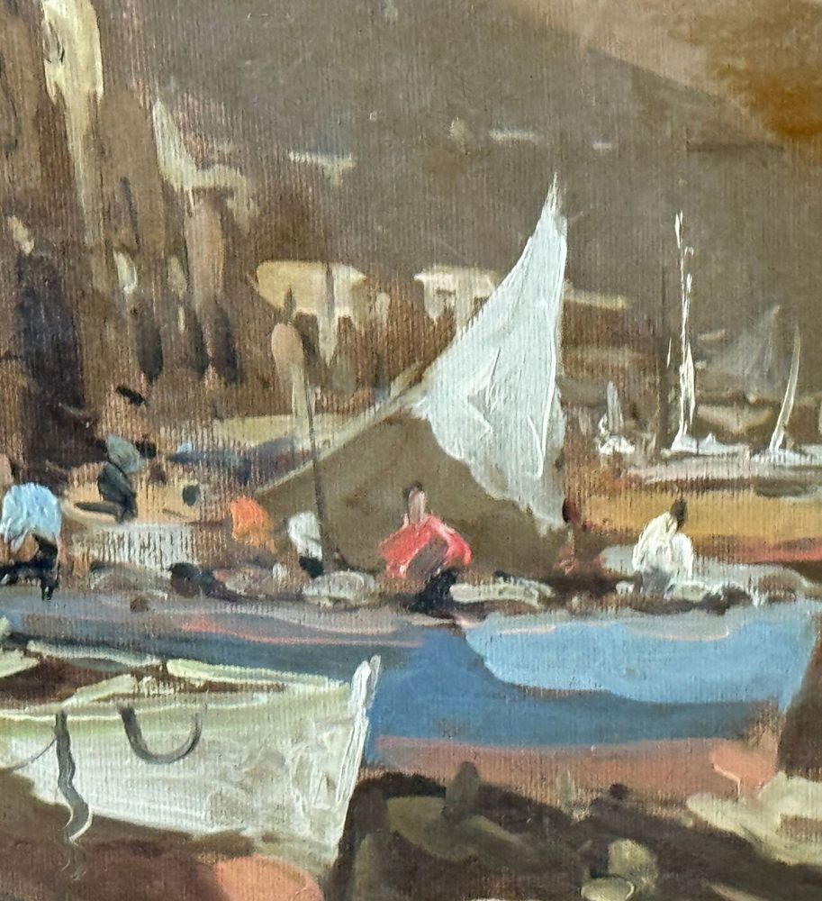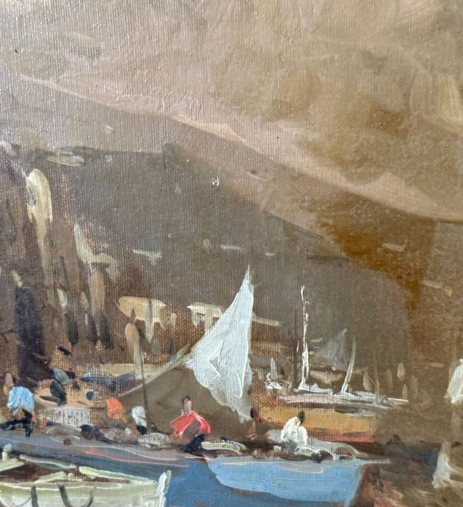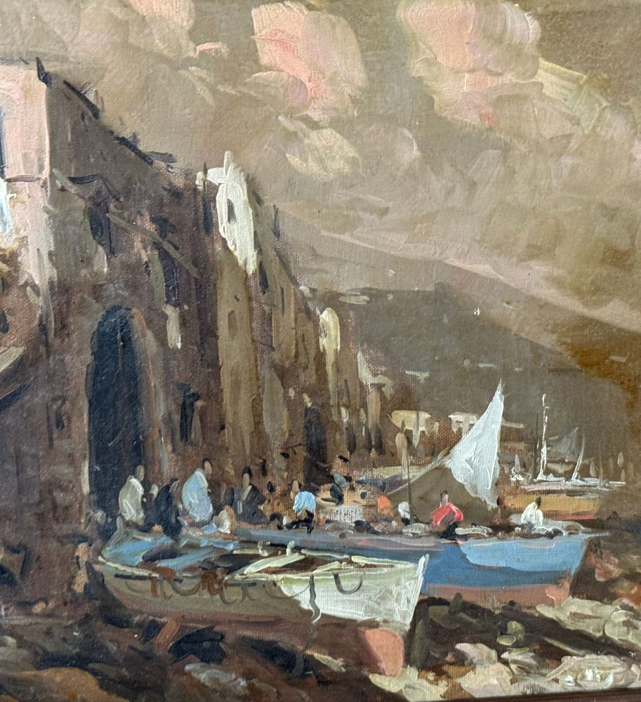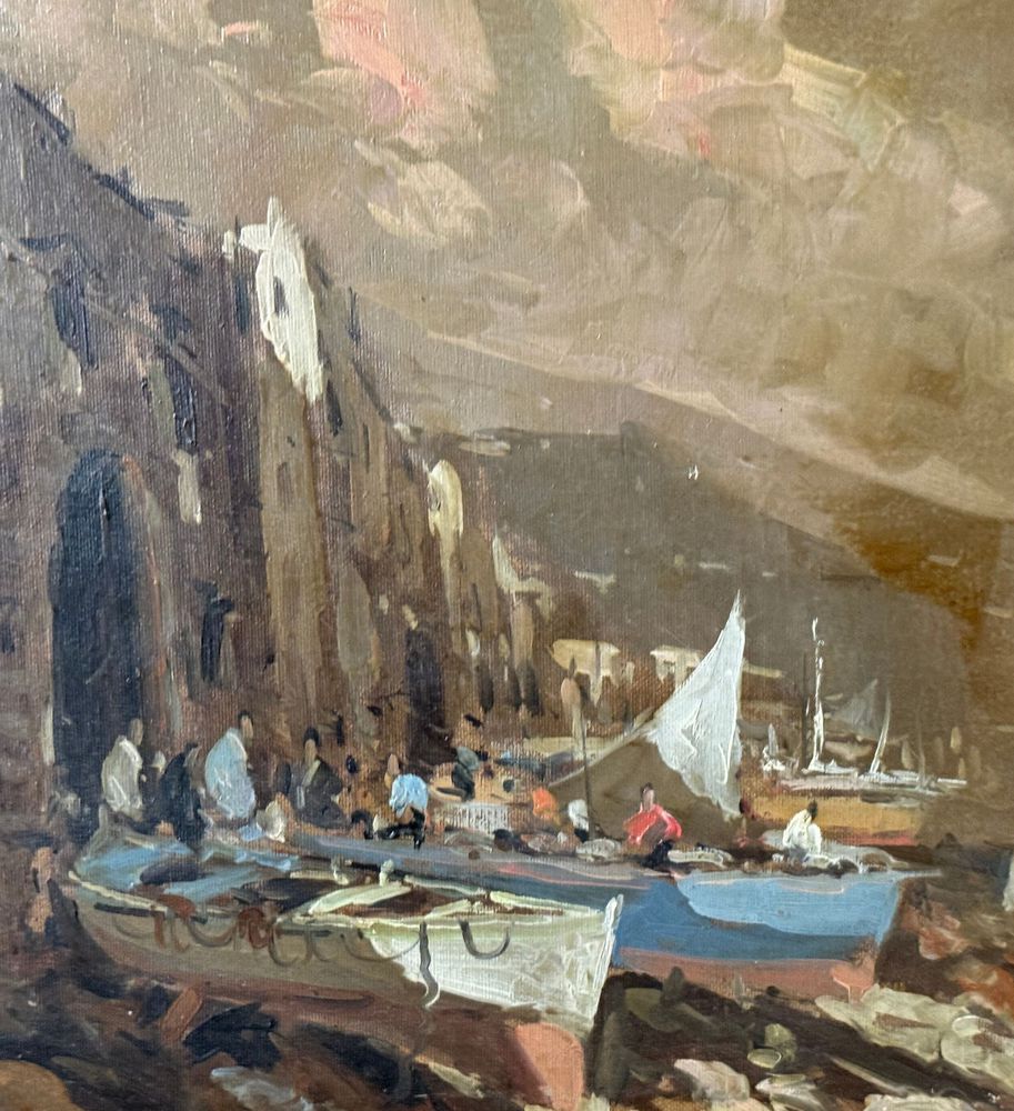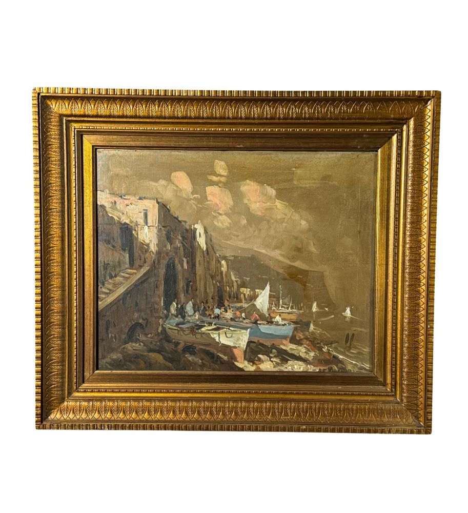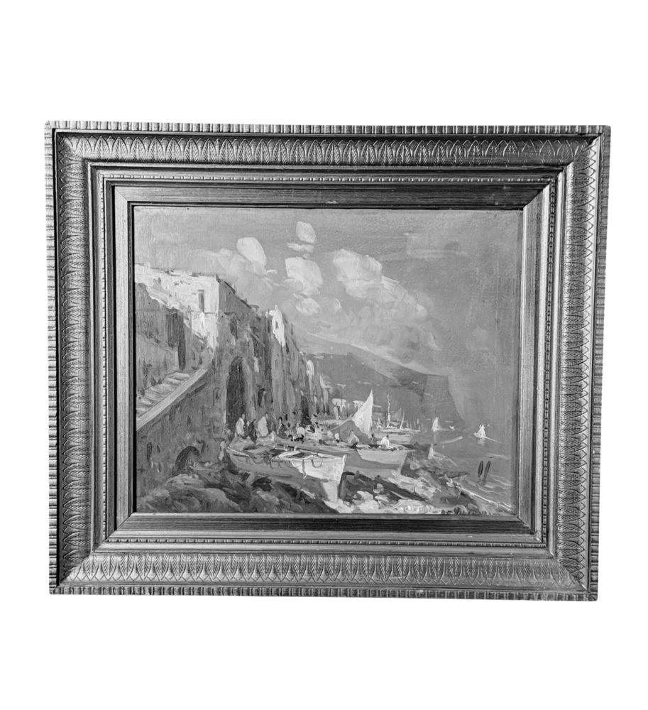 Dipinto olio su tela, periodo XX secolo scuola Italiana, raffigurante Scorcio di marina a Marechiaro. Dimensioni compreso cornice: 69,5x59,5 cm. Dimensioni interno cornice: 41,5x51,5 cm. Reca firma in basso a destra da De Vincenzi. Opera in buone condizioni.