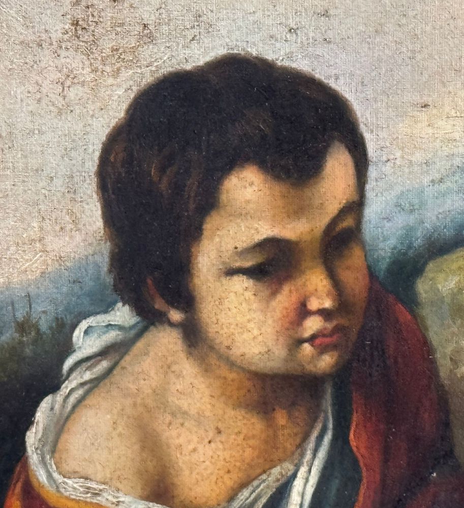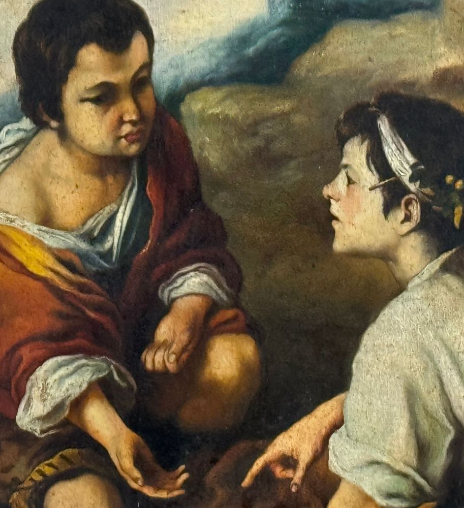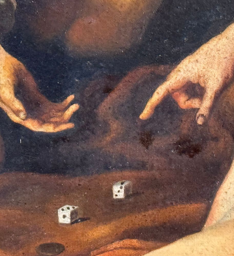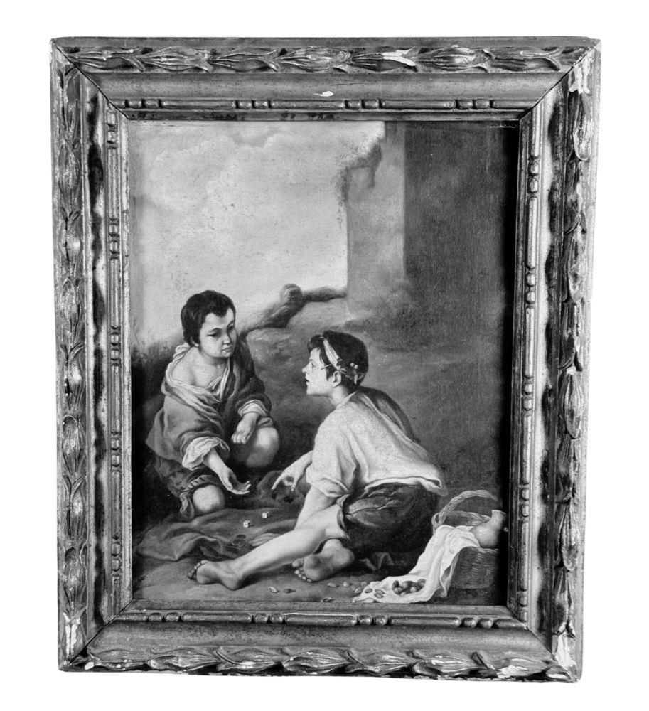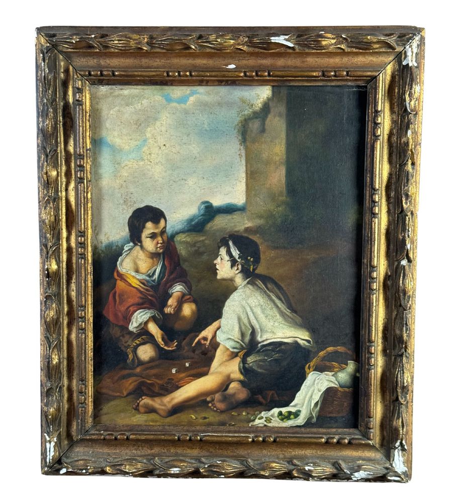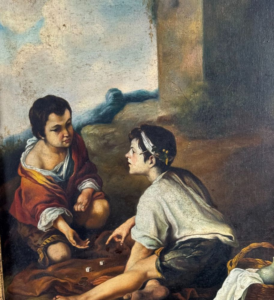 Dipinto olio su tela, periodo XIX secolo scuola Italiana, raffigurante I giochi dei dadi da Bartolomé Esteban Murillo. Dimensioni compreso cornice: 52x63 cm. Dimensioni interno cornice: 39x48 cm. Da artista anonimo. Opera in buone condizioni.