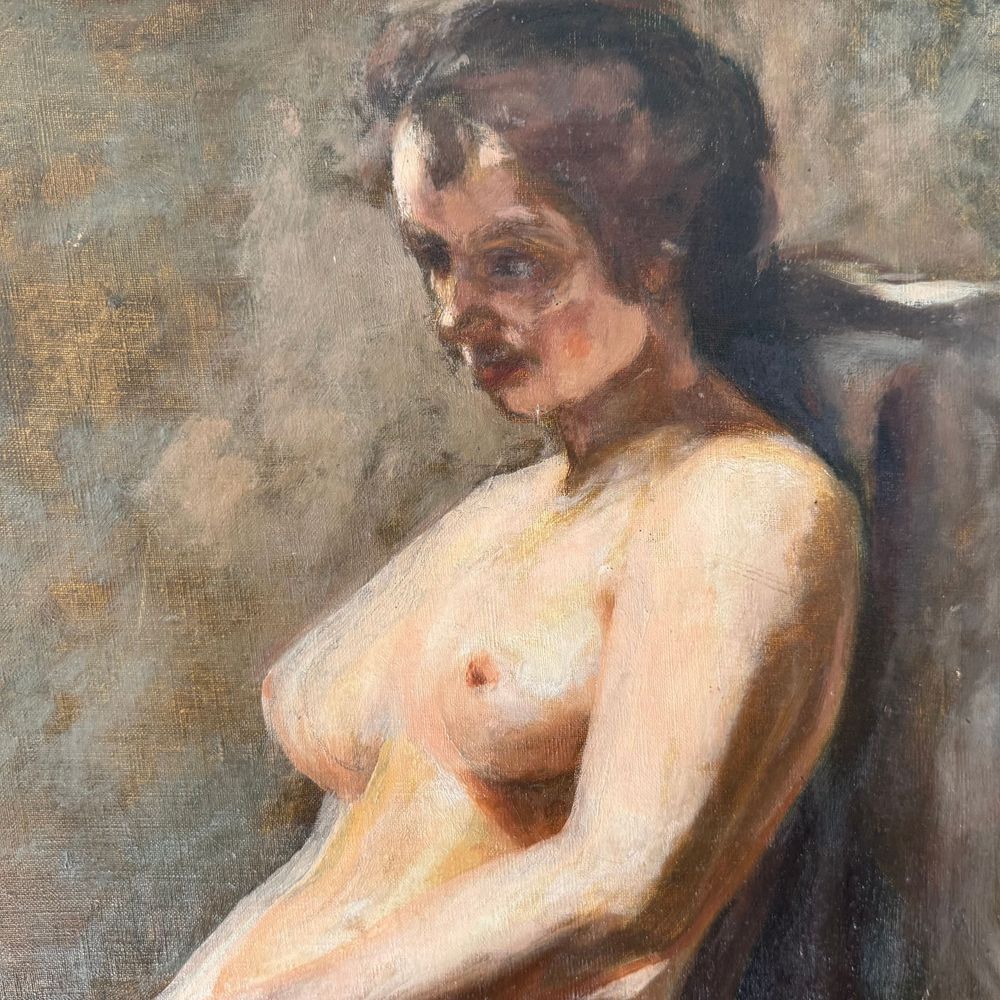 Dipinto olio su tela, periodo XIX/XX secolo raffigurante Nudo di donna seduta, attribuito a Gino Piccioni (1873 - 1941) Dimensioni interno cornice: 75,5 x 57 cm. Da artista anonimo.
