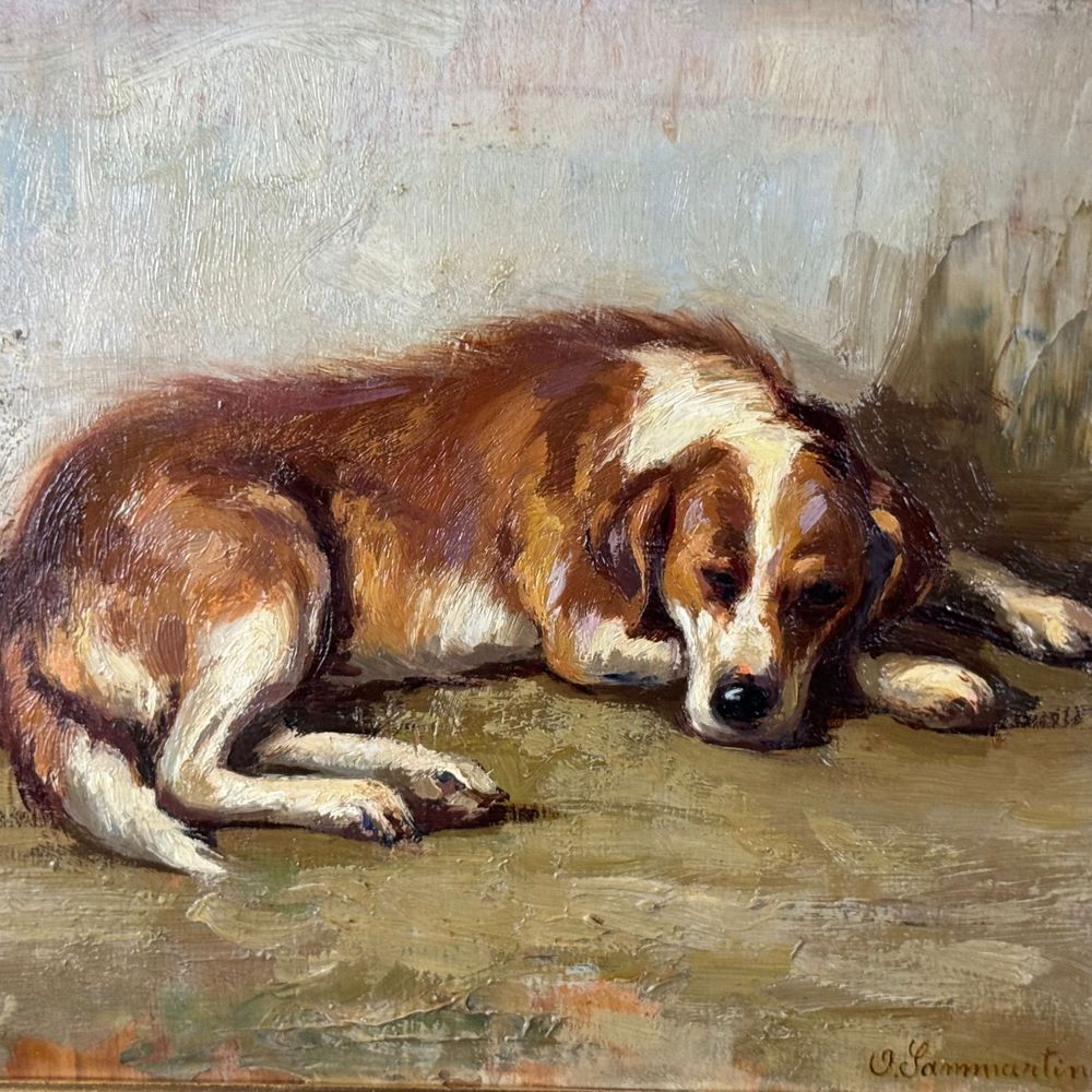 Dipinto olio su tavola, periodo XX secolo scuola Italiana, raffigurante Ritratto di un cane. Dimensioni interno cornice: 32x26 cm. Dimensioni compreso cornice: 49x43 cm. Reca firma in basso a destra da U. Sammartino. Opera in buone condizioni.