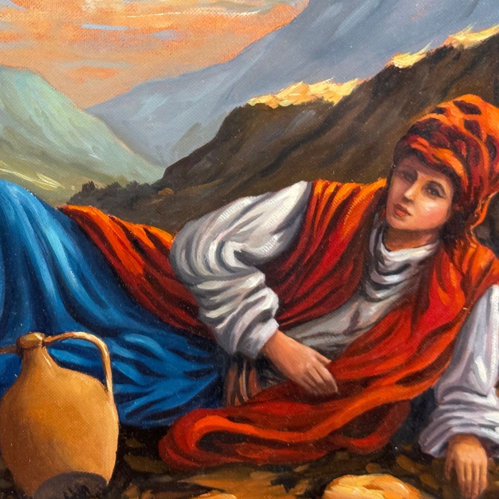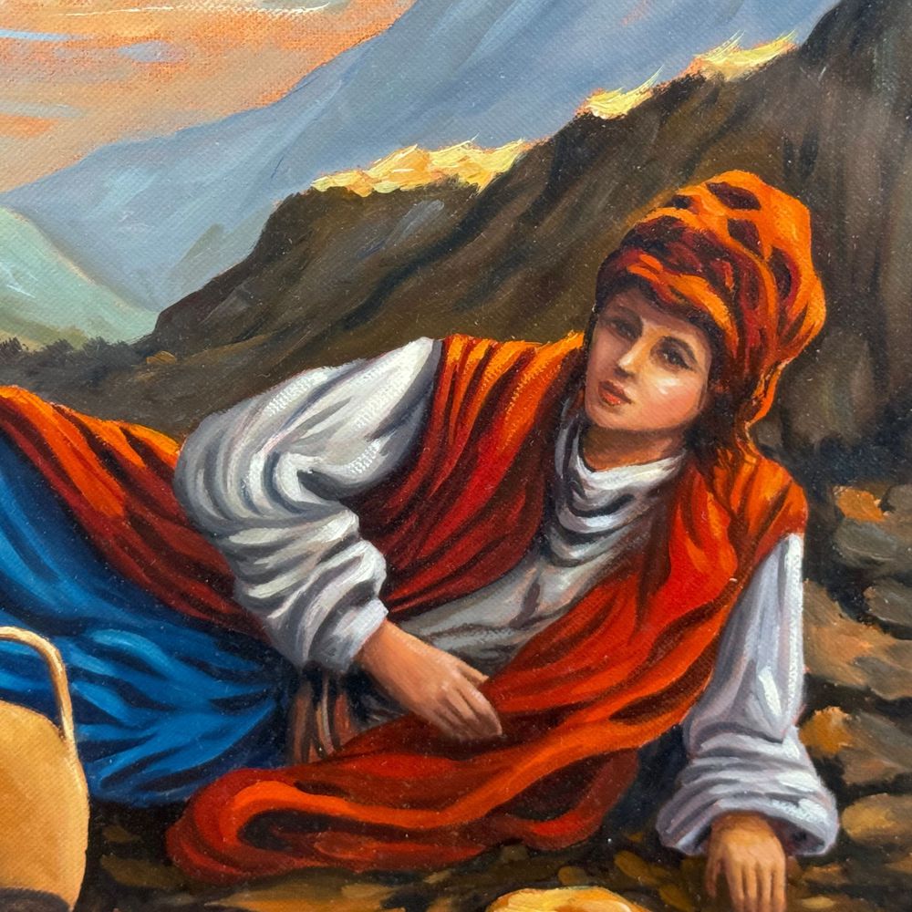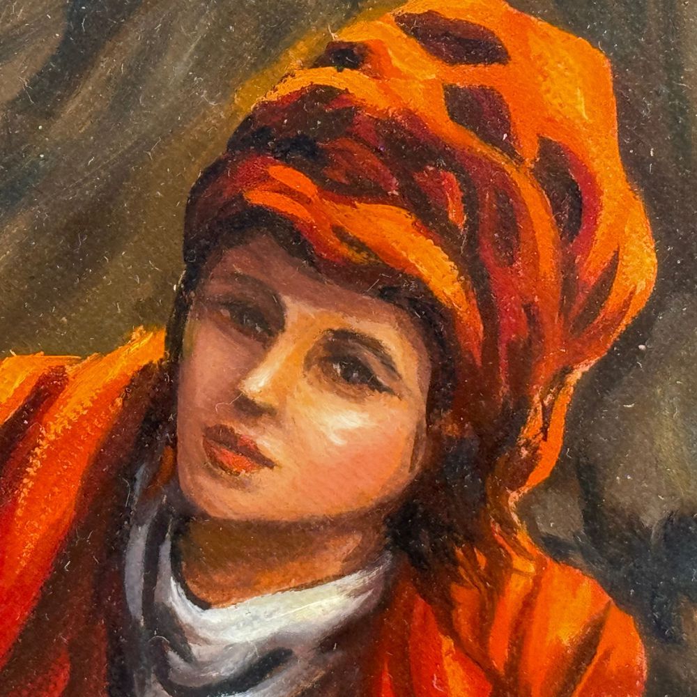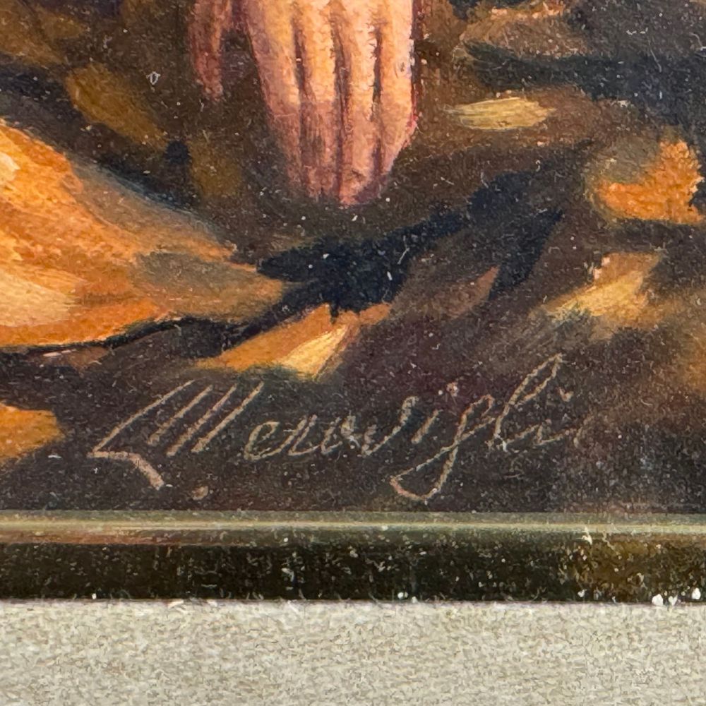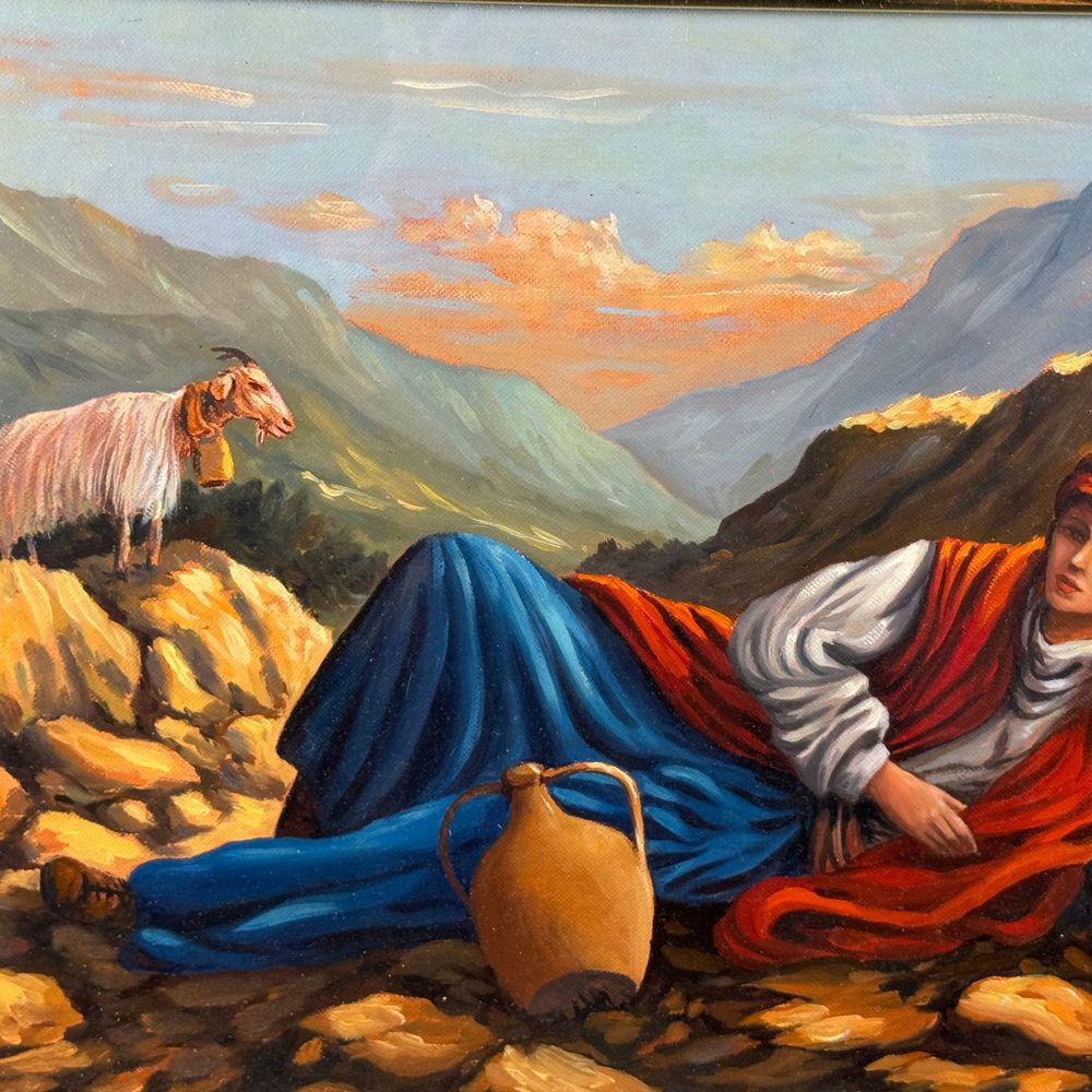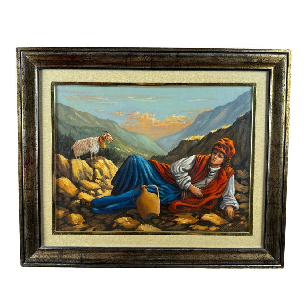 Dipinto olio su tela applicata su pannello, periodo XX secolo scuola italiana, raffigurante Pastore. Dimensioni interno cornice: 40x30 cm, dimensioni compreso cornice: 53x43 cm. Firma in basso a destra da Carmine Meraviglia (Napoli 1945). Opera in buone condizioni.