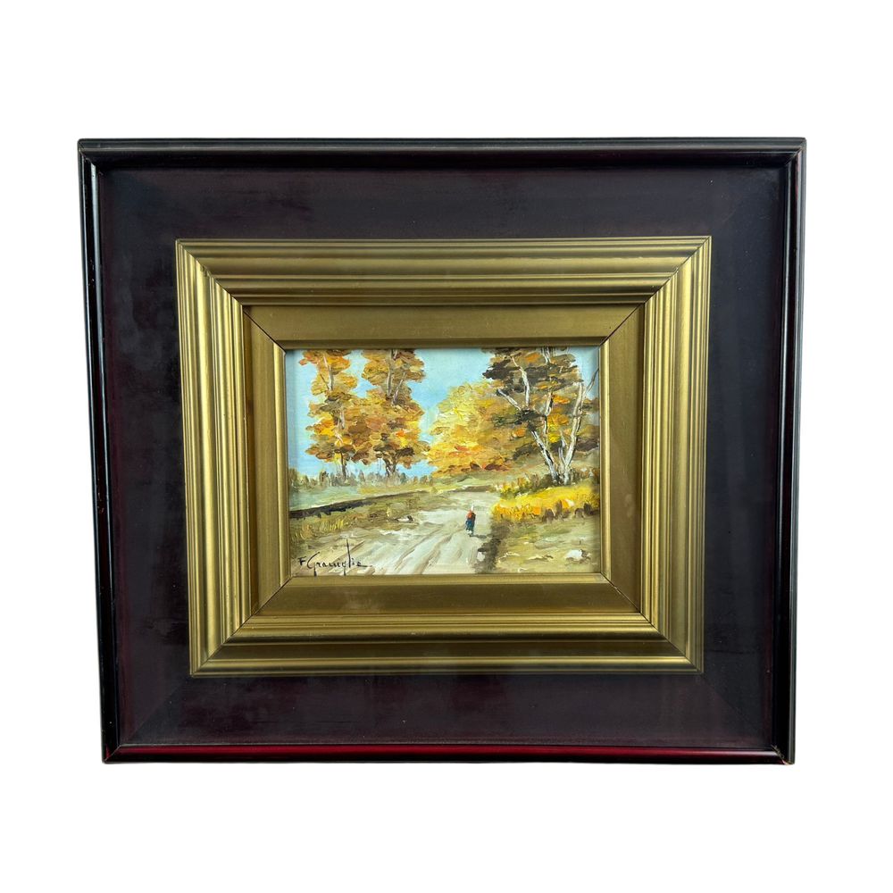 Dipinto olio su tavola, periodo XX secolo scuola Italiana, raffigurante Paesaggio con personaggi. Dimensioni interno cornice: 20x15 cm. Dimensioni compreso cornice: 44x38 cm. Reca firma in basso a sinistra da Francesco Graniglia (1912-2000). Opera in buone condizioni.