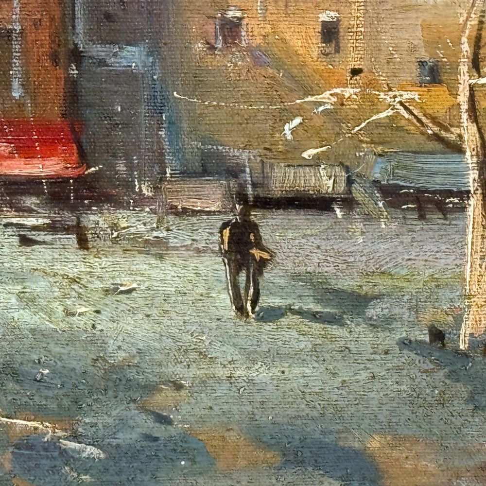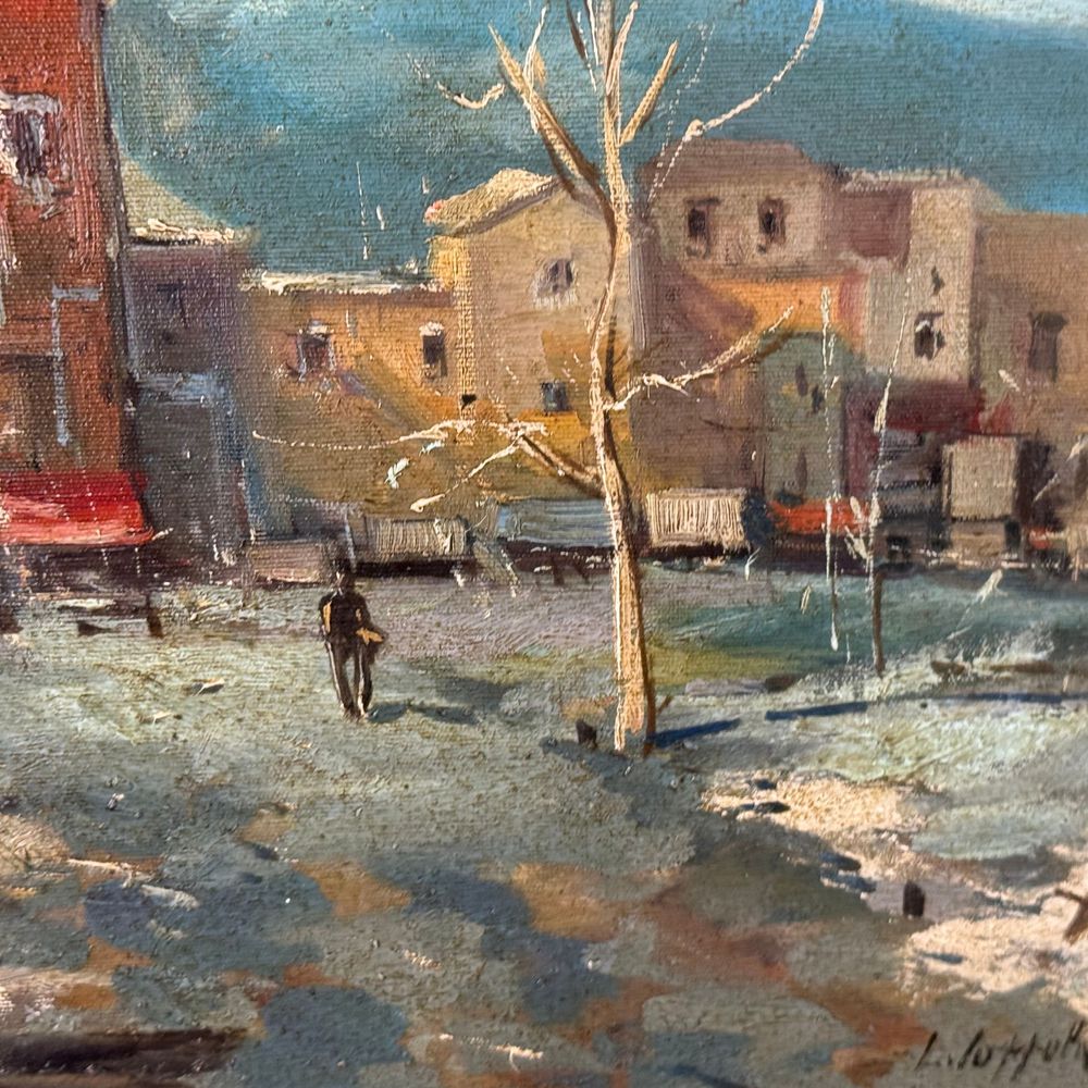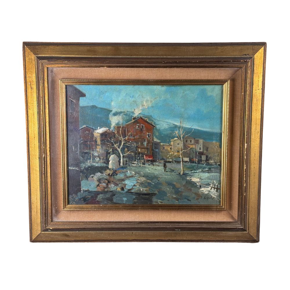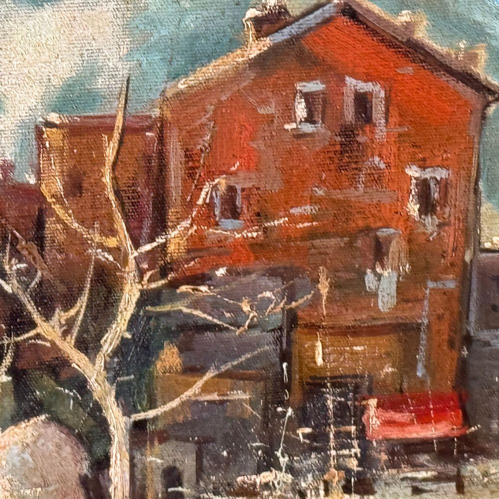 Dipinto olio su tela, periodo XX secolo scuola italiana, raffigurante Scorcio di periferia. Dimensioni interno cornice: 45x35 cm. Dimensioni compreso cornice: 67x57 cm. Reca firma in basso a destra da artista non identificato. Opera in buone condizioni.