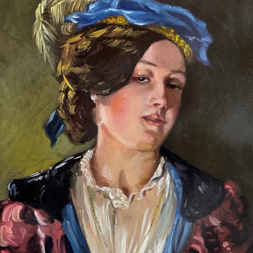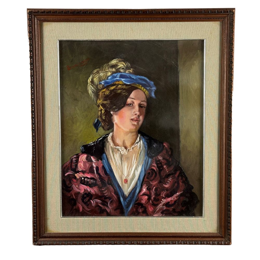 Dipinto olio su tela applicata su cartoncino, periodo XX secolo scuola Italiana, raffigurante Ritratto di donna. Dimensioni interno cornice: 40x50 cm. Dimensioni compreso cornice: 63x54. Reca firma in alto a sinistra da artista non identificato. Opera in buone condizioni.