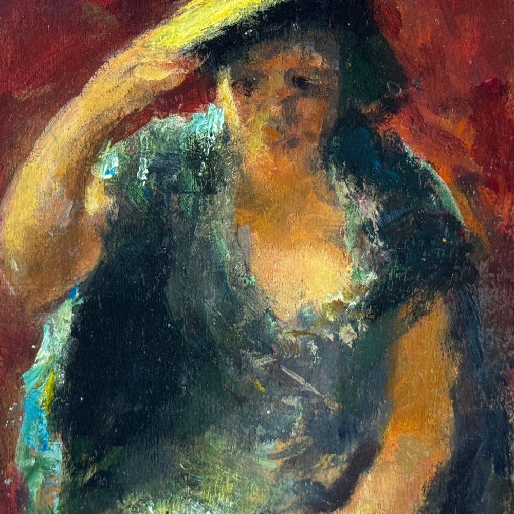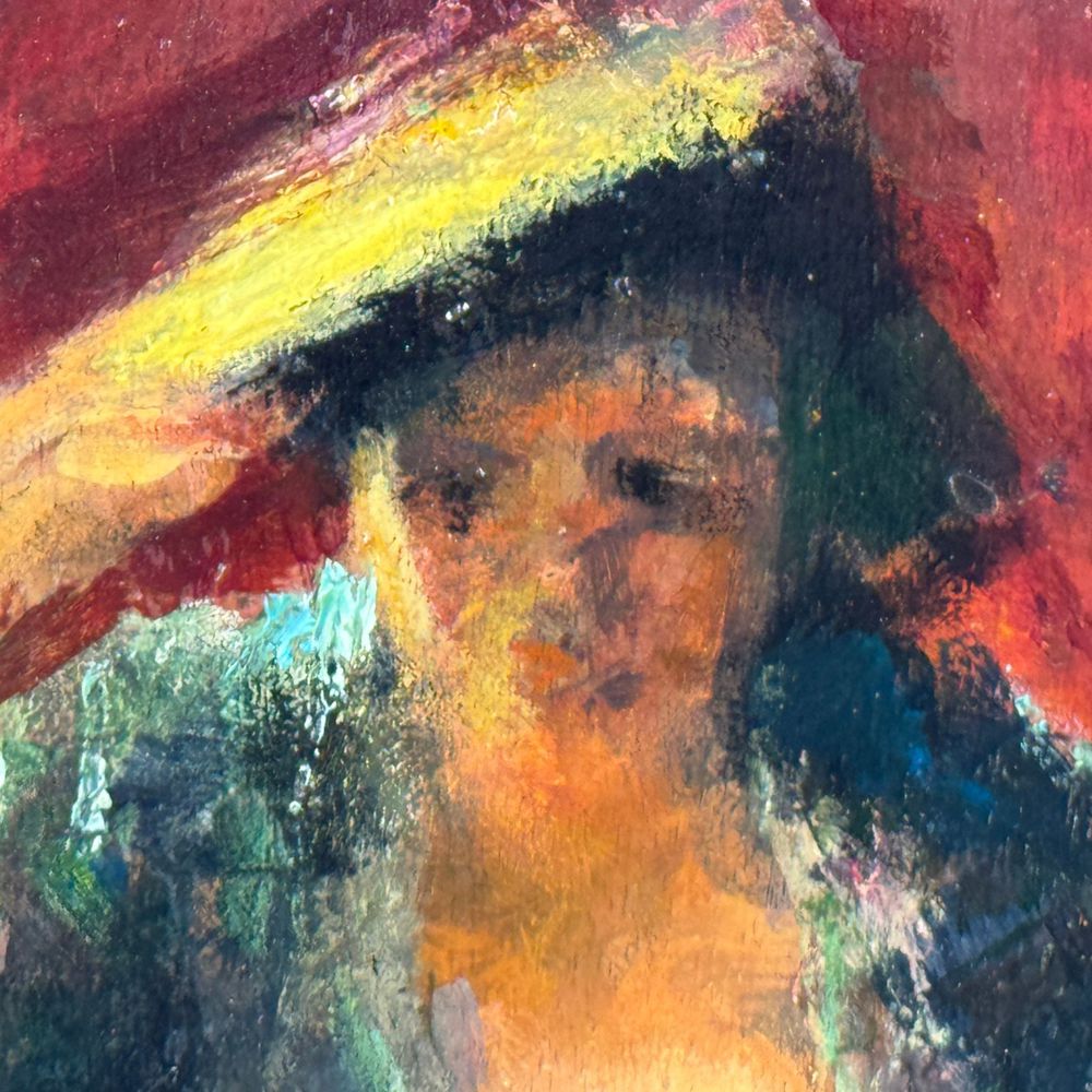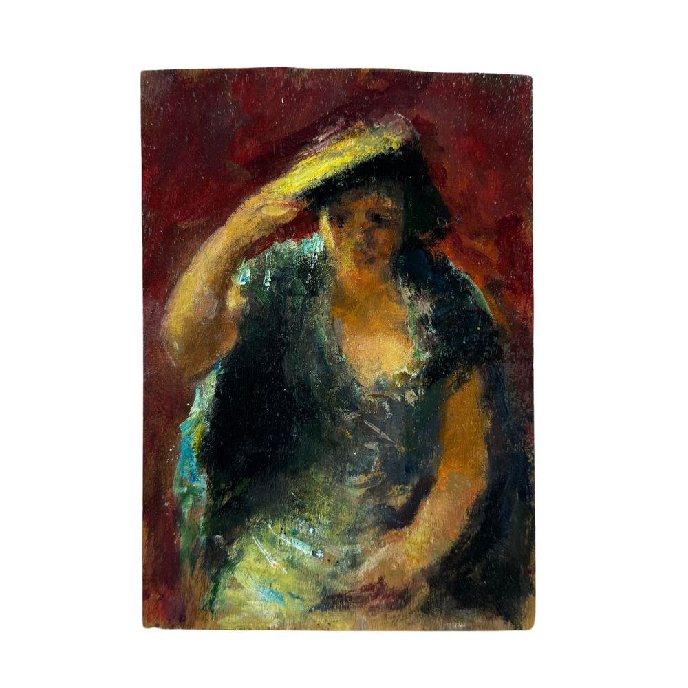 Dipinto olio su pannello, periodo XX secolo scuola Italiana, raffigurante Donna con cappello nella maniera impressionista. Dimensioni: 20x14 cm. Da artista anonimo. Opera in buone condizioni.