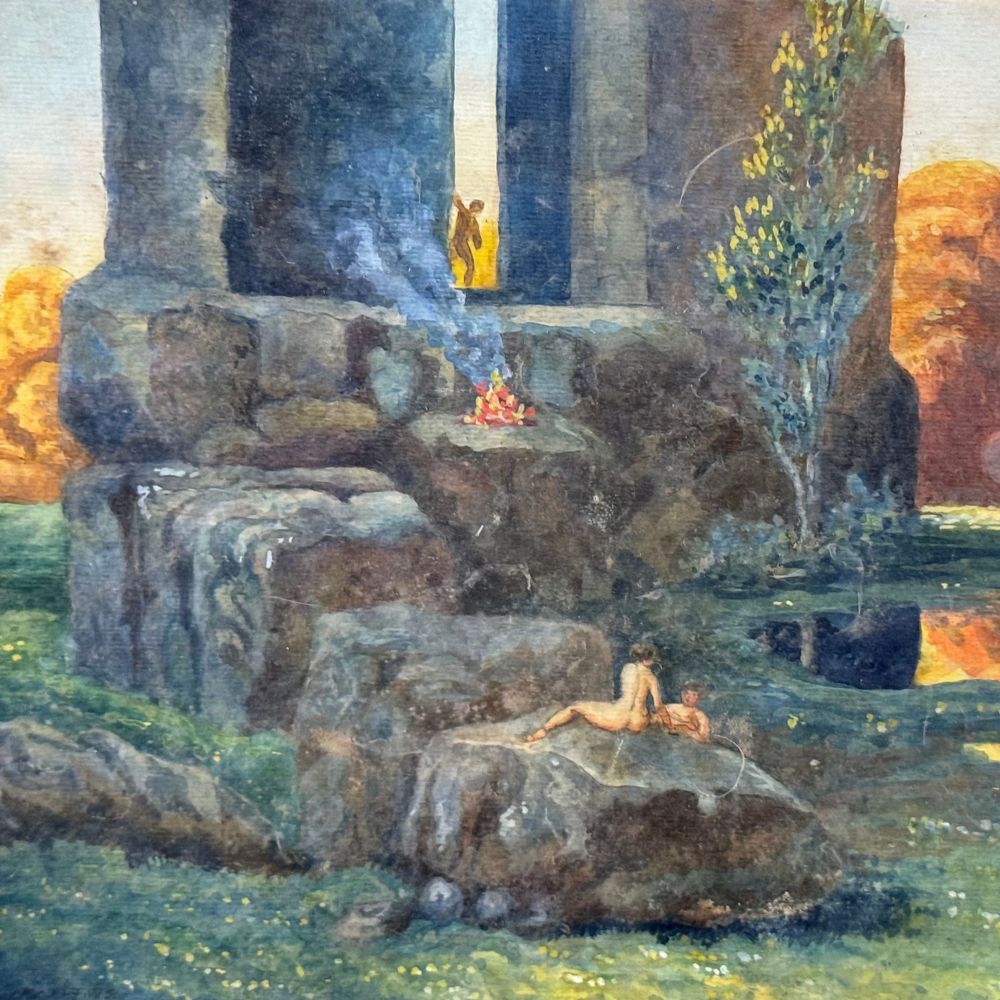 Dipinto acquerello su carta, periodo XIX/XX secolo scuola italiana, raffigurante Capriccio architettonico con personaggi (Pozzuoli). Dimensioni interno cornice: 27x17 cm. Dimensioni compreso cornice: 39x29 cm. Da artista anonimo. Opera in buone condizioni con lievi segni di vissuto come da foto allegate.
