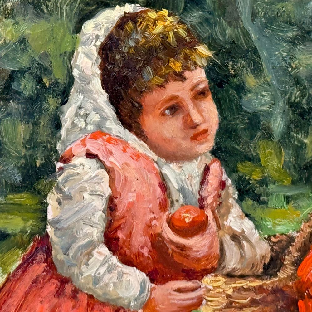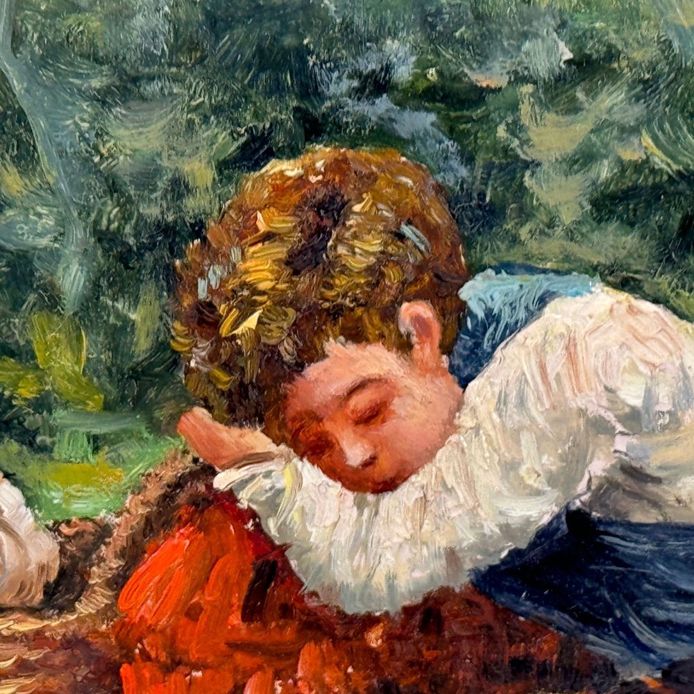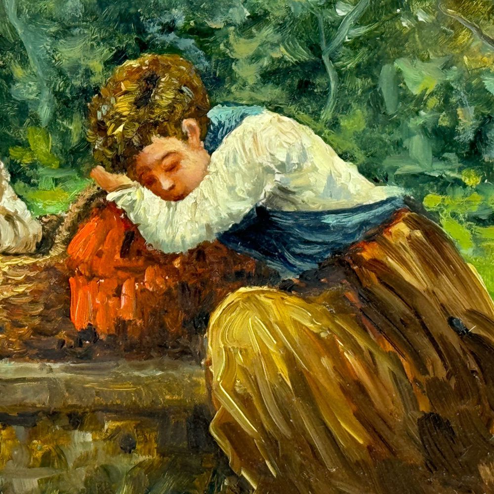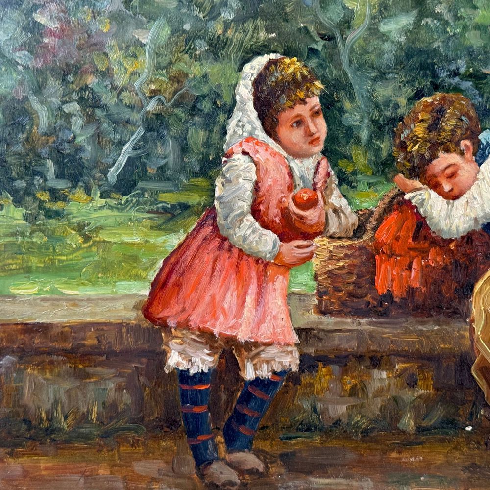 Dipinto olio su tavola, periodo XX secolo (1940 - 1950) scuola Italiana, raffigurante Bambini in giardino. Dimensioni: 40x30 cm. Da artista anonimo. Opera in buone condizioni e di ottima qualità artistica.