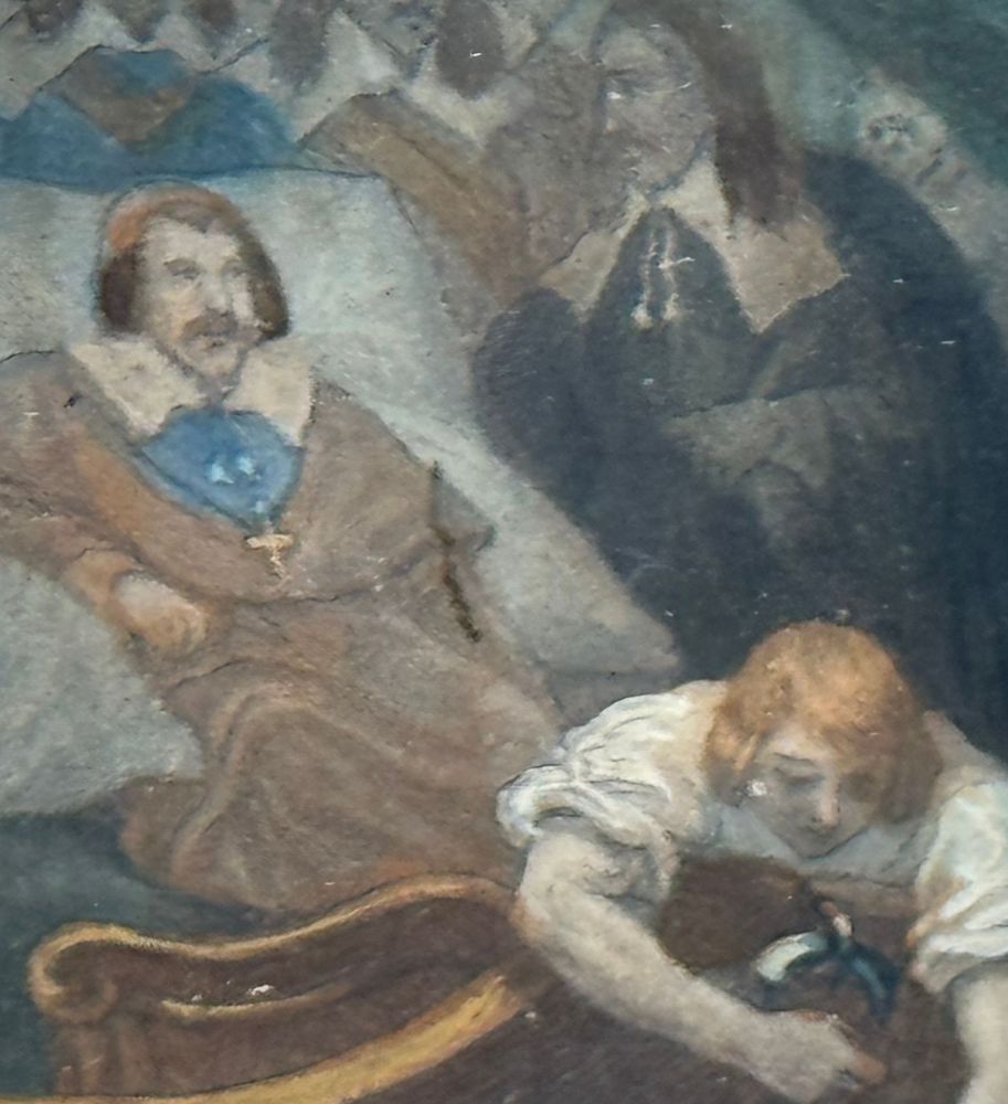Dipinto tecnica acquatinta colorata, periodo XIX secolo scuola Francese, raffigurante Cospirazione di Cinq-Mars. Dimensioni compreso cornice: 75x91 cm. Dimensioni interno cornice: 44x57 cm. Da artista anonimo. Opera in discrete condizioni come da foto allegate.