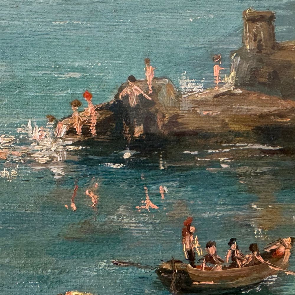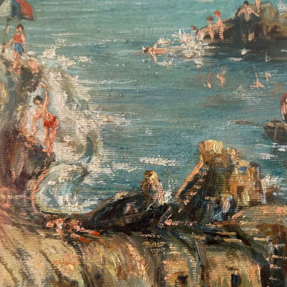 Dipinto olio su tela, periodo XX secolo raffigurante Scogliera. Dimensioni interno cornice: 20x30 cm. Siglato D.R in basso a destra.