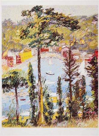 CASCELLA MICHELE Ortona a Mare 1892 - 1989 Portofino litografia p.a. 100x70 firma in basso a destra tiratura in basso a sinistra