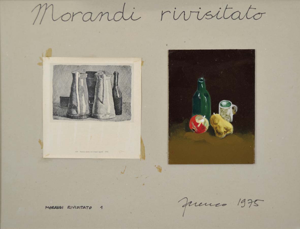SARENCO Brescia 1945 Morandi rivisitato 1975 tecnica mista e collage su cartoncino 53x68 firma e data in basso a destra titolo in basso a sinistra Autentica dell'Autore su foto