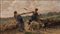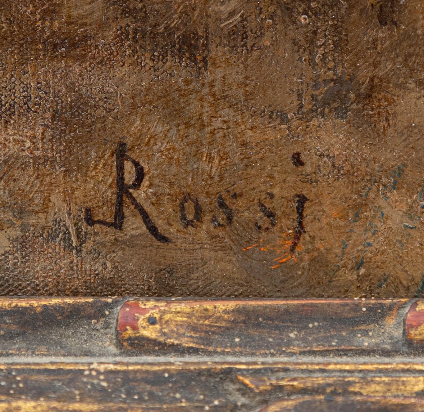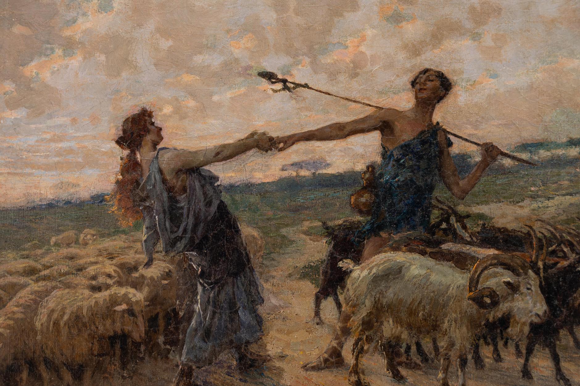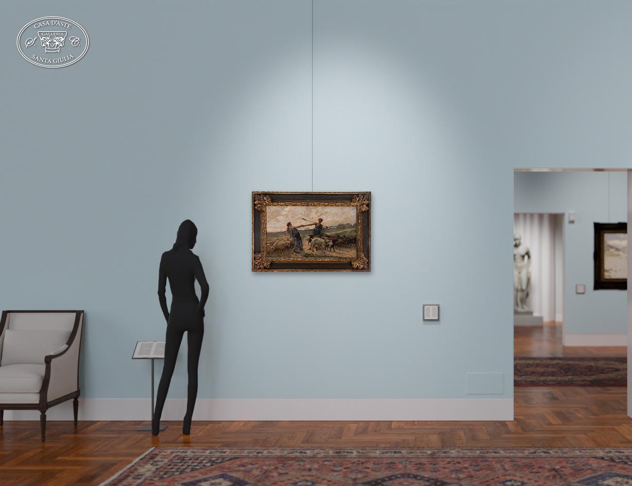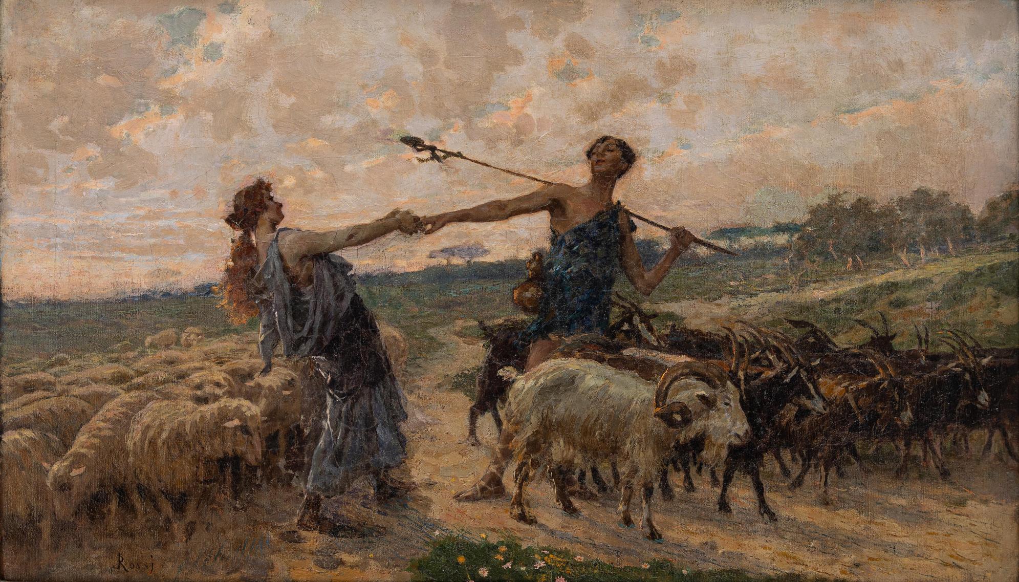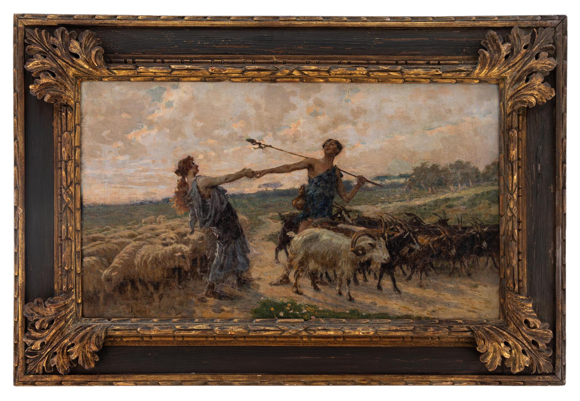 Luigi Rossi - Amori pastorali - Lugano 1853-1923 - Olio su tela cm 44x75 - Il pittore Luigi Rossi nacque a Castagnola presso Lugano il 10 marzo 1853. Morto a Sala Capriasca il 6 agosto 1923. Studiò alla milanese Accademia di Brera, allievo diGiuseppe Bertini, di Francesco Valaperta e di Luigi Riccardi, e rapidamente si conquistò fama con "La questua infruttuosa", primo dipinto esposto (1874); "Una via di Milano"; "In assenza dei padroni"; "La scodella rotta"; "La distrazione" e "Il fratellino ammalato"; cosicchè i suoi quadri furono cercati e apprezzati. Il pittore Luigi Rossi trattò, con pennellata sicura, colore equilibrato, tecnica robusta, soggetti di genere secondo la moda del tempo; ma eseguì anche molti paesaggi di montagna, nei quali rievocò con nostalgia d'artista le Alpi native. Recatosi a Parigi nel 1885, si segnalò come brioso illustratore di romanzi francesi, come «Tartarin sur les Alpes» di Alfonso Daudet. Nel 1890 era a Berna. Sue opere figurarono, sino agli ultimi anni di vita dell'artista, alle principali mostre: a Parigi, nel 1889 "La polenta", riesposto a Londra nel 1916; nel 1892, "Alba"; nel 1898, "Il mosto", che attualmente è conservato con "La preghiera del mattino" nella Galleria d'Arte Moderna di Milano. Poi alla Esposizione Internazionale di Milano (1906) apparvero i suoi quadri "Casa abbandonata"; "La vita"; "L'alzaia"; "Ritratto di signora" e "Primi raggi", alla Mostra del Cinquantenario in Roma (1911), i due dipinti "Il mercato (Lago di Lugano)" e "Arcobaleno"; alla Biennale Veneziana del 1912, "Cerere" e "Plein air"; a quella del 1914, "Le ranette" e "La valle", alla Quadriennale di Torino del 1919, "Miraggio"; alla Biennale Veneziana del 1920, "La pianura"; alla successiva "Le castagne"; alla Quadriennale torinese del 1923, "La famiglia del contadino". Il Museo Civico di Torino conserva il suo lavoro "Passeggiata domenicale sulle coste dell'Atlantico". Altre opere sono nei Musei di Berna, di Ginevra e dl Berlino. Citansi anche del Rossi: "Ritratto del generale Sirtori"; "Dopo la luna di miele"; "La vigna del maestro"; "La carovana del pittore"; "Il giullare"; "L'abate galante"; "Sogni di giovinezza"; "Il ritorno al paese natio".Note biografiche tratte dal Dizionario Illustrato dei Pittori, Disegnatori ed Incisori Italiani A.M. Comanducci.