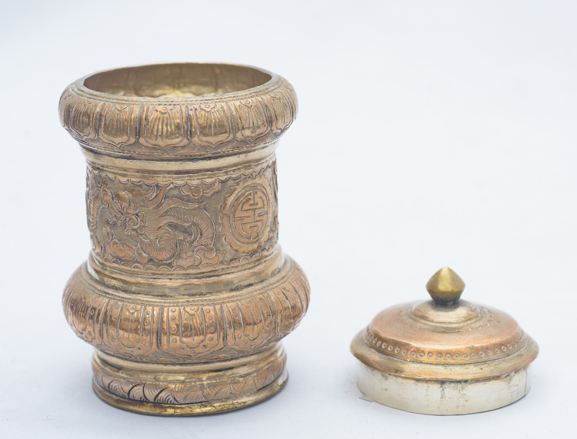 Due scatole in metallo sbalzato Manifattura orientale, XIX secolo 10 x 6 cm - 7 x 8 x 5 cm