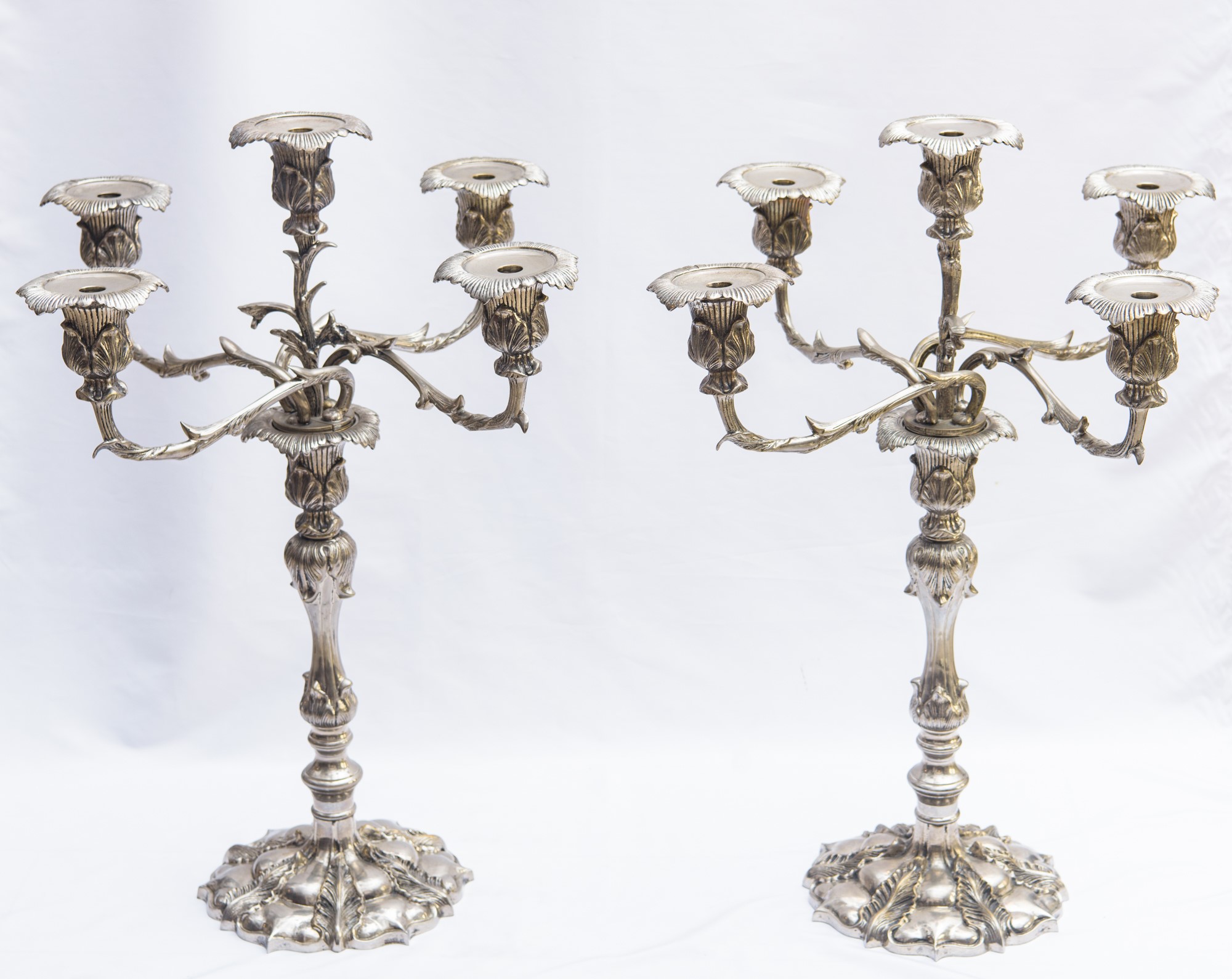 in metallo argentato, a 5 luci, con decori a motivi di ramage e fogliame