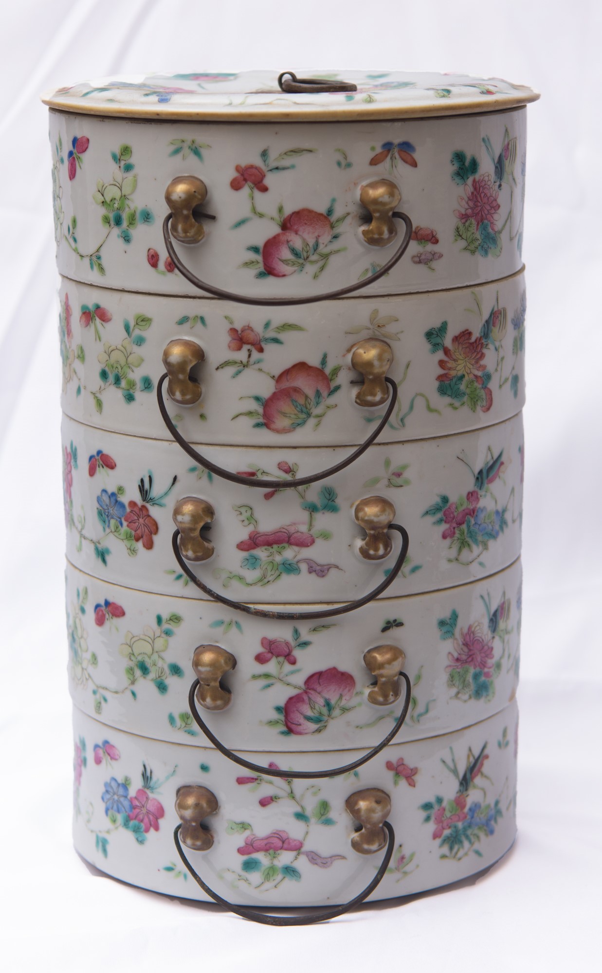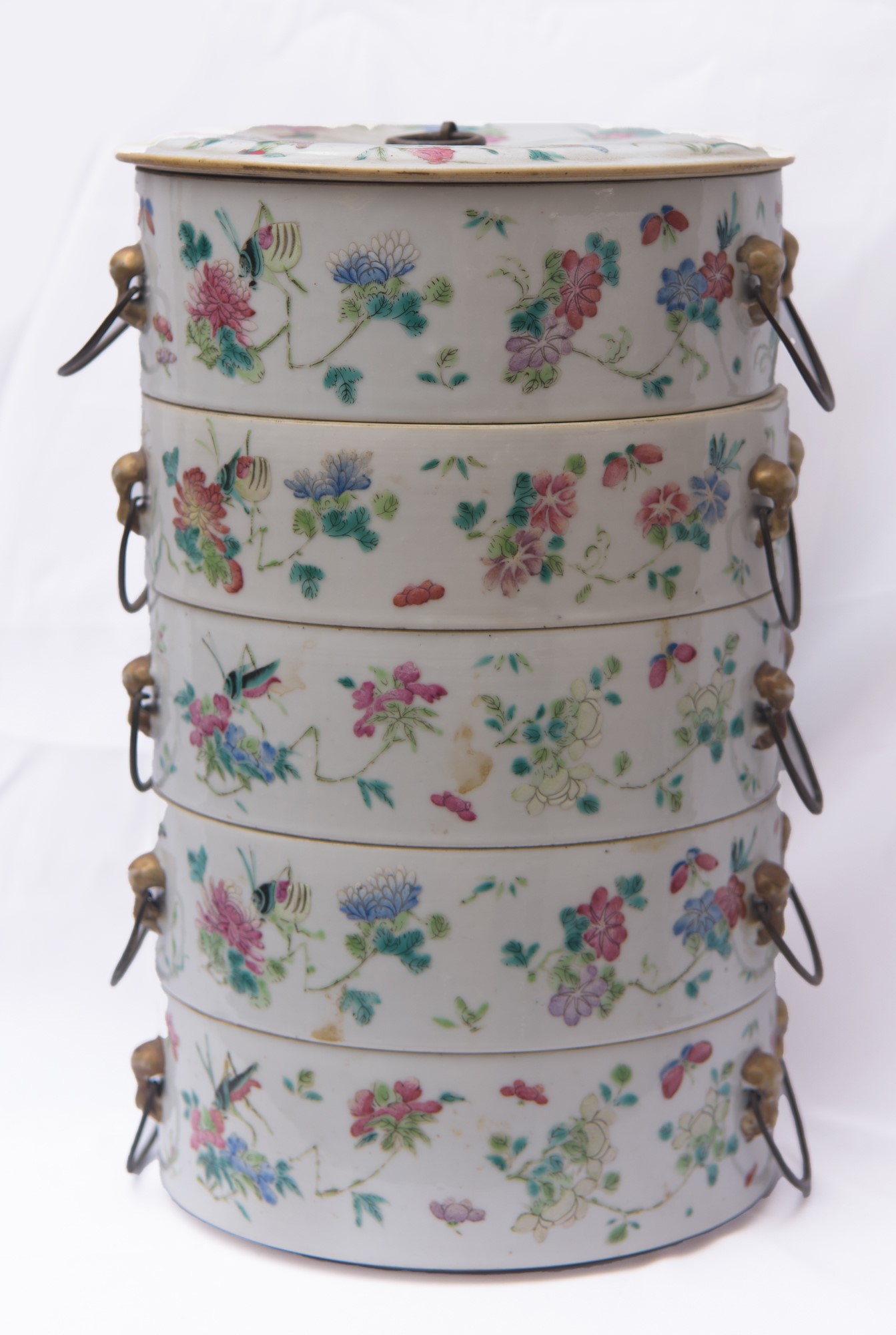 composto da cinque contenitori. In porcellana decorata a motivi floreali e animali, con manici in ferro.