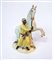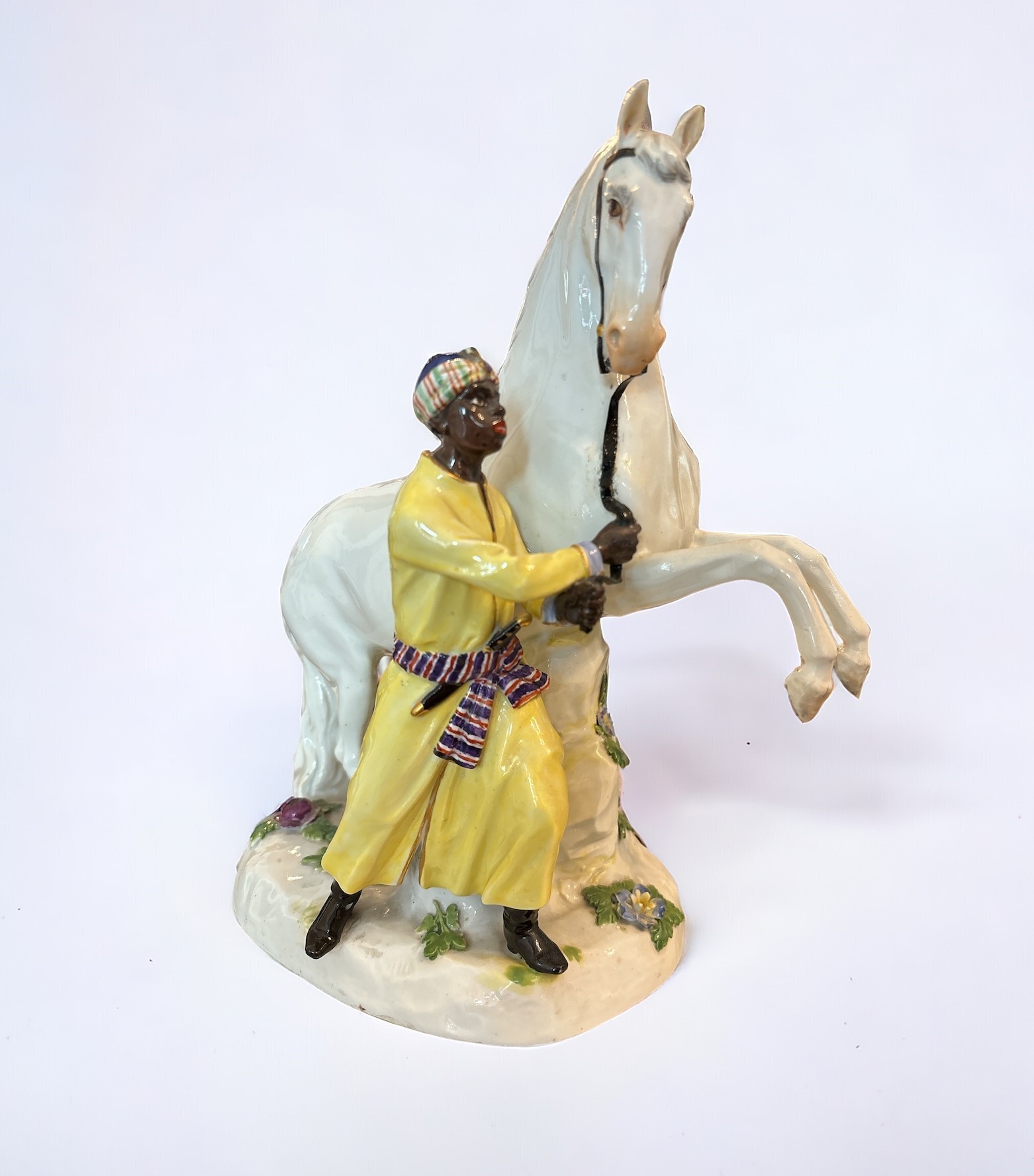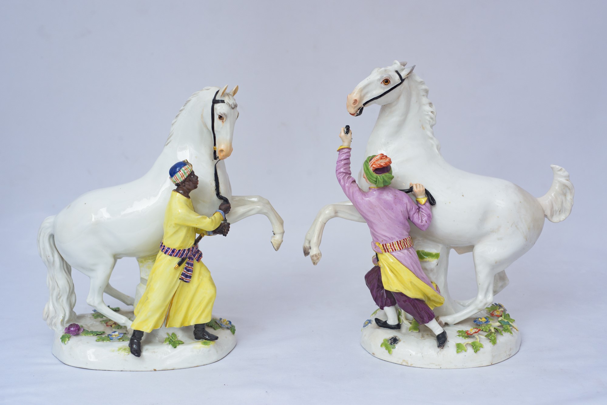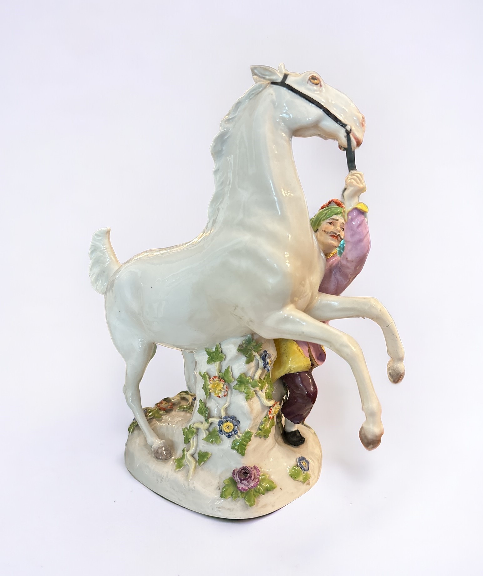 raffiguranti un domatore che tiene per le briglie un cavallo bianco in ascesa, su base ovale con tronco ricoperto di viticci di fiori, dipinto in policromia, porcellana Meissen, stampigliate alla base.