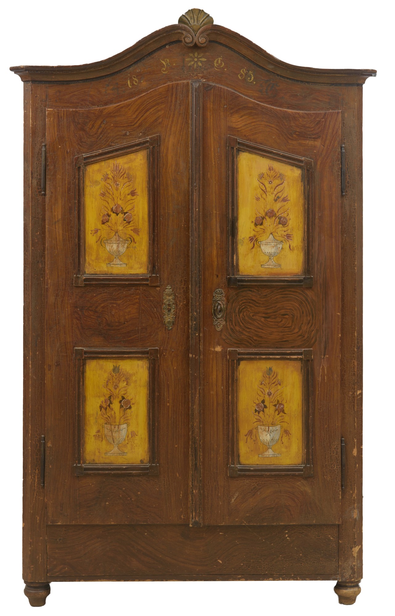 a due ante in legno laccato e decorato, con formelle a fondo giallo e decorazioni floreali.