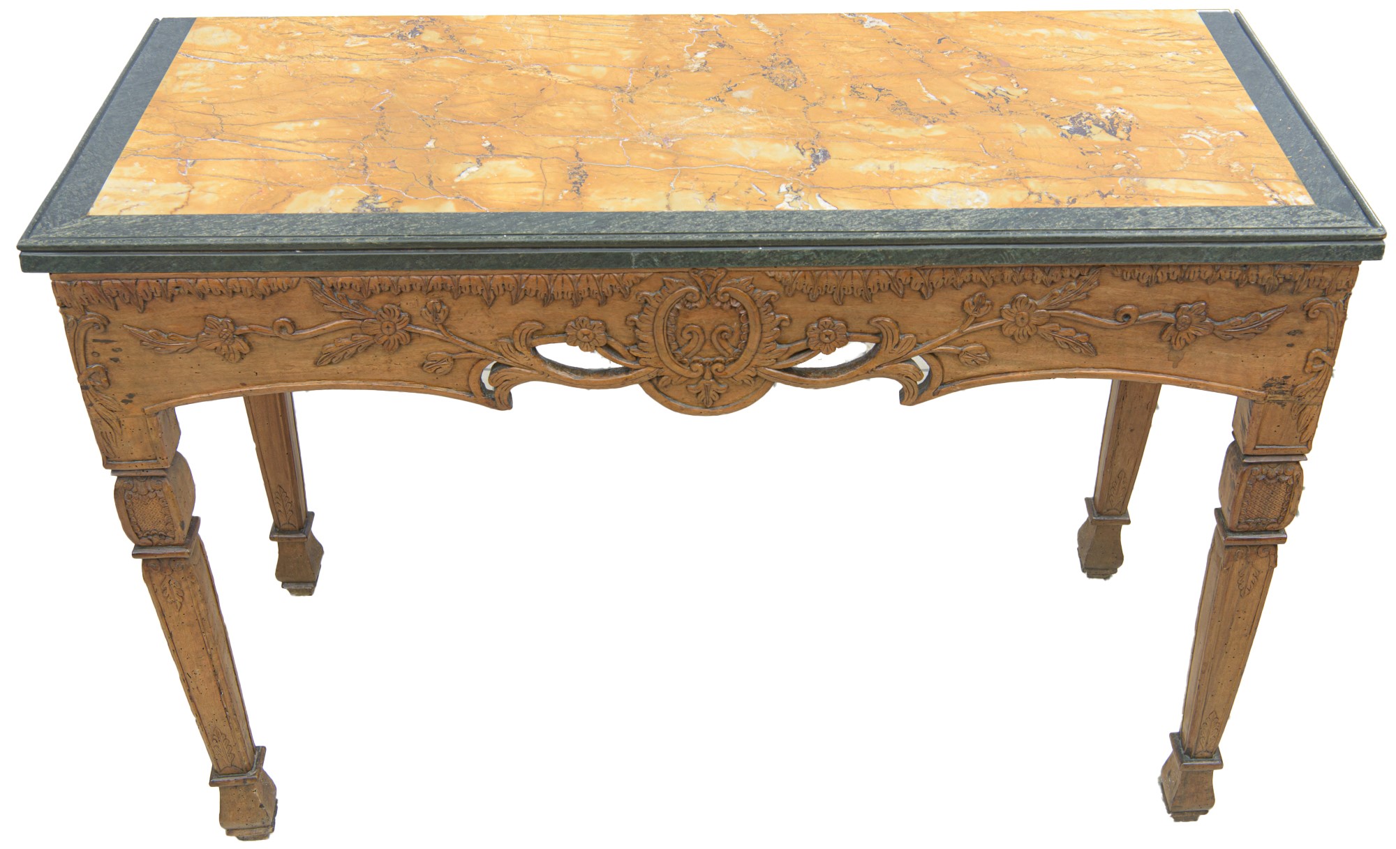 a quattro piedi in legno di ciliegio intagliato, con piano superiore in marmo giallo di Siena e fascia laterale Verde Alpi