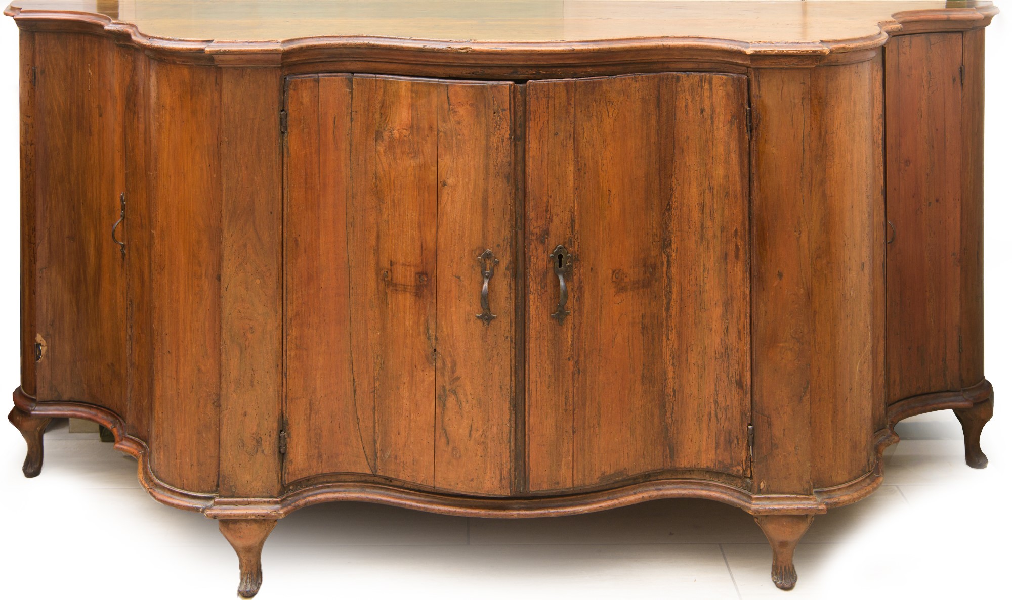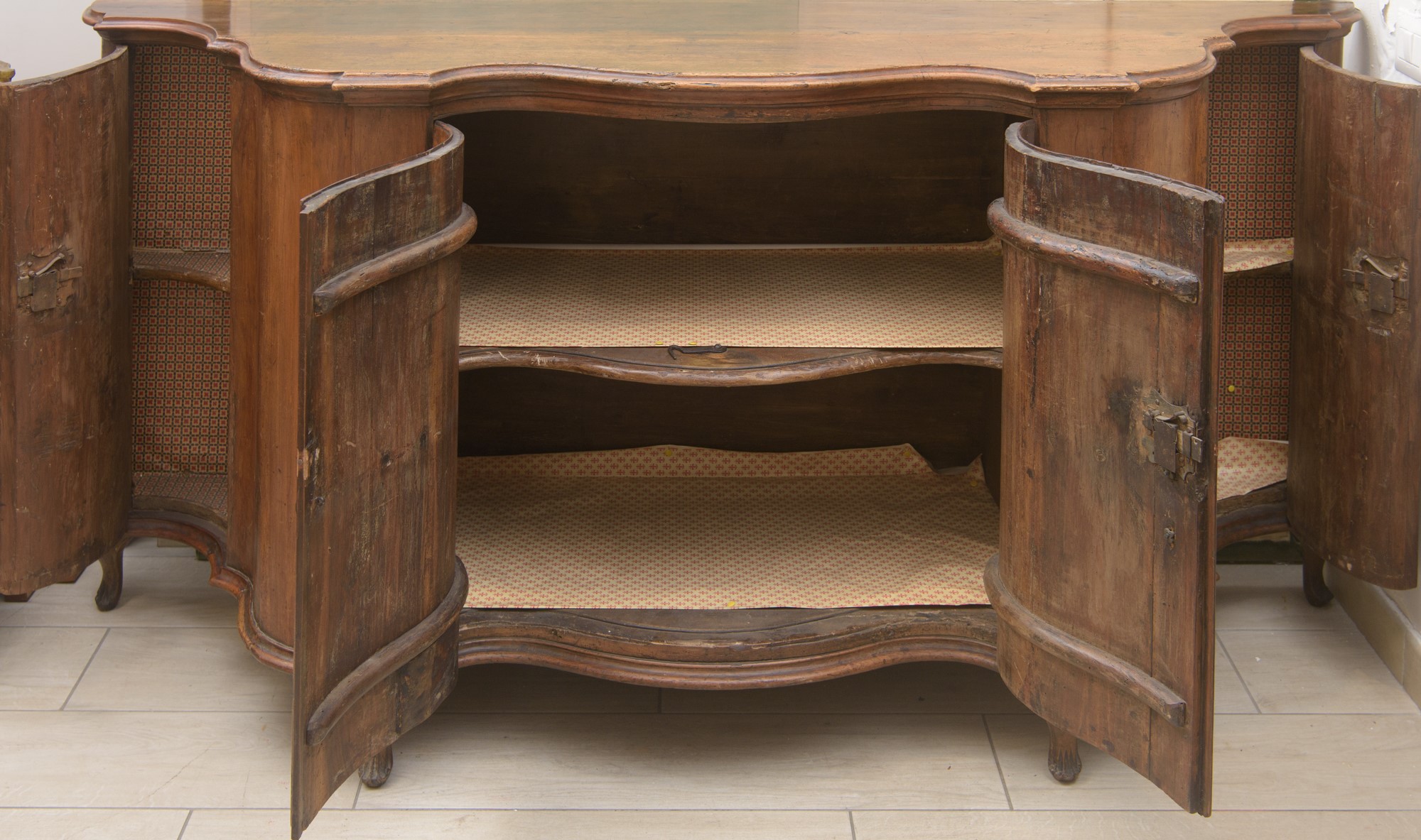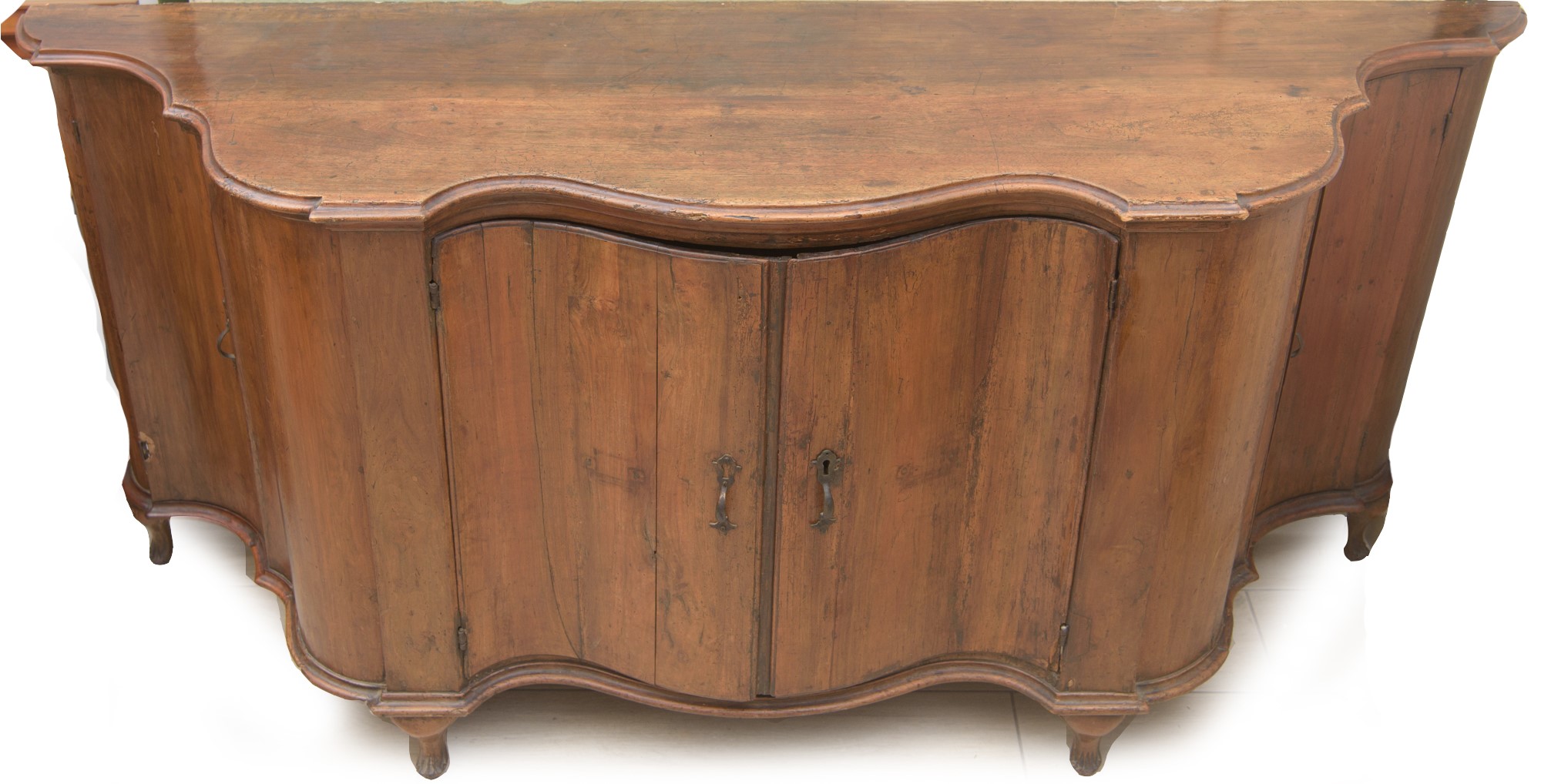 in legno di noce, quattro sportelli. Fianchi laterali con doppia bombatura, piano a carattere. Periodo del Barocchetto Veneziano, metà XVIII secolo.