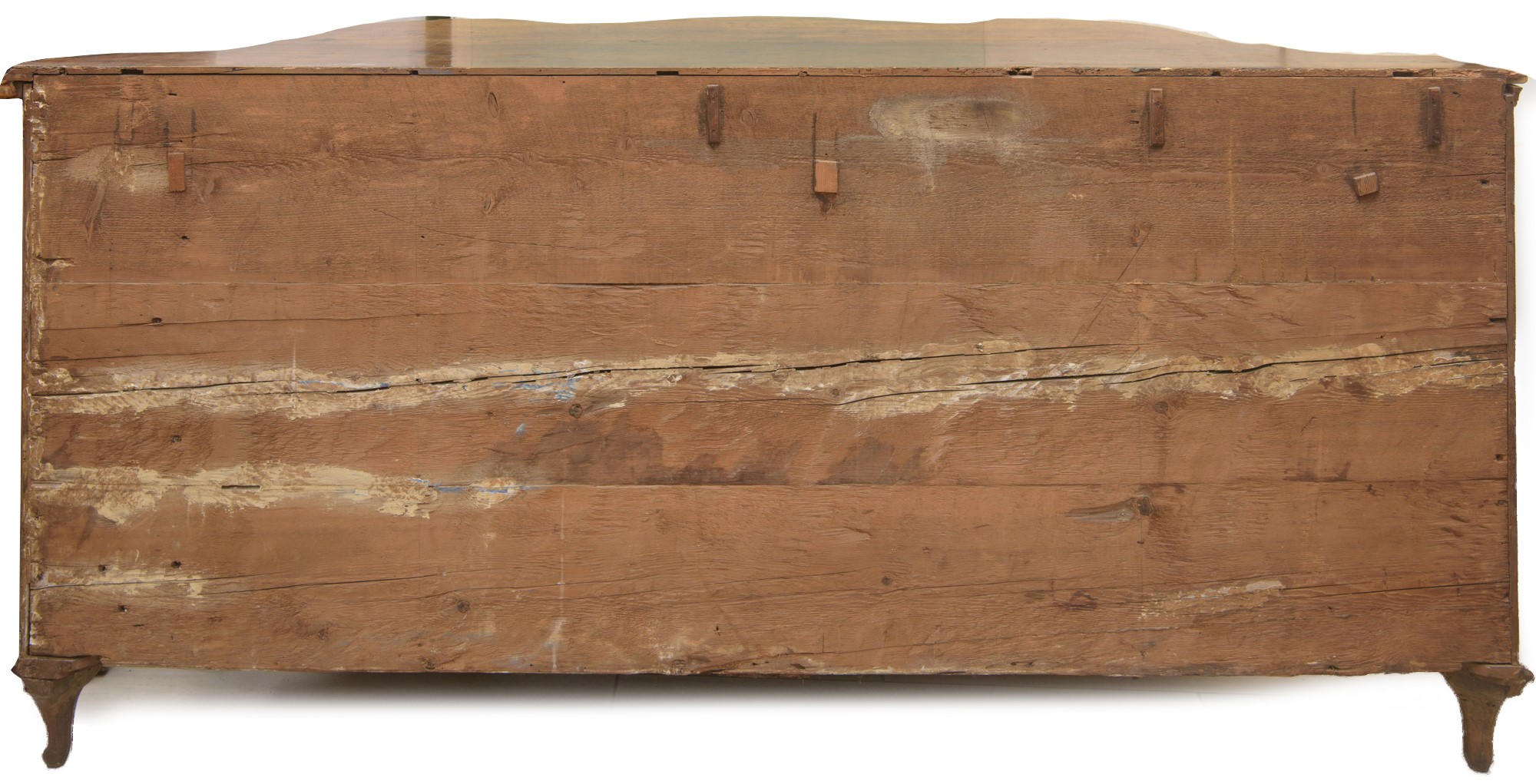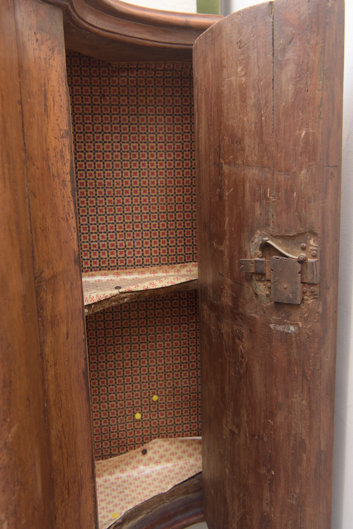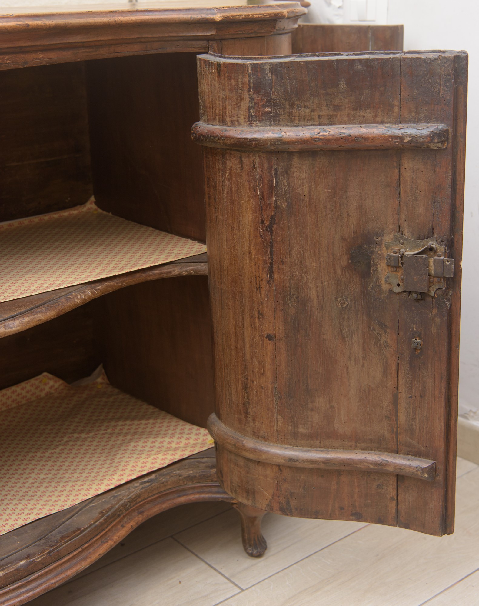 in legno di noce, quattro sportelli. Fianchi laterali con doppia bombatura, piano a carattere. Periodo del Barocchetto Veneziano, metà XVIII secolo.