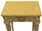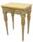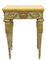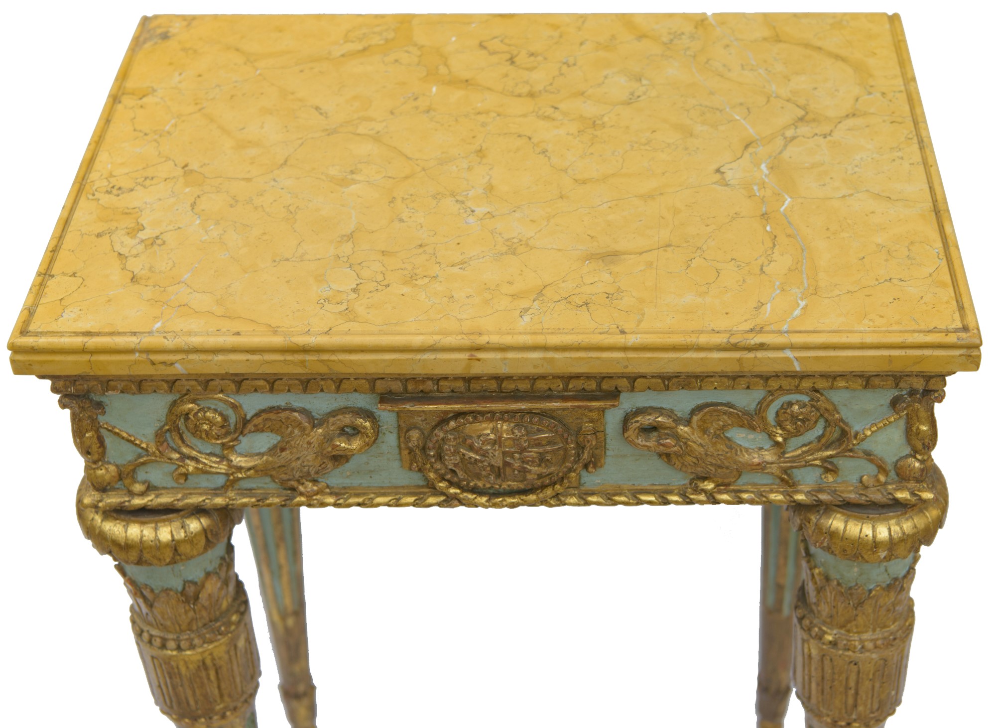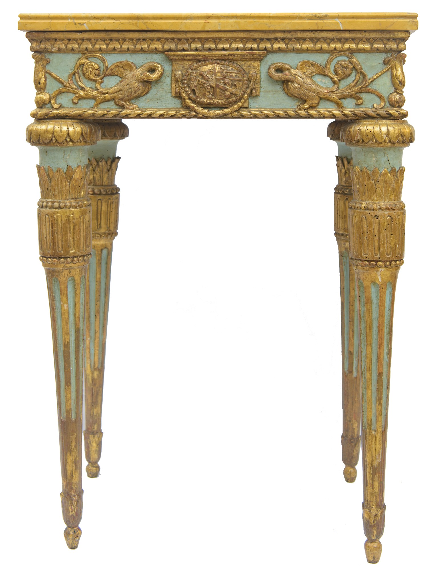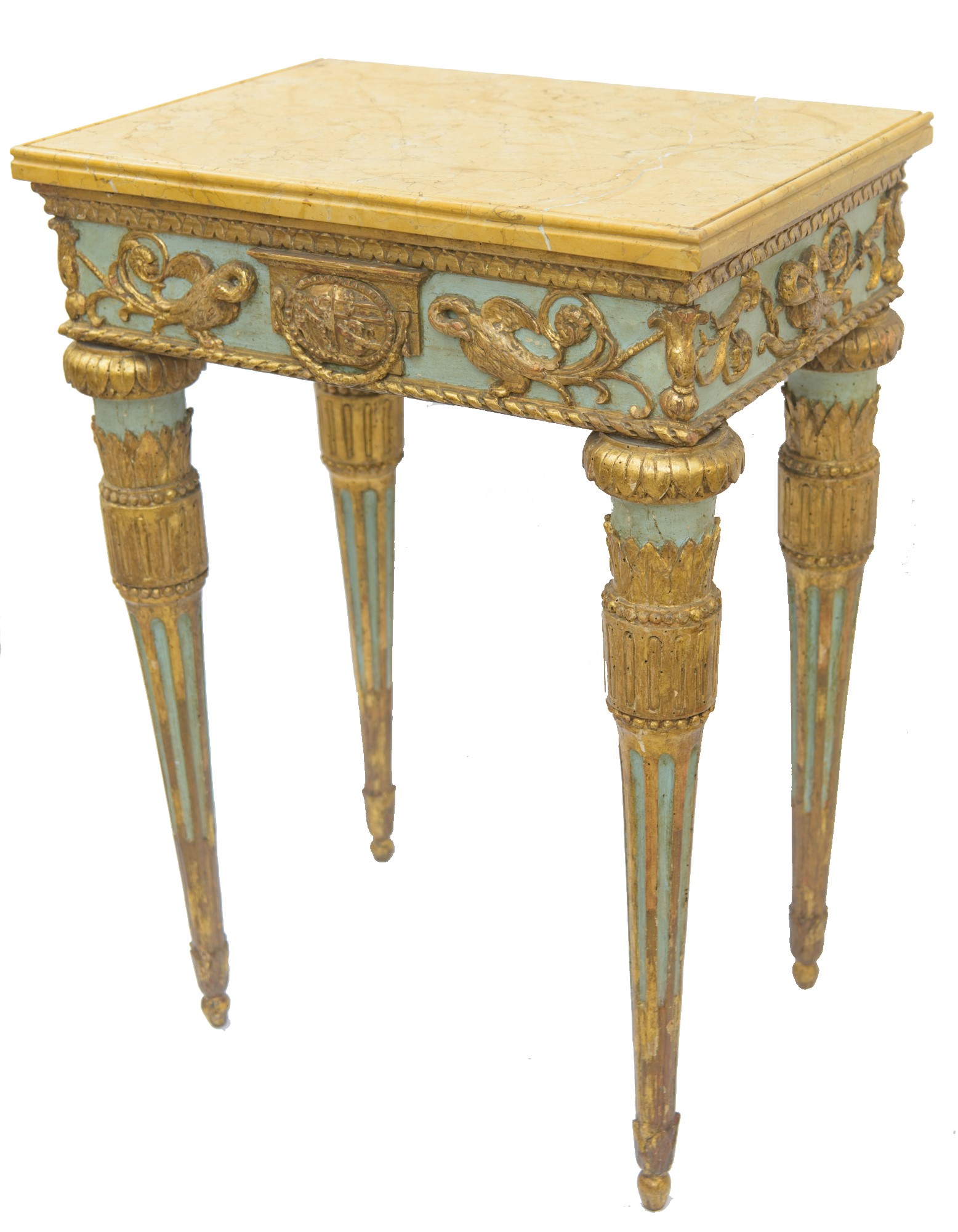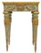 In legno finemente intagliato, dorato e parzialmente laccato a fondo verde acqua. Piano superiore in marmo giallo di Siena. Manifattura romana, periodo Luigi XVI. Restauri e mancanze.